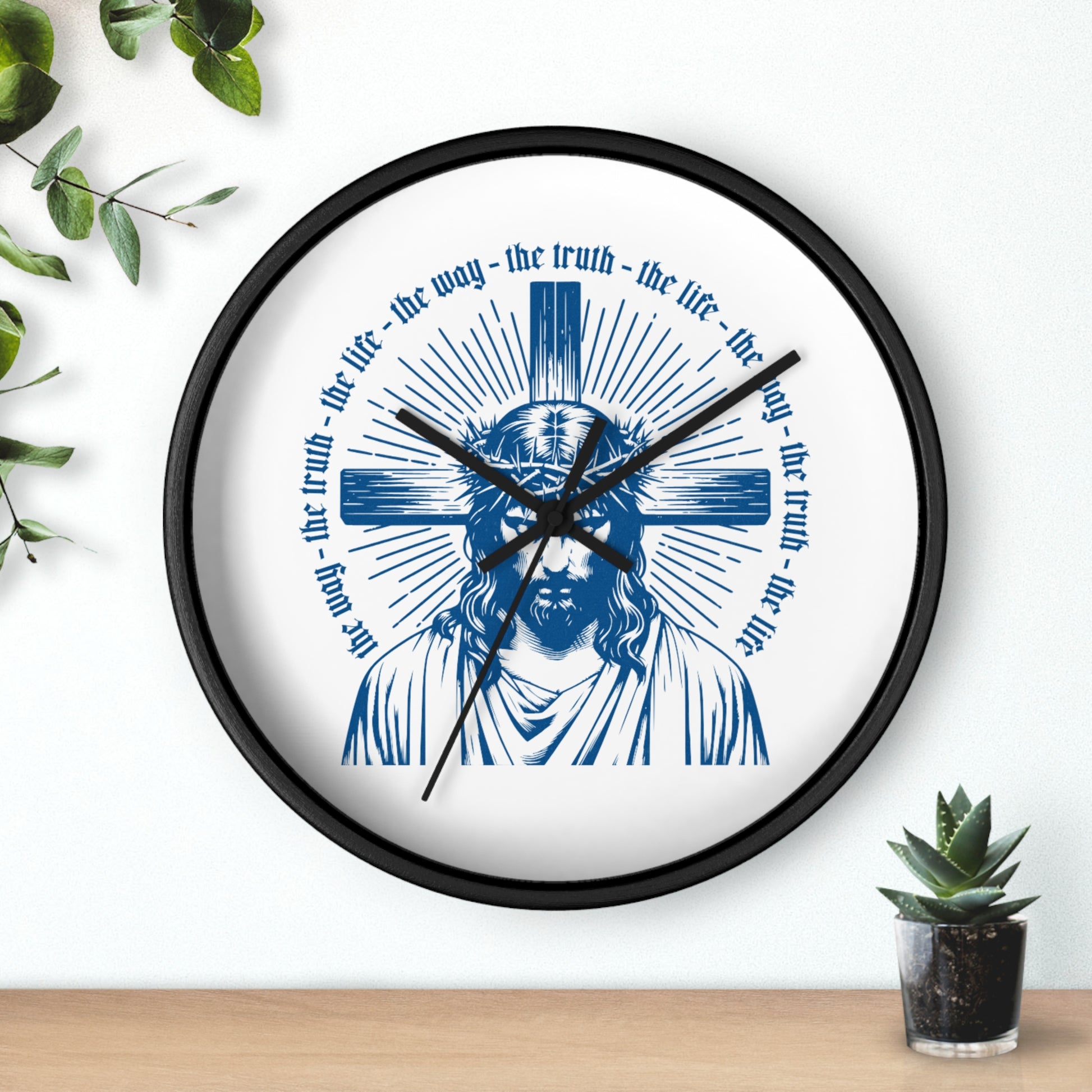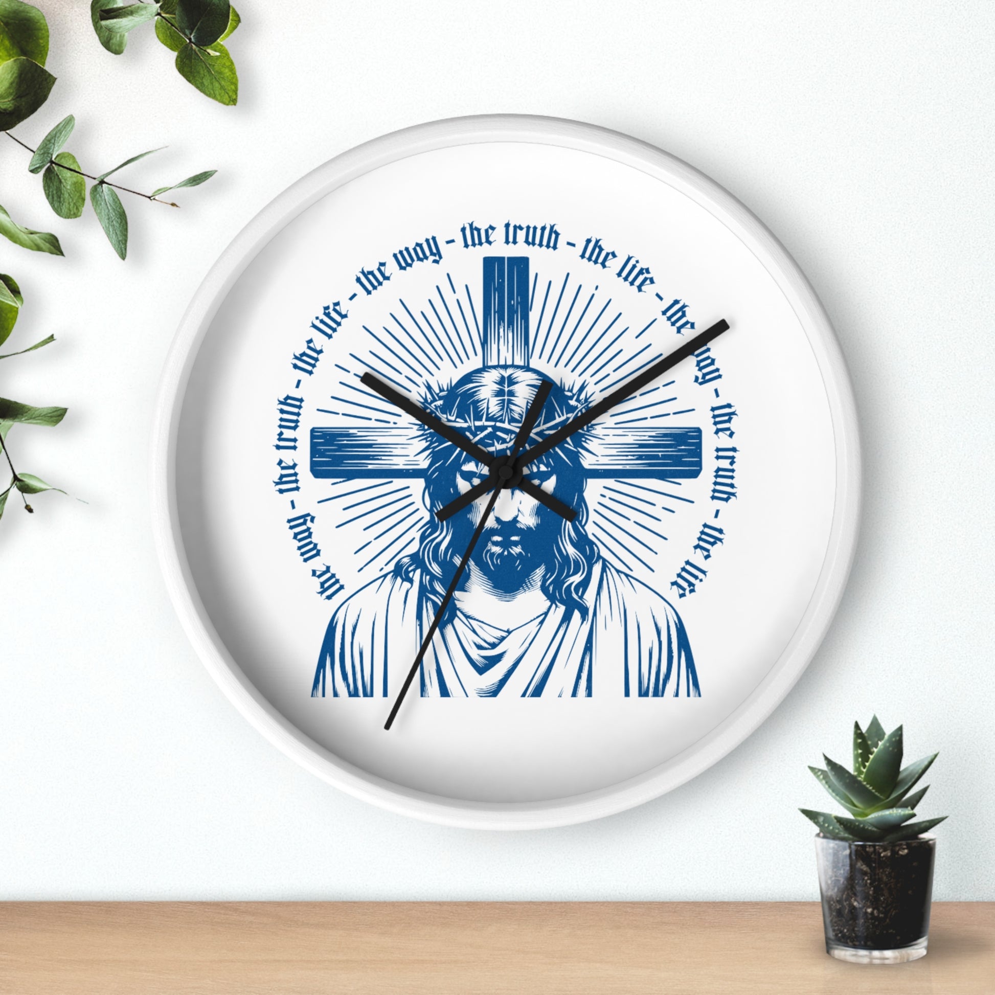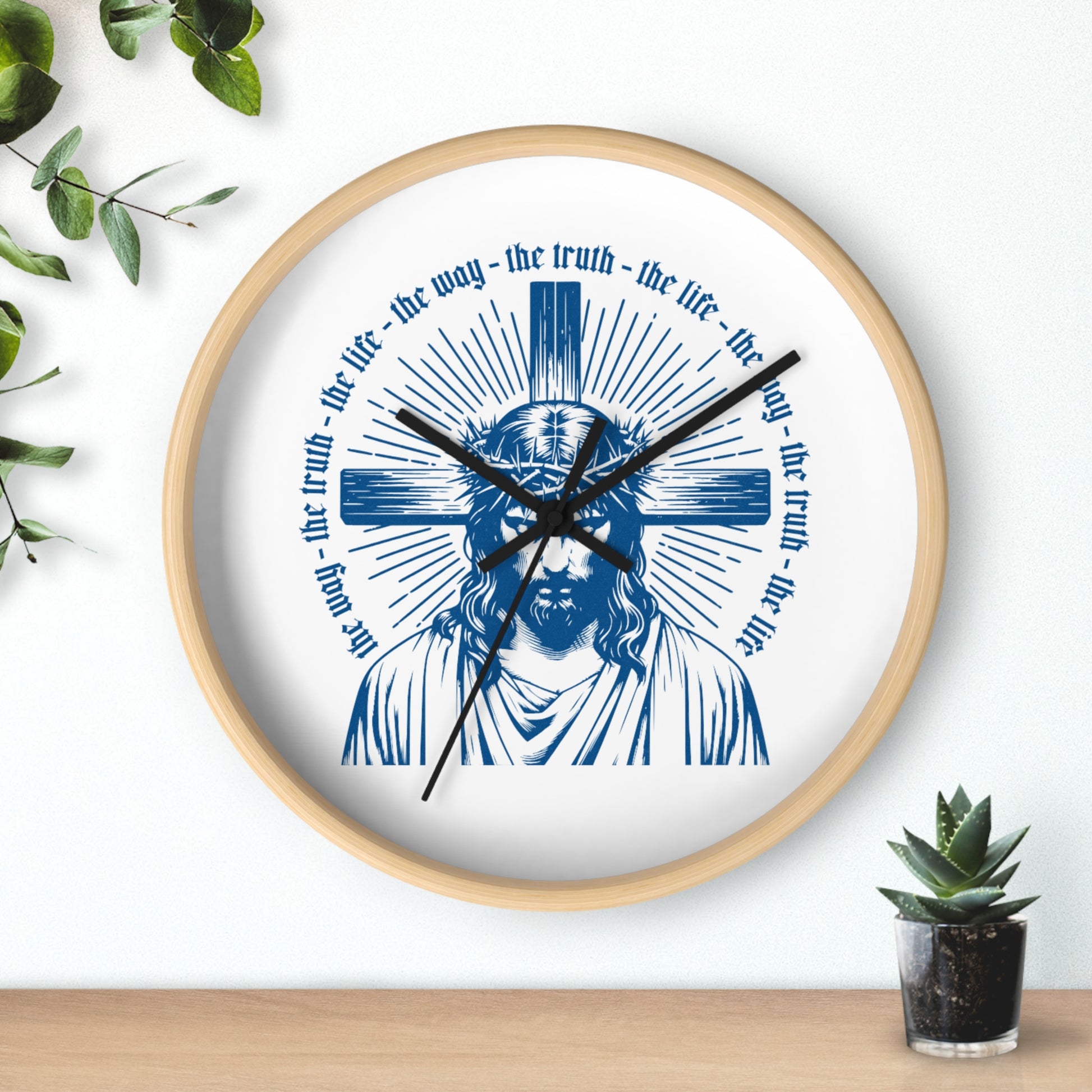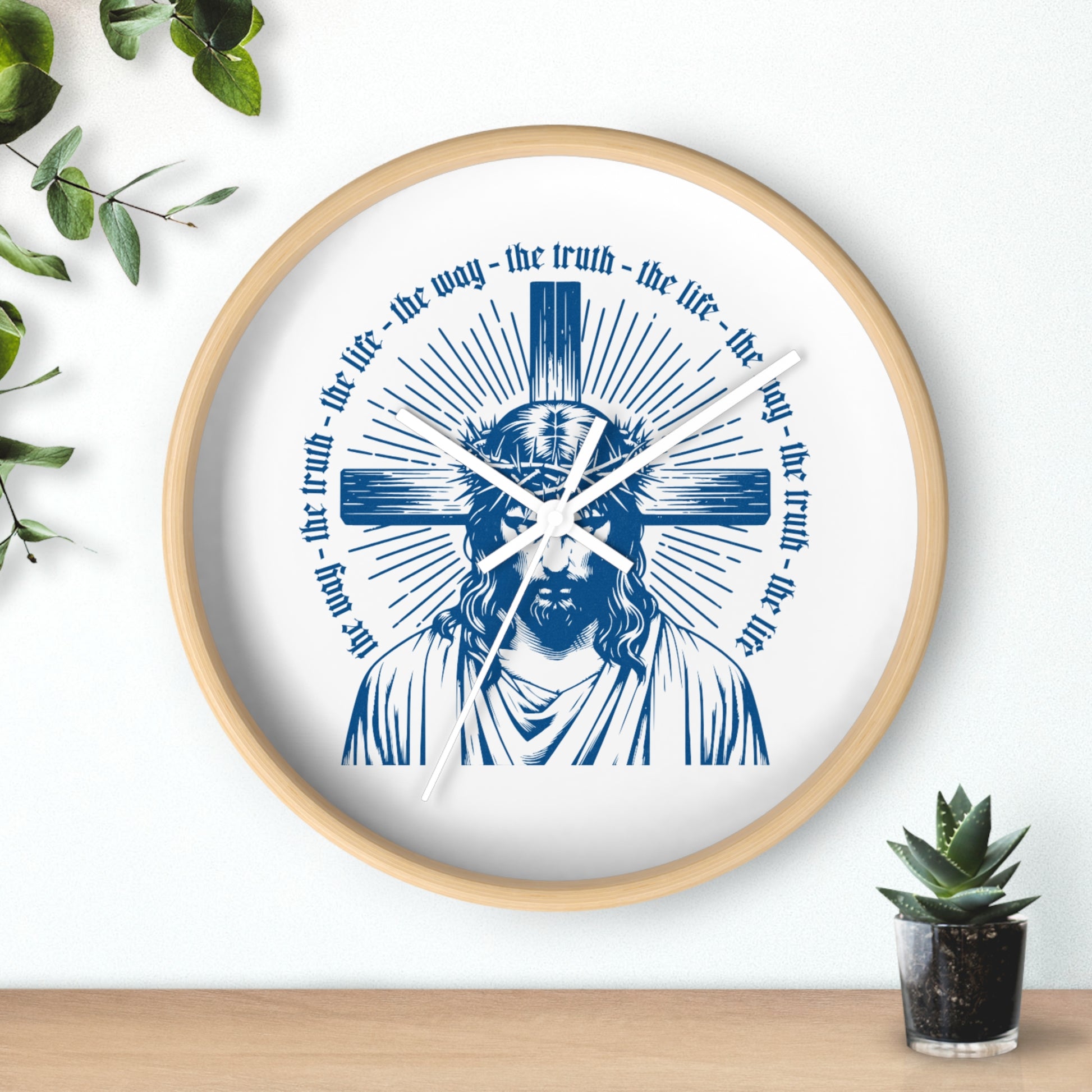 Bring timeless faith into your home with this beautifully designed Christian Wall Clock, featuring an inspiring image of Jesus Christ with a radiant cross and the powerful words: “The Way, The Truth, The Life.”