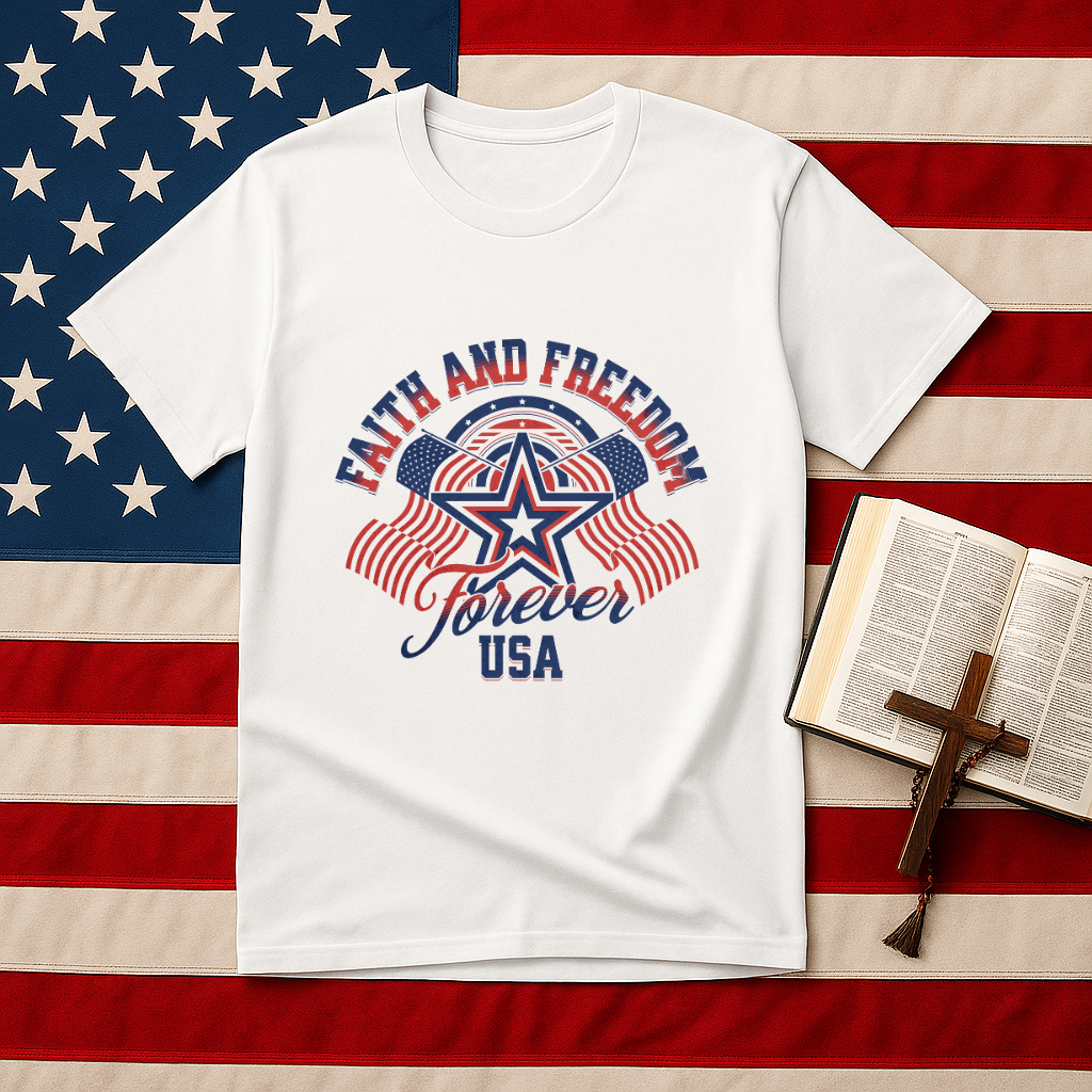 The Faith and Freedom Forever USA T-Shirt lets you carry both your Christian faith and American pride wherever you go. It’s a celebration of freedom rooted in belief, a symbol of loyalty to the USA, and a tribute to the enduring message of Jesus and the Bible.