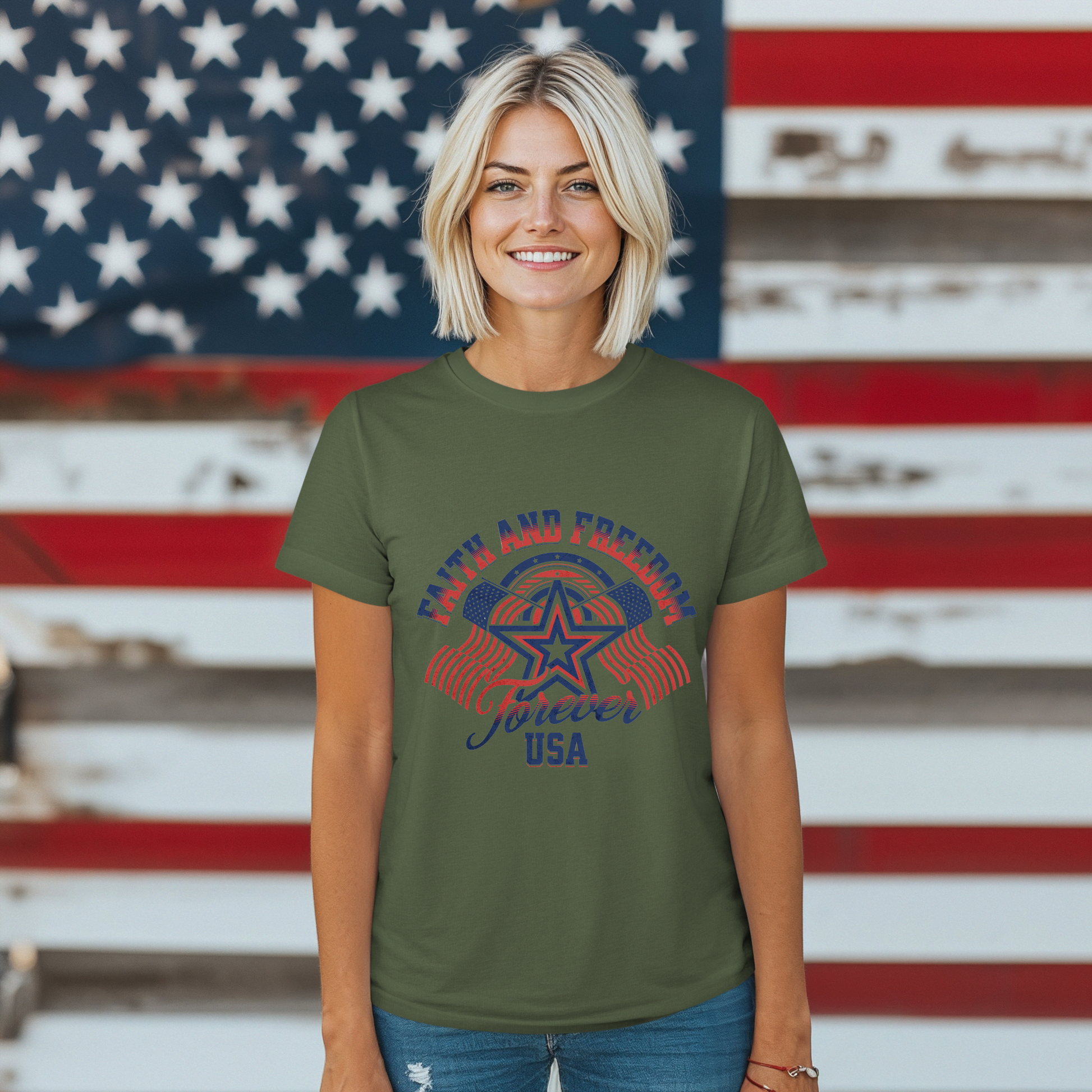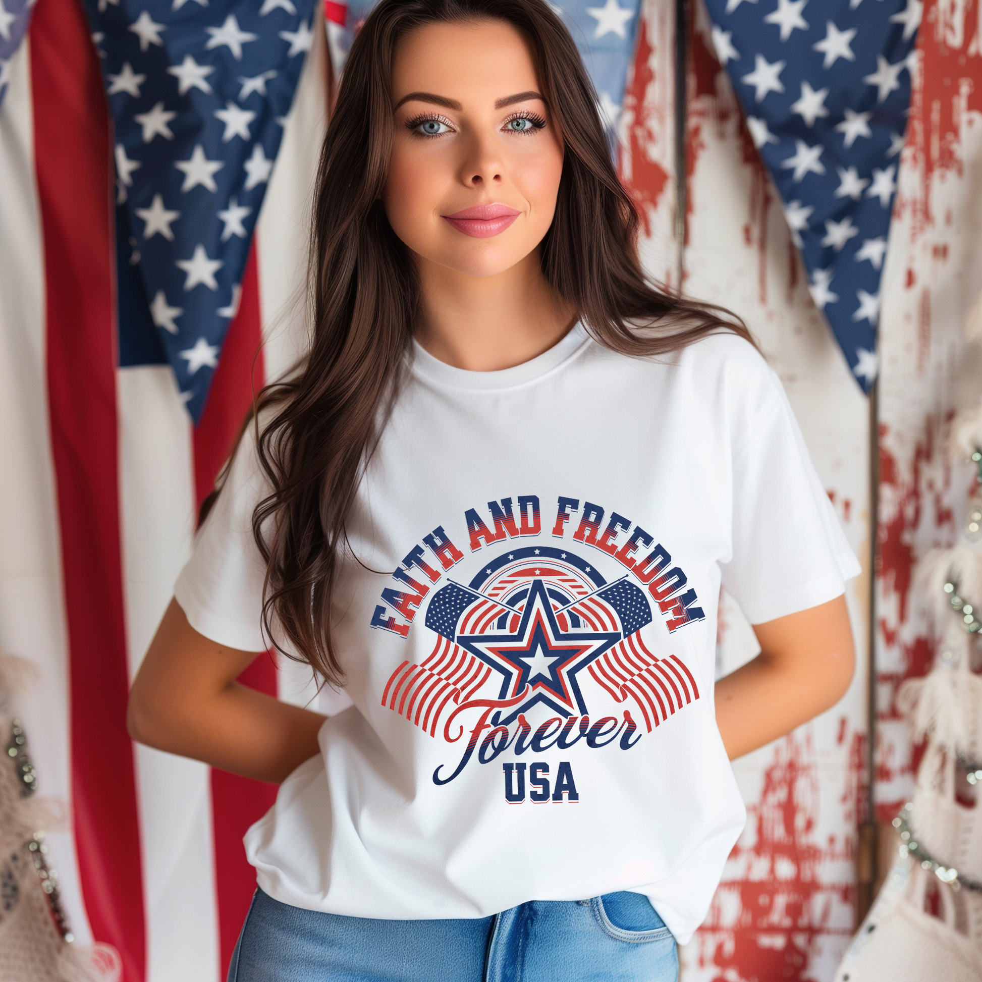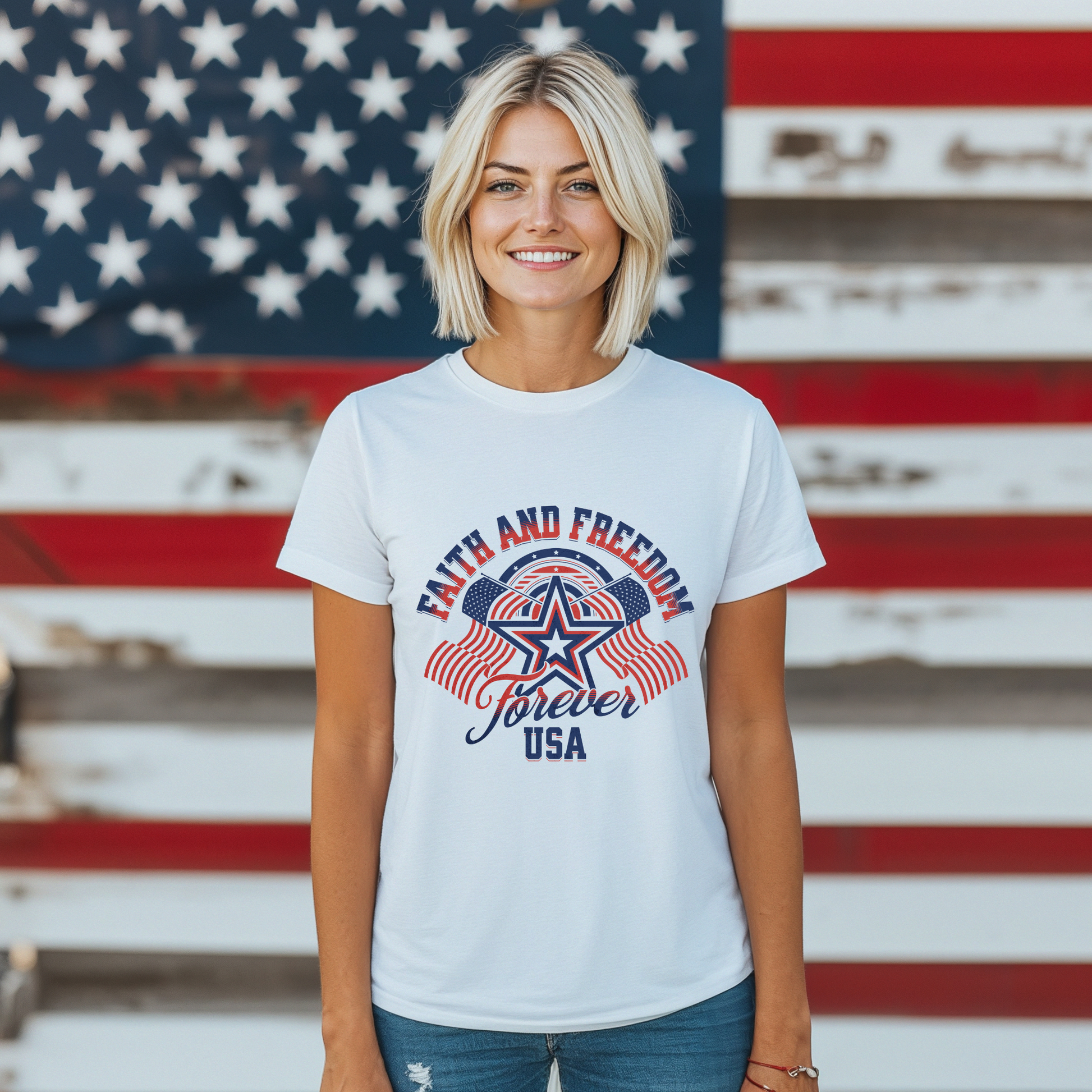 - Bold “Faith and Freedom Forever USA” graphic with patriotic colors