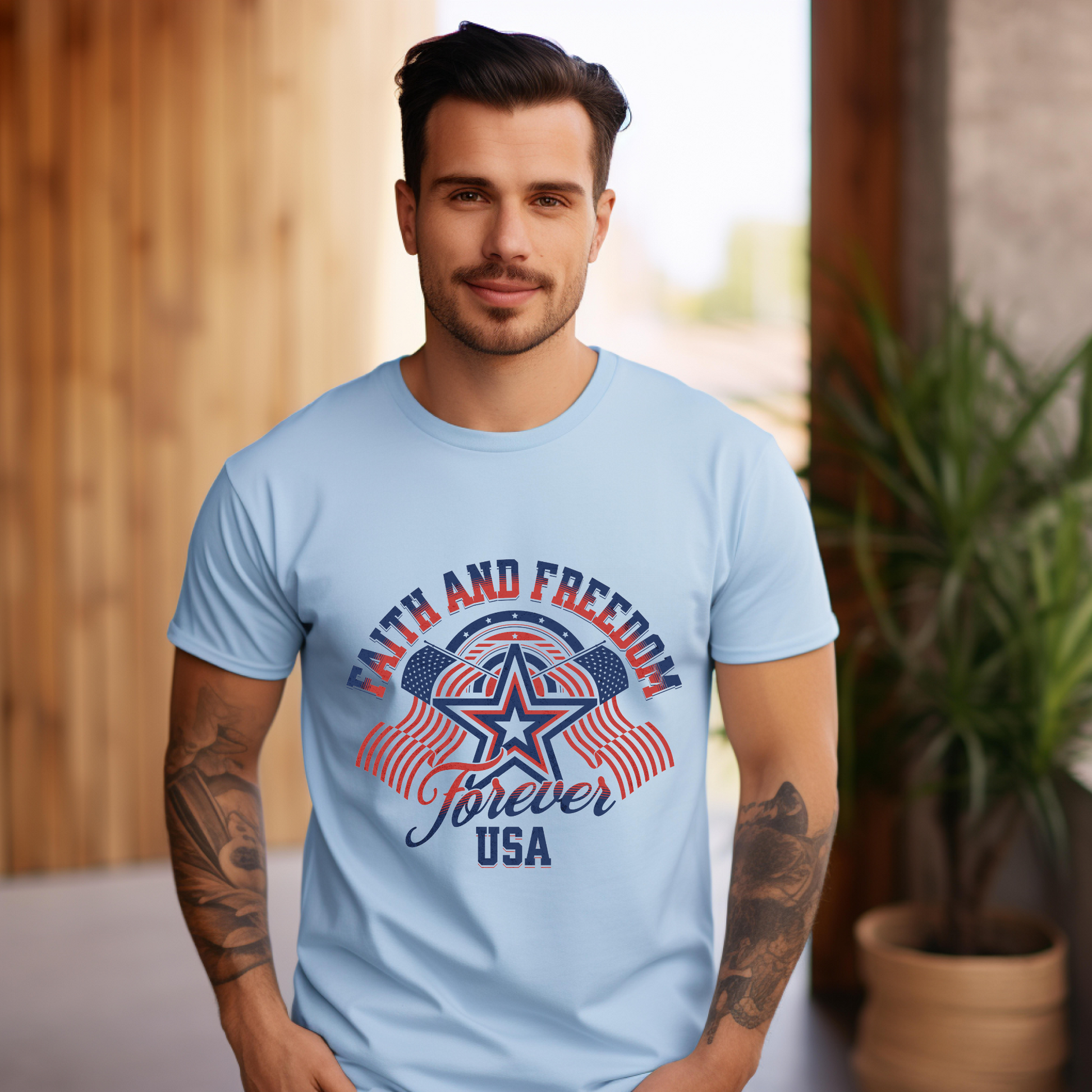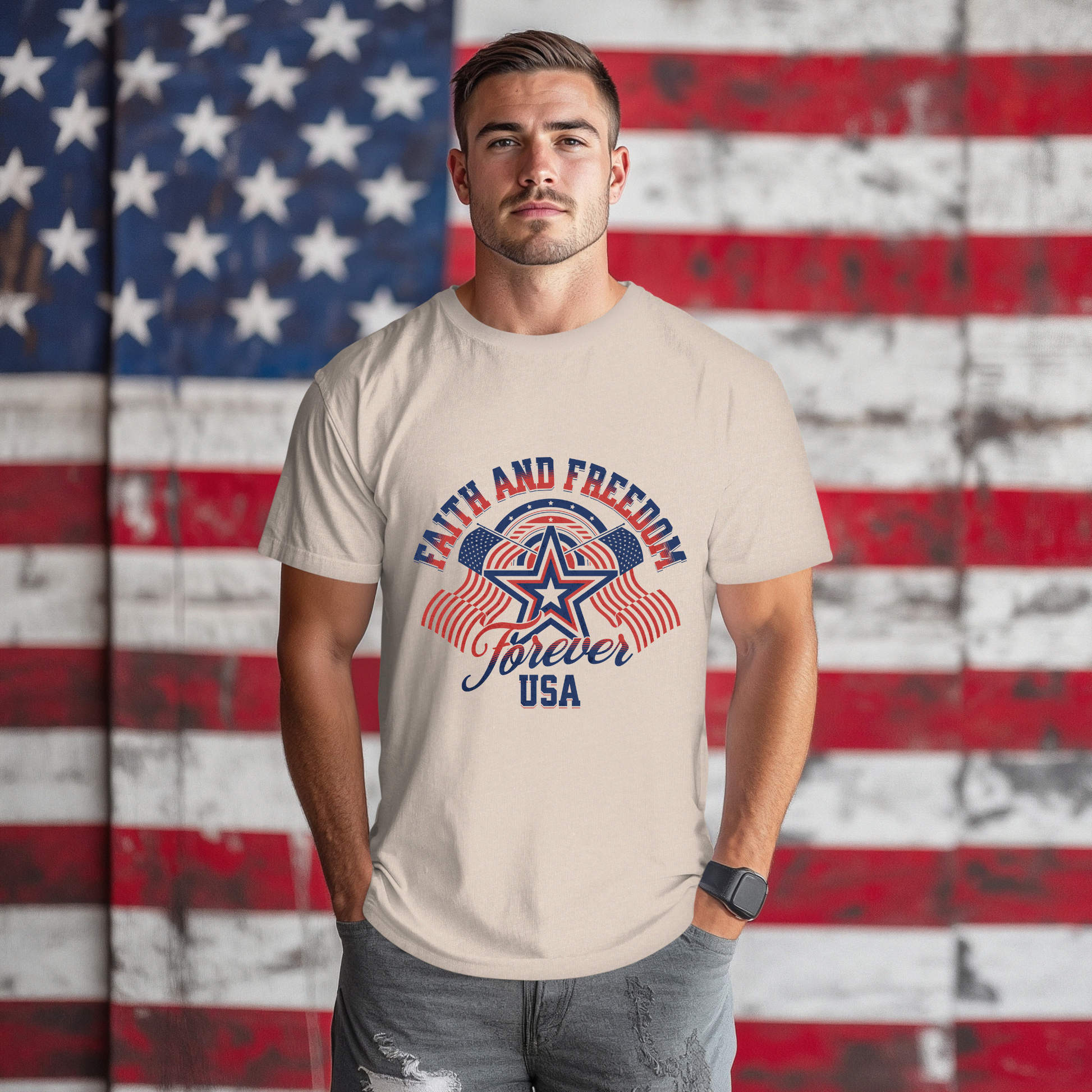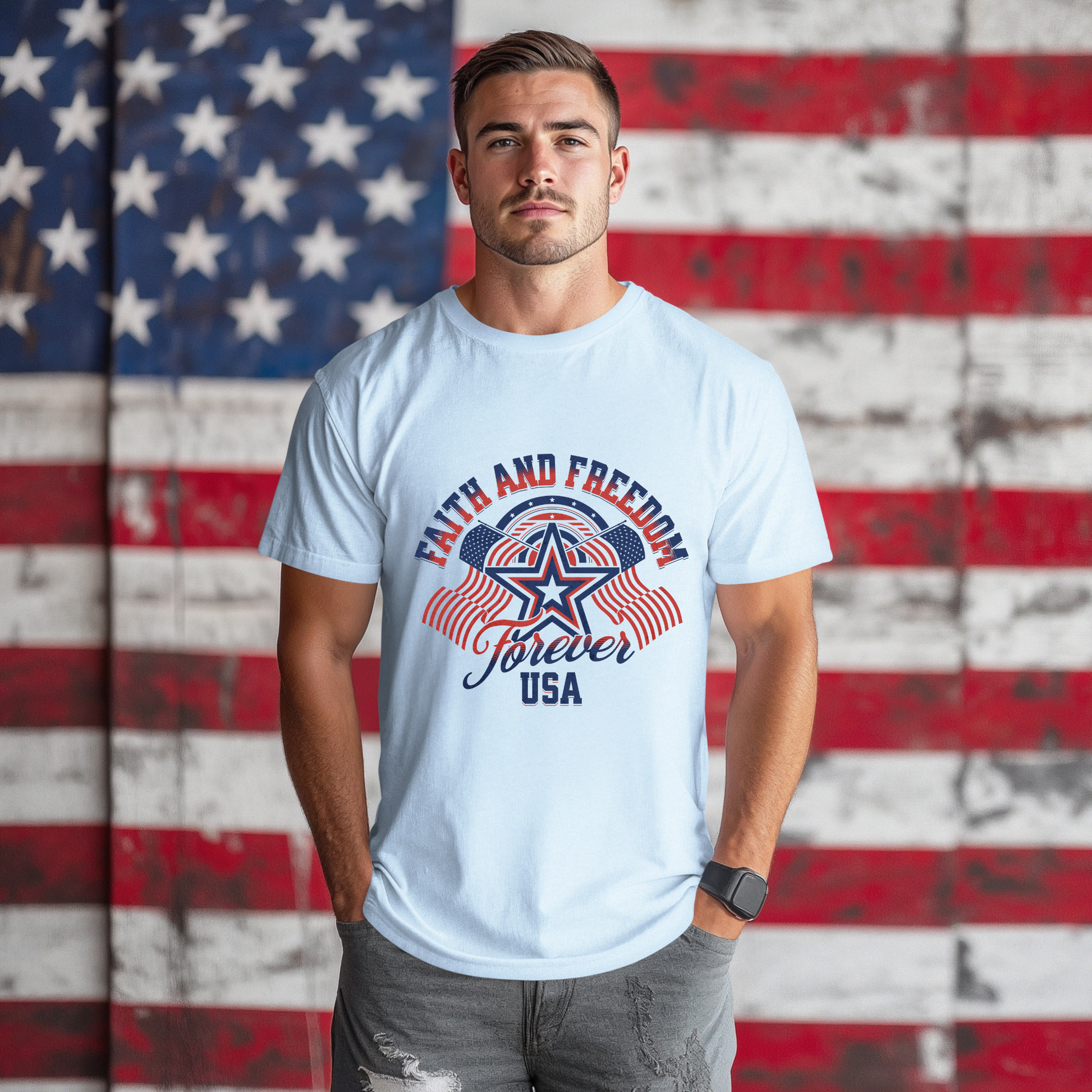 - Bold “Faith and Freedom Forever USA” graphic with patriotic colors