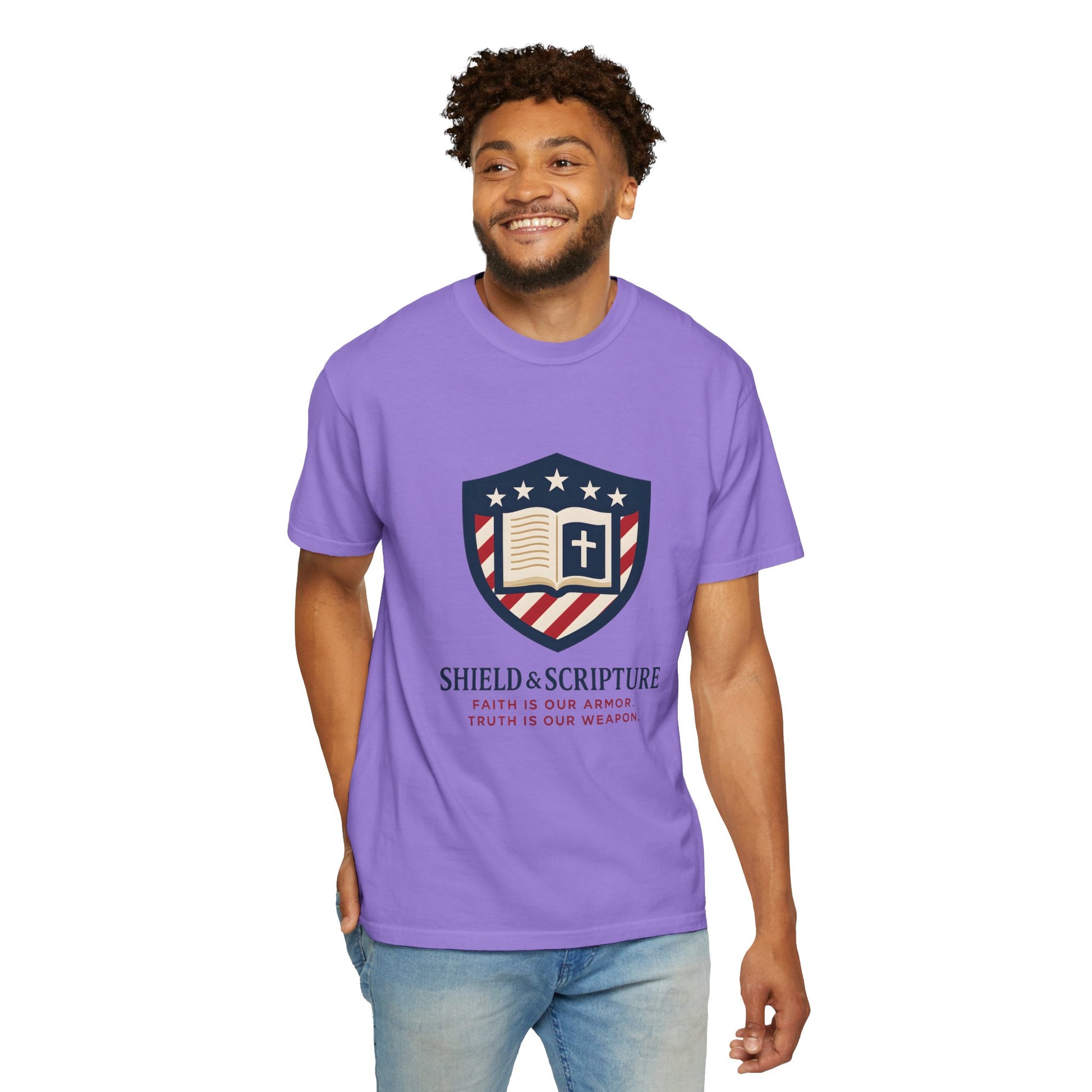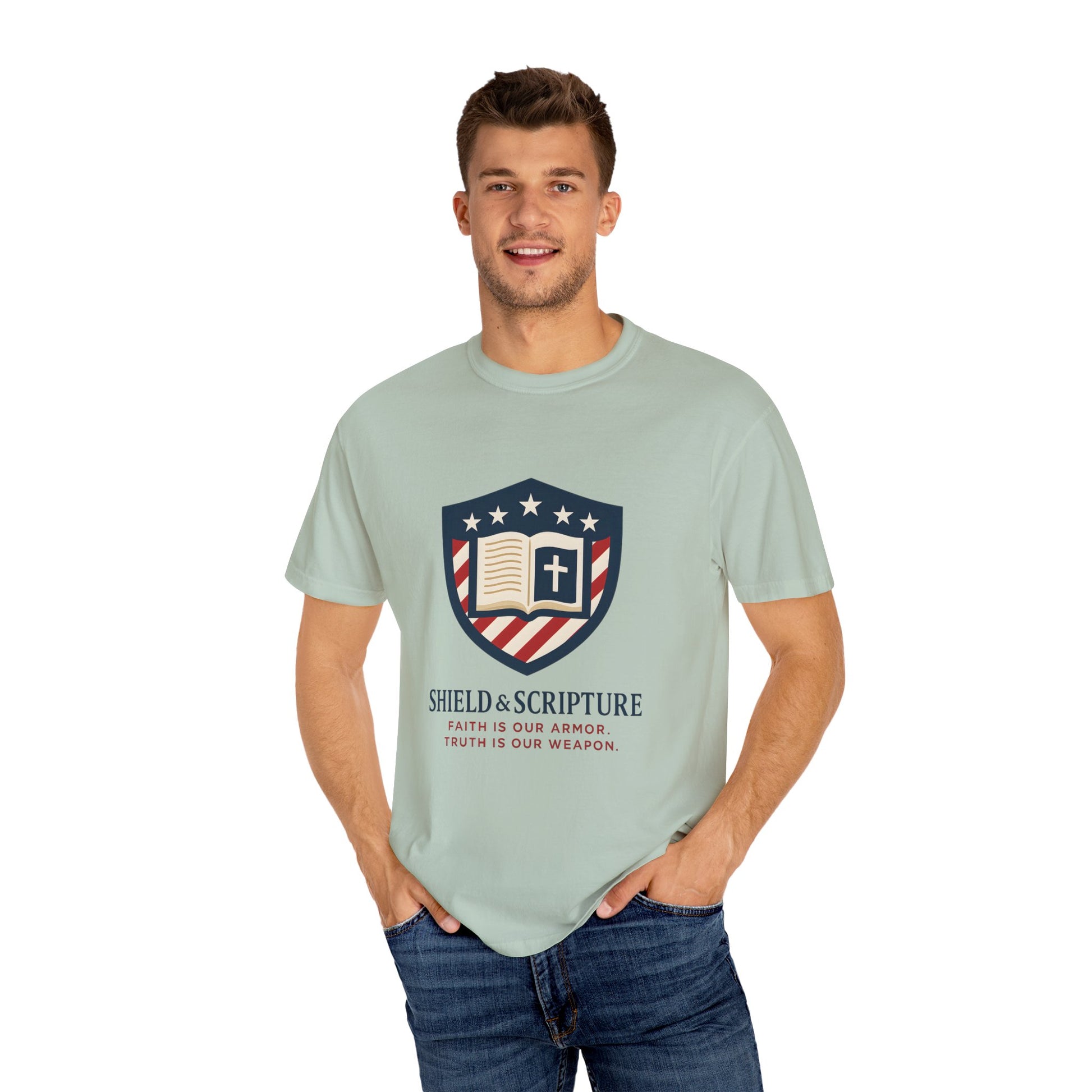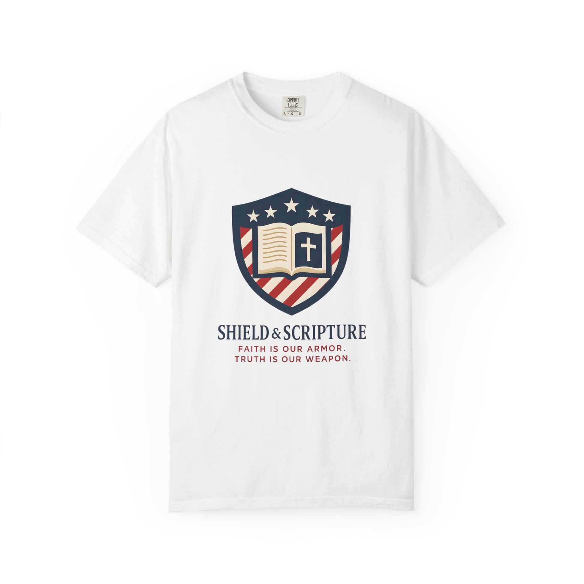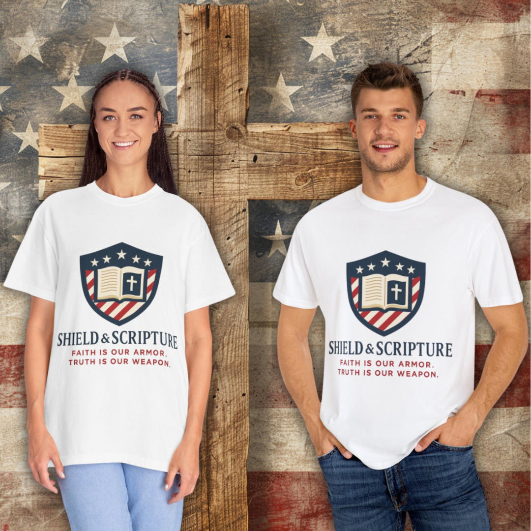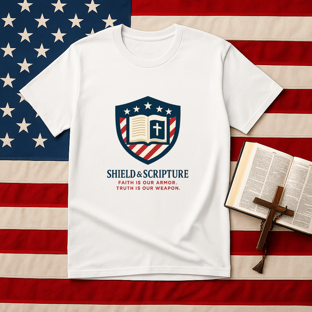 Wear your convictions loud and clear with the Shield & Scripture T-Shirt | Jesus Shield Design featuring the powerful Jesus Shield design. This patriotic tee blends bold American pride with unwavering Christian values, making it the perfect choice for men who live by faith and stand for truth.