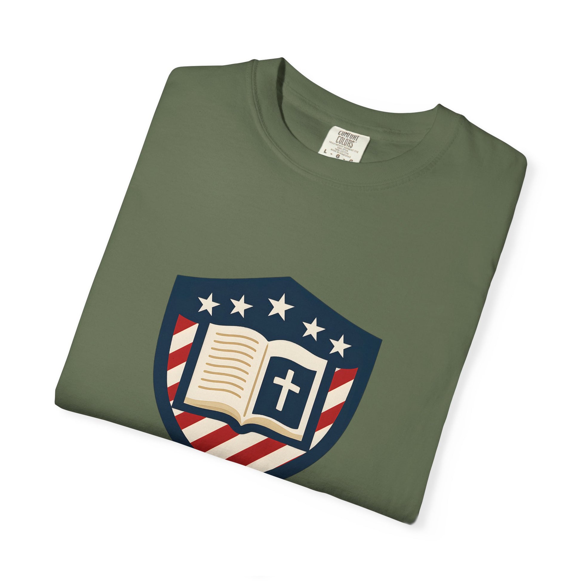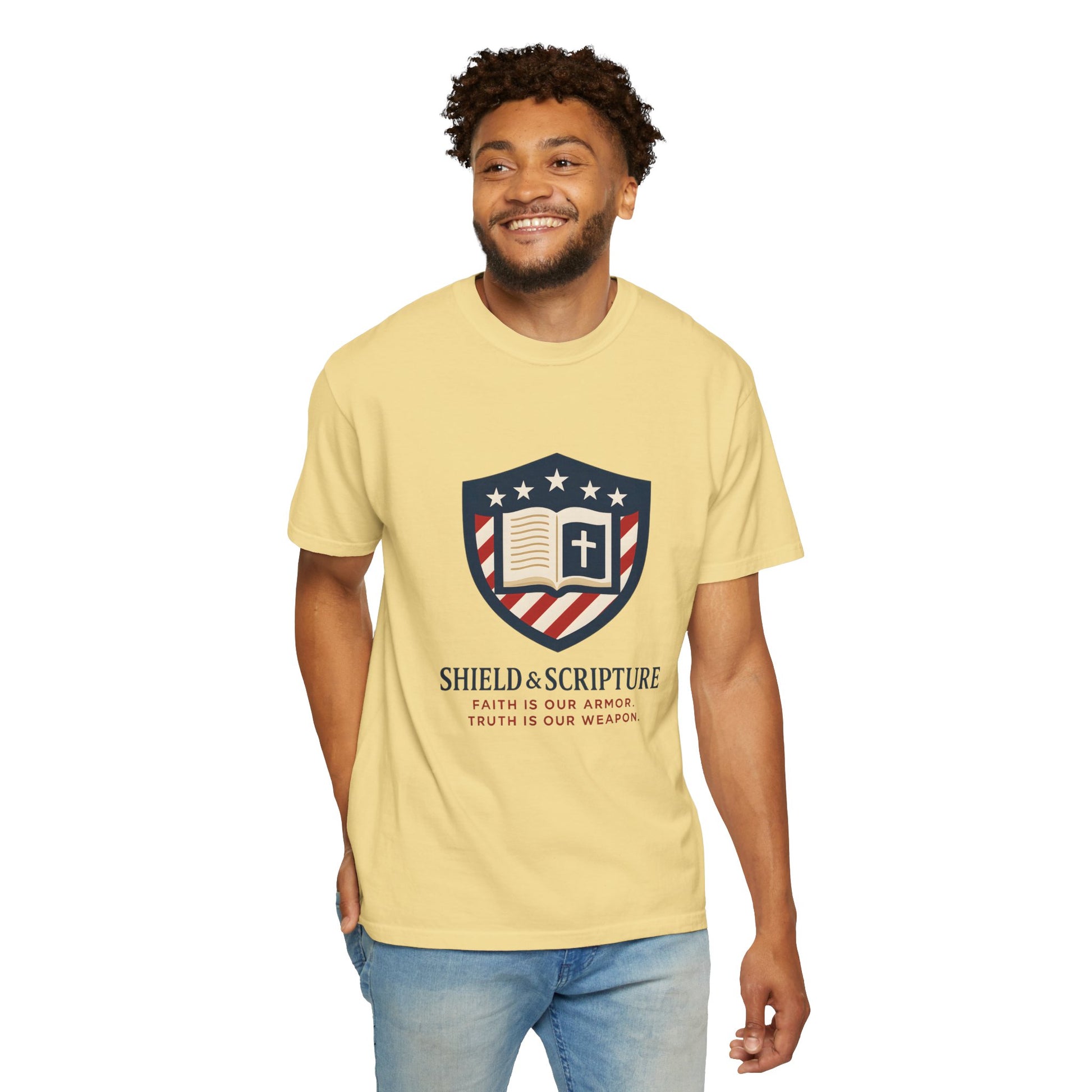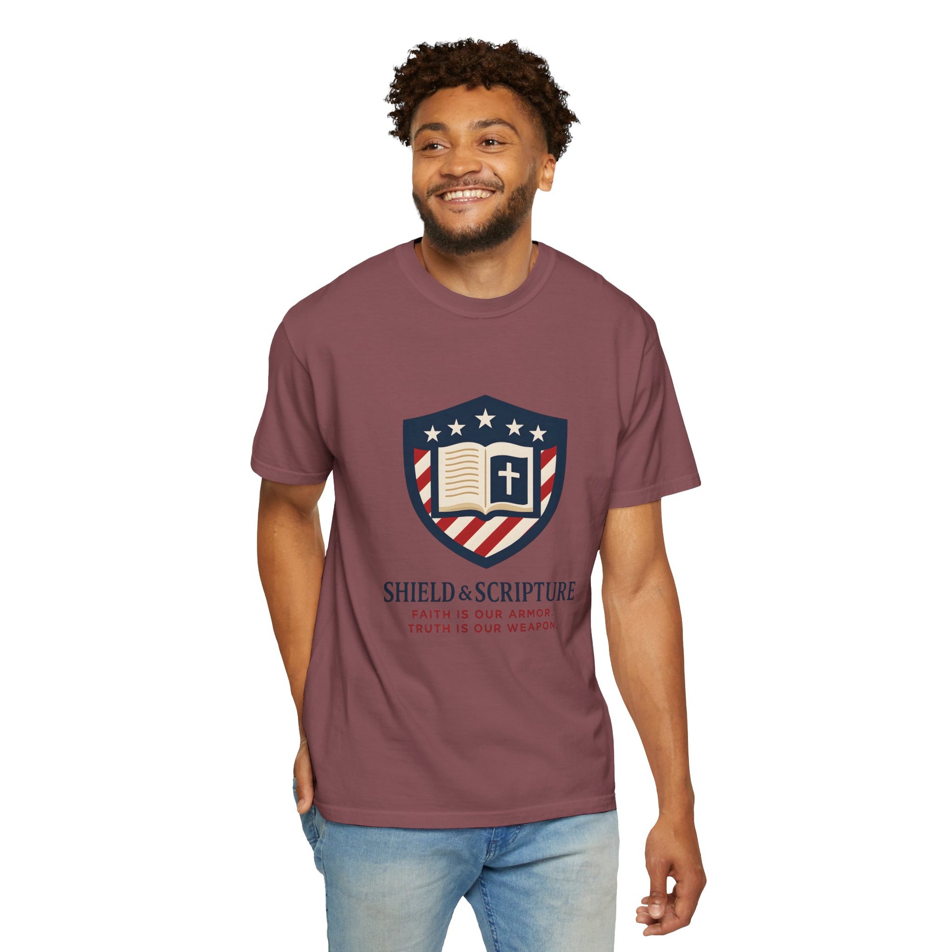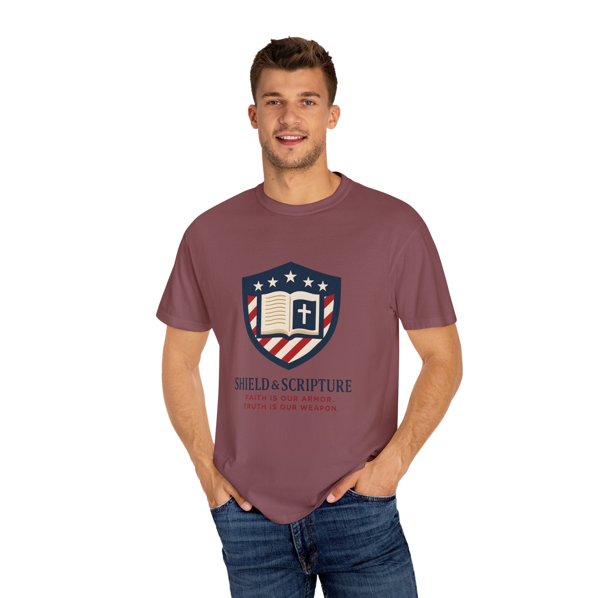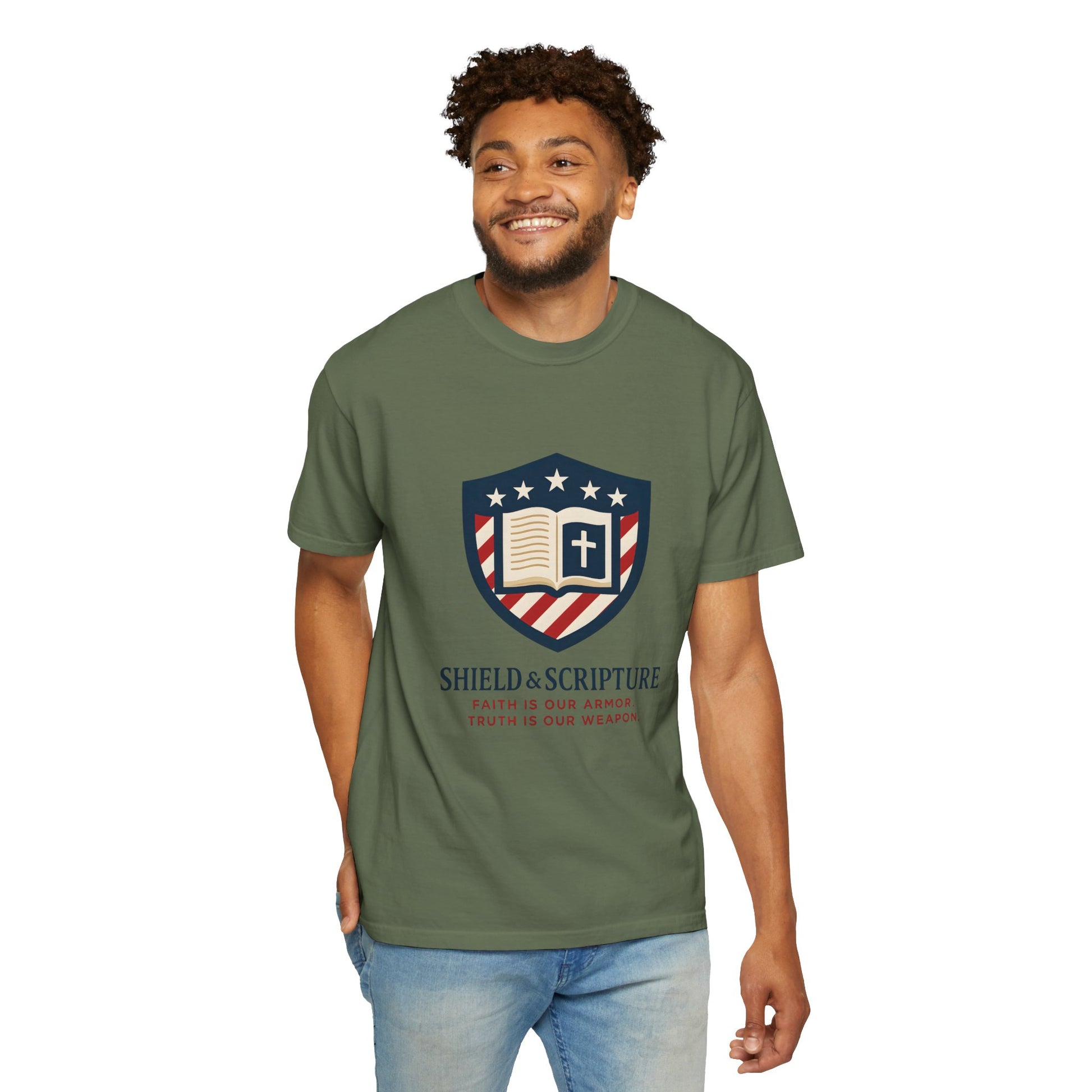 Wear your convictions loud and clear with the Shield & Scripture T-Shirt | Jesus Shield Design featuring the powerful Jesus Shield design. This patriotic tee blends bold American pride with unwavering Christian values, making it the perfect choice for men who live by faith and stand for truth.