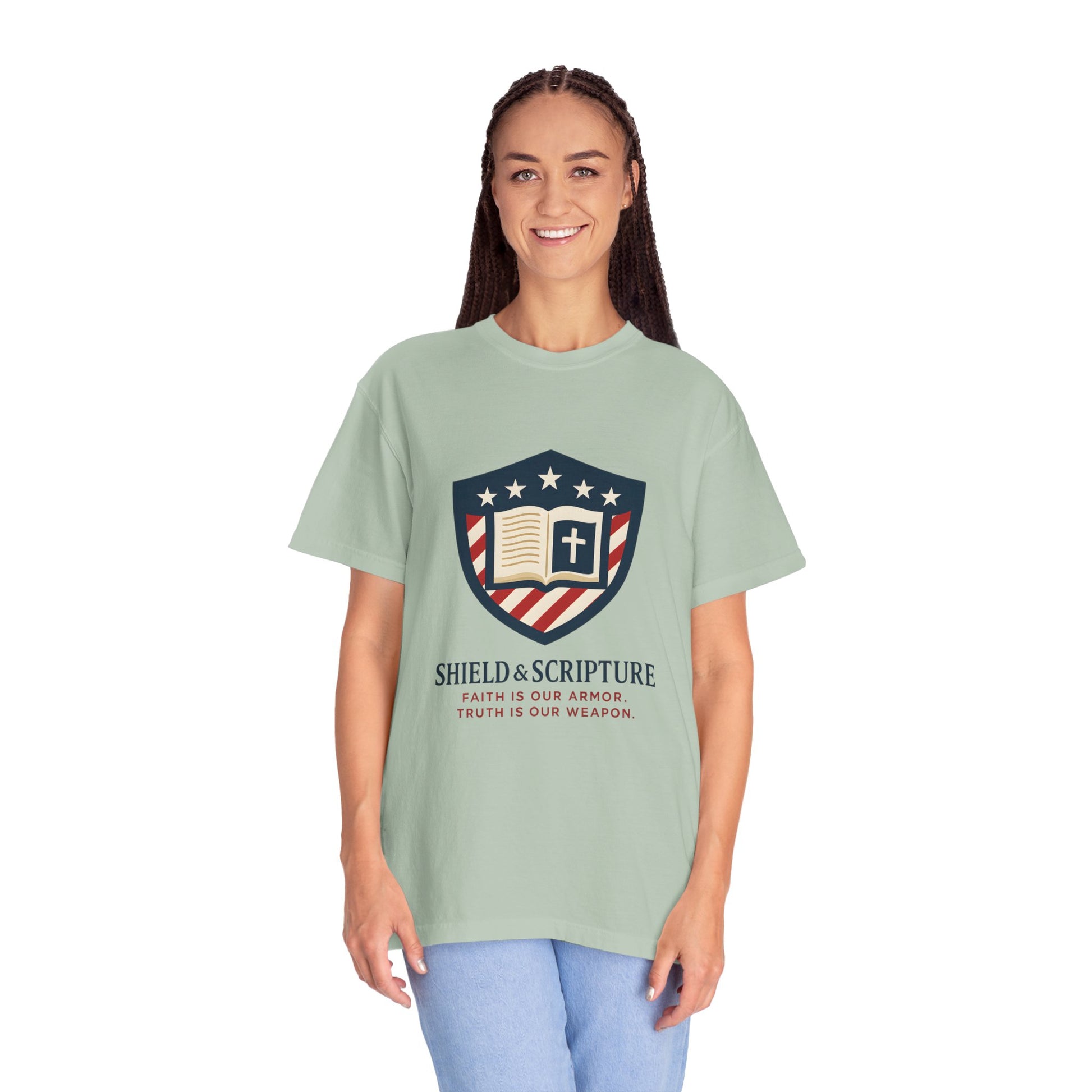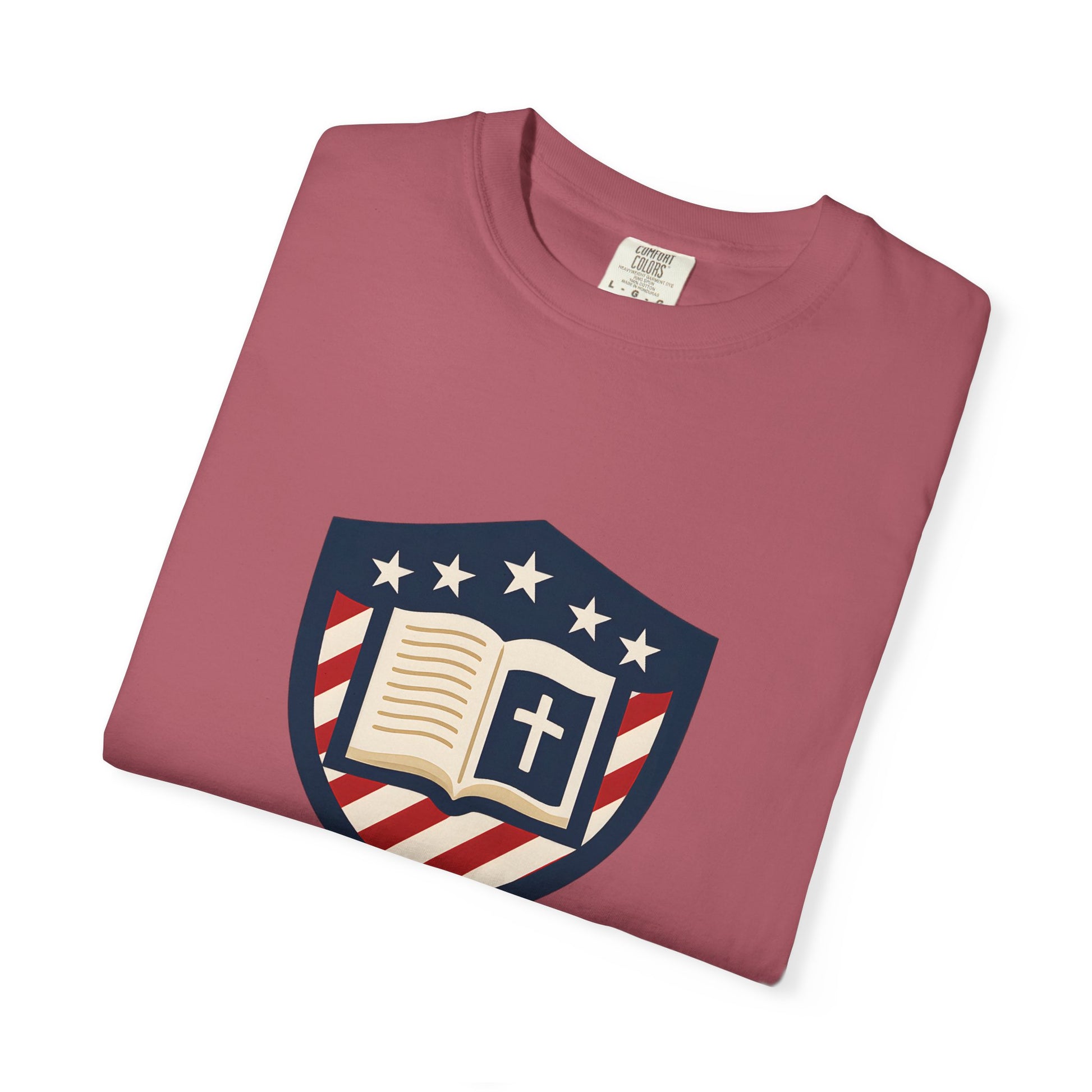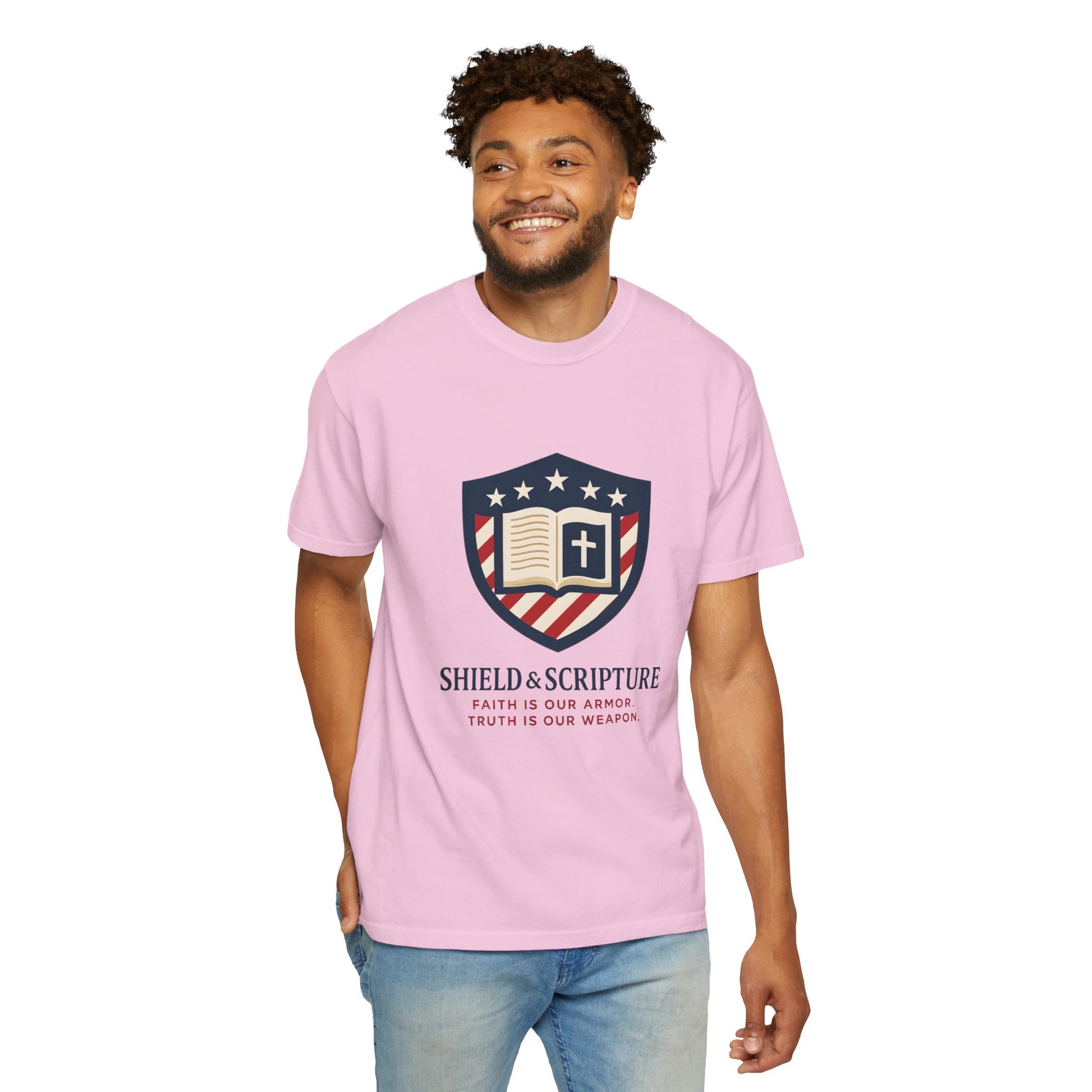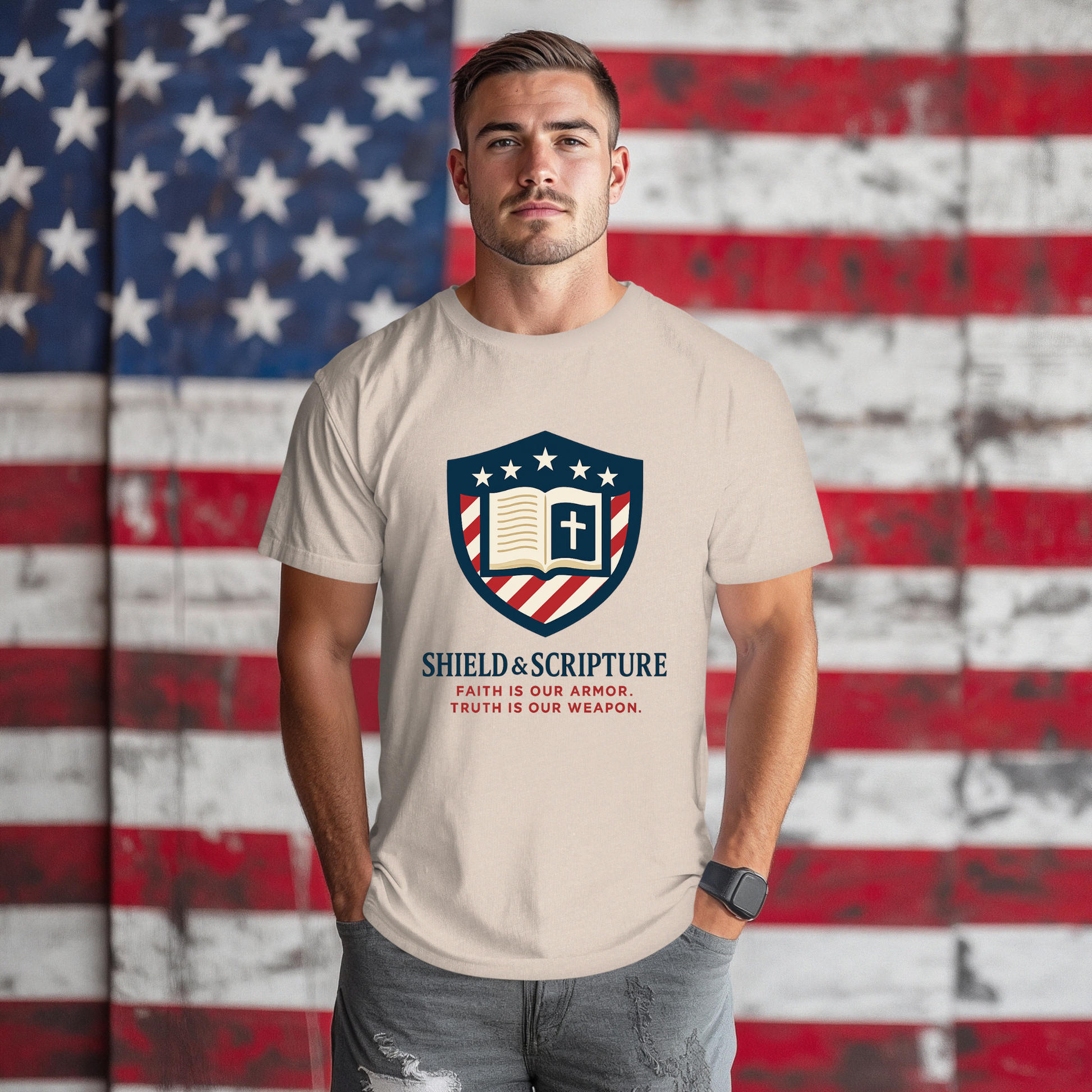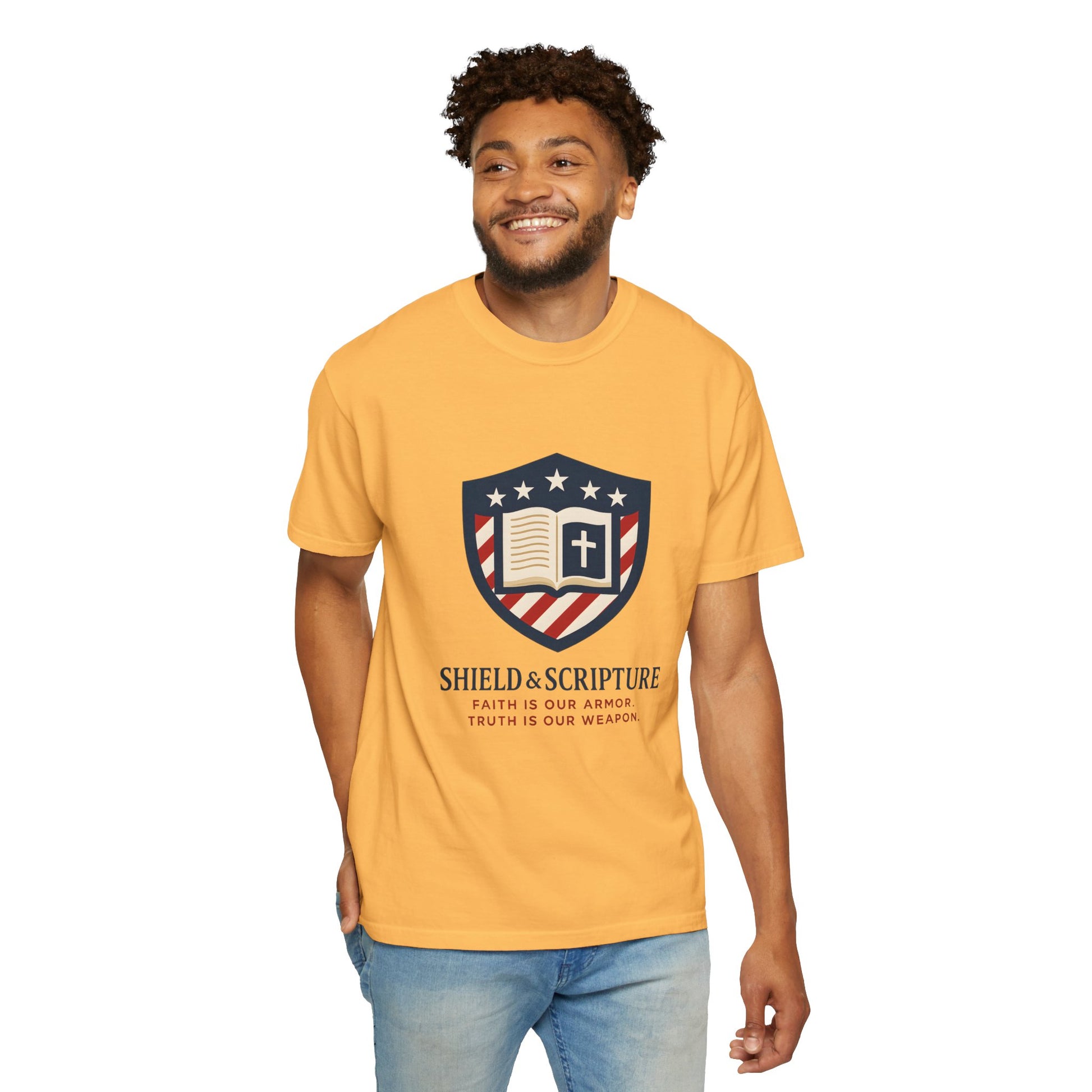 Wear your convictions loud and clear with the Shield & Scripture T-Shirt | Jesus Shield Design featuring the powerful Jesus Shield design. This patriotic tee blends bold American pride with unwavering Christian values, making it the perfect choice for men who live by faith and stand for truth.