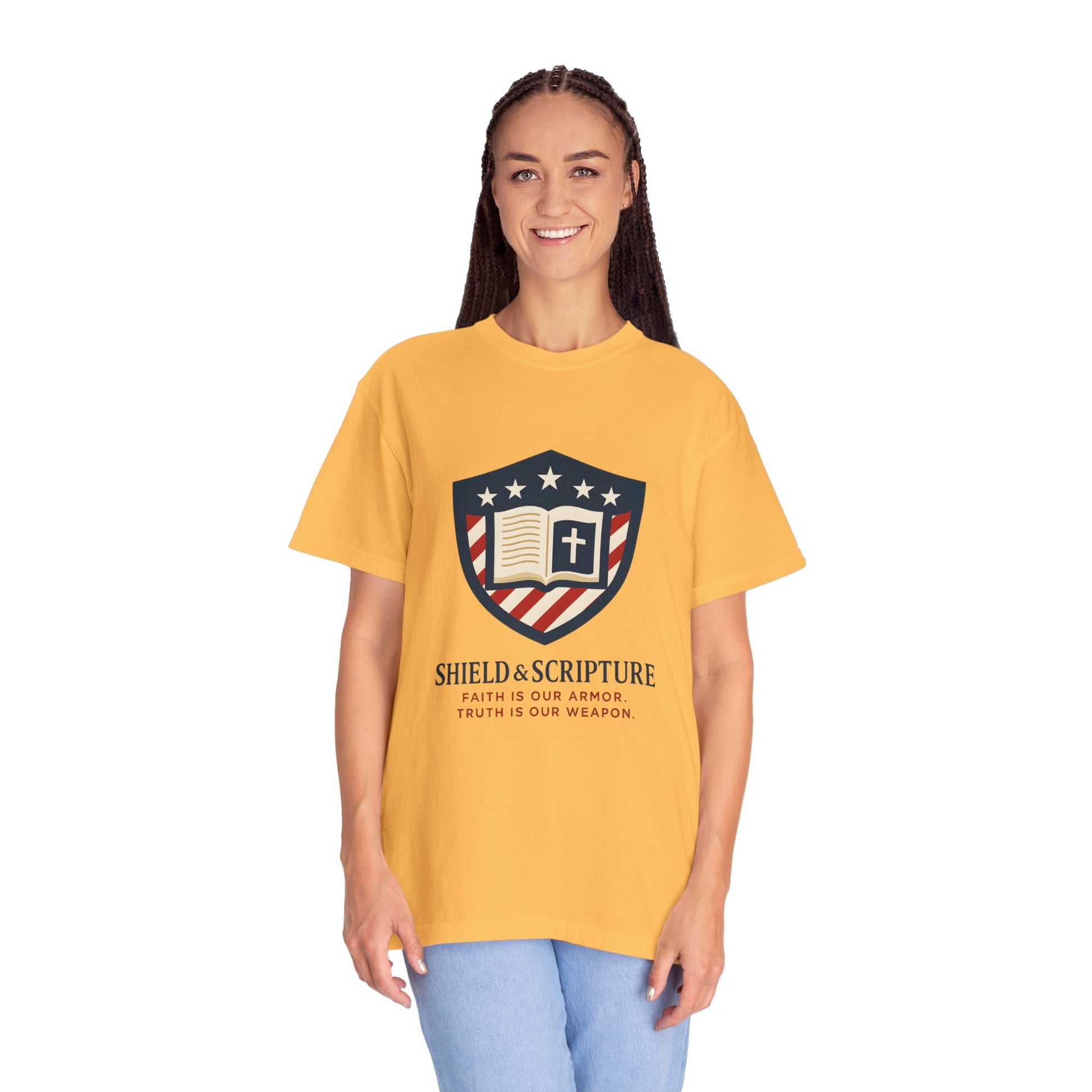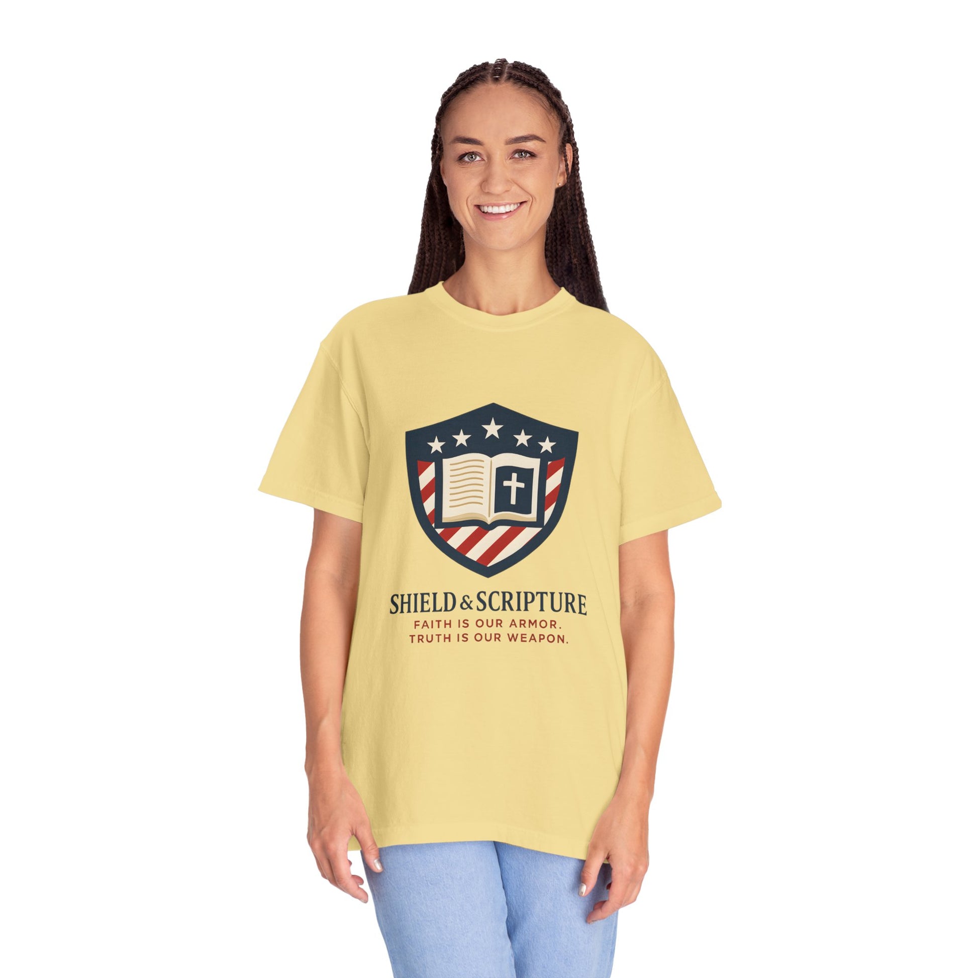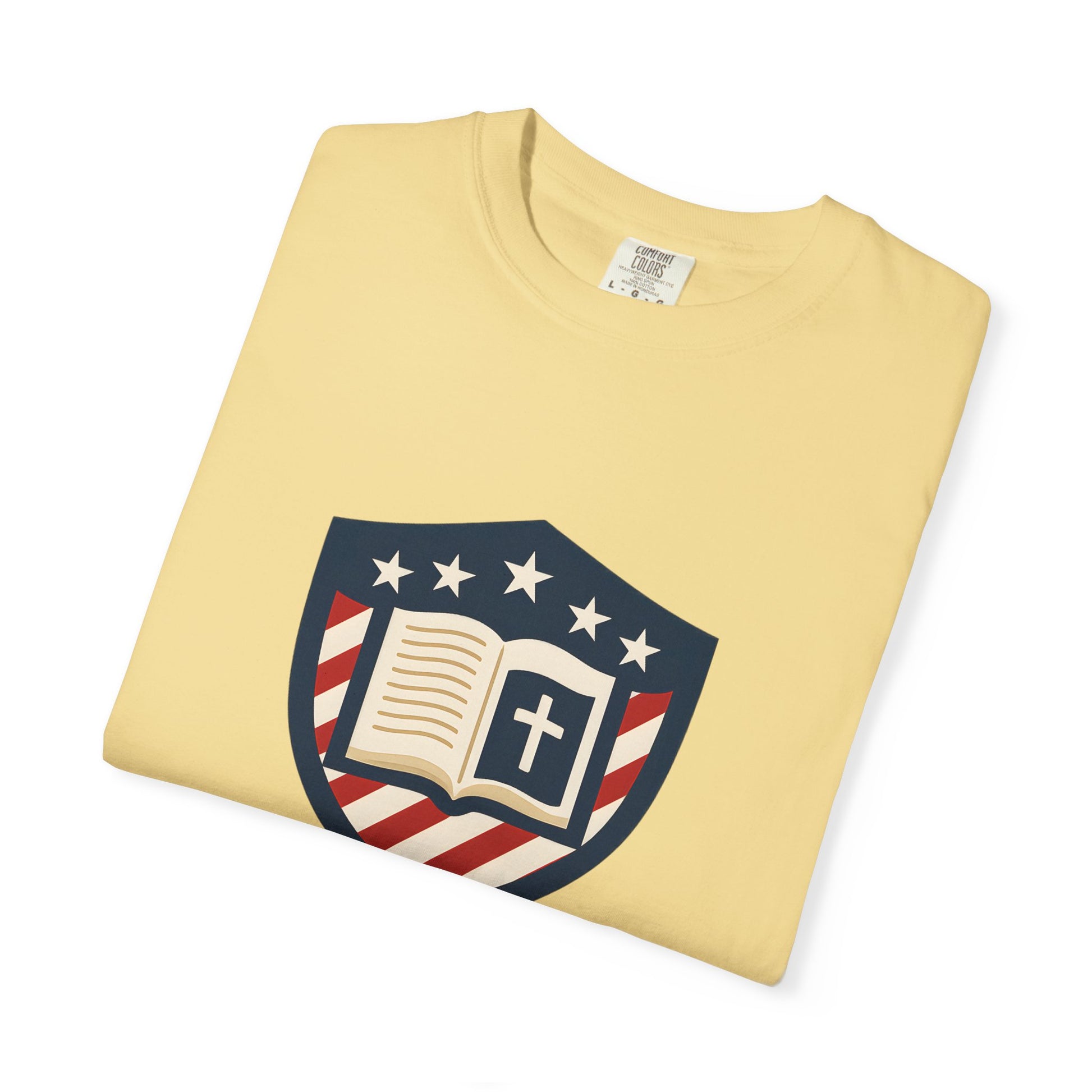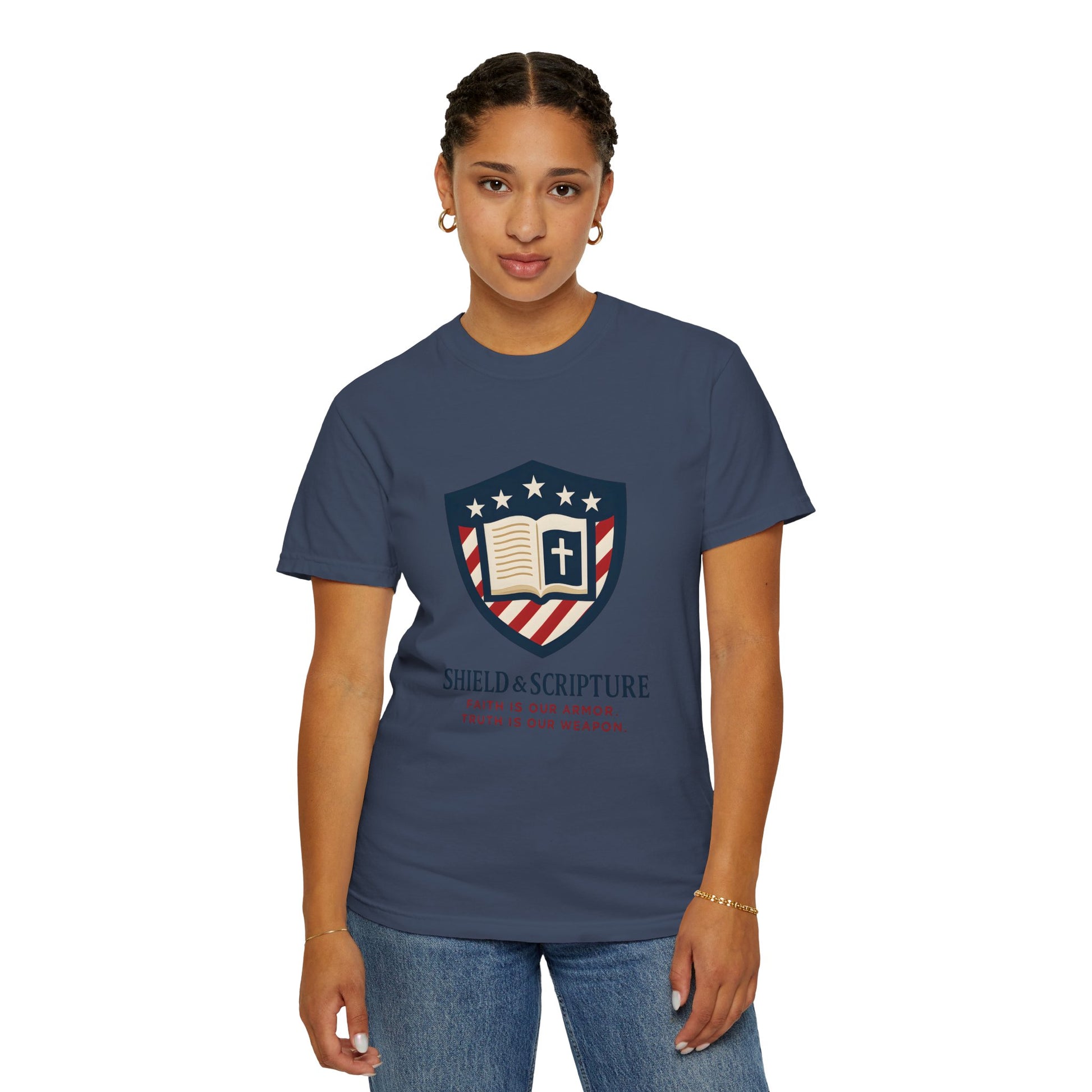 Wear your convictions loud and clear with the Shield & Scripture T-Shirt | Jesus Shield Design featuring the powerful Jesus Shield design. This patriotic tee blends bold American pride with unwavering Christian values, making it the perfect choice for men who live by faith and stand for truth.
