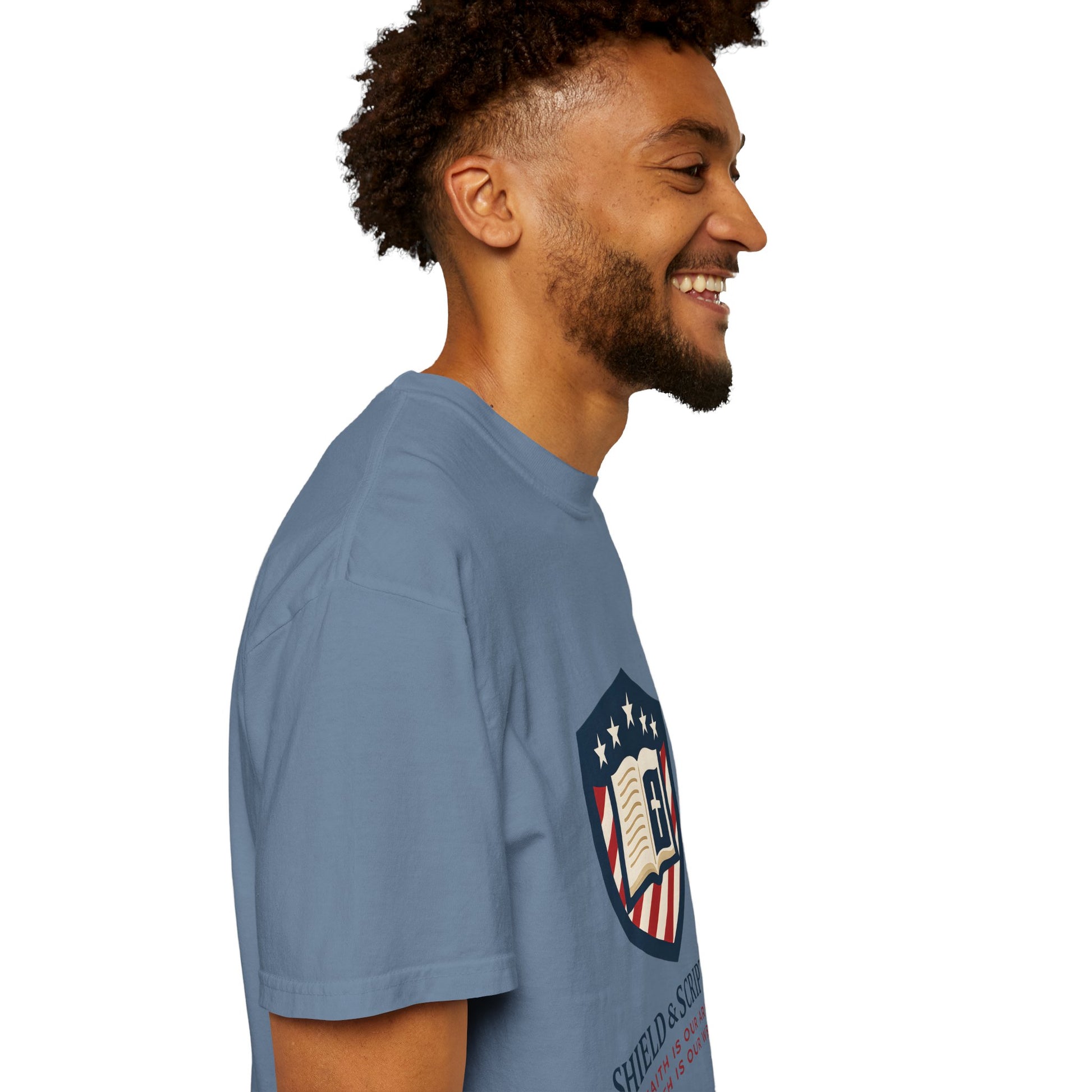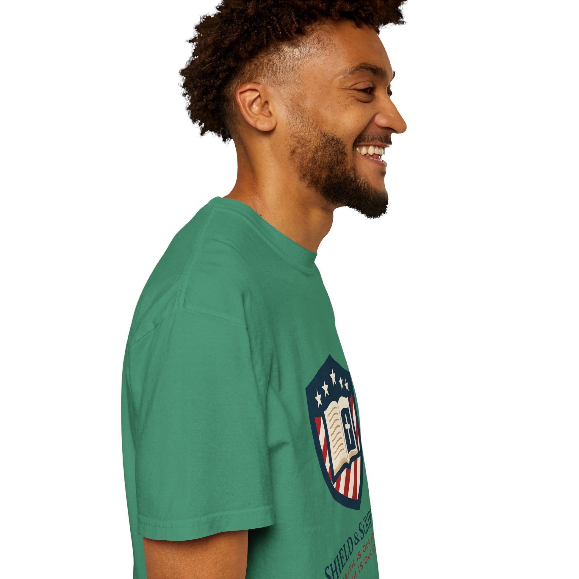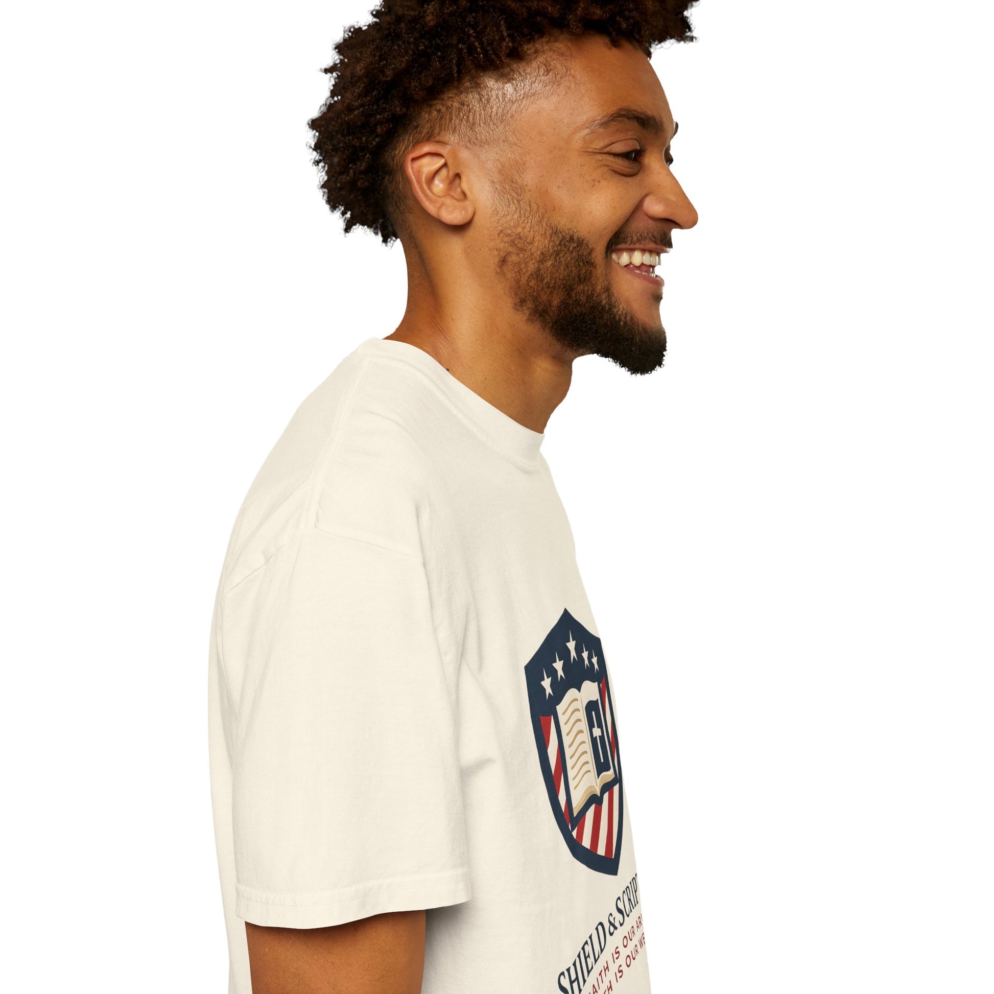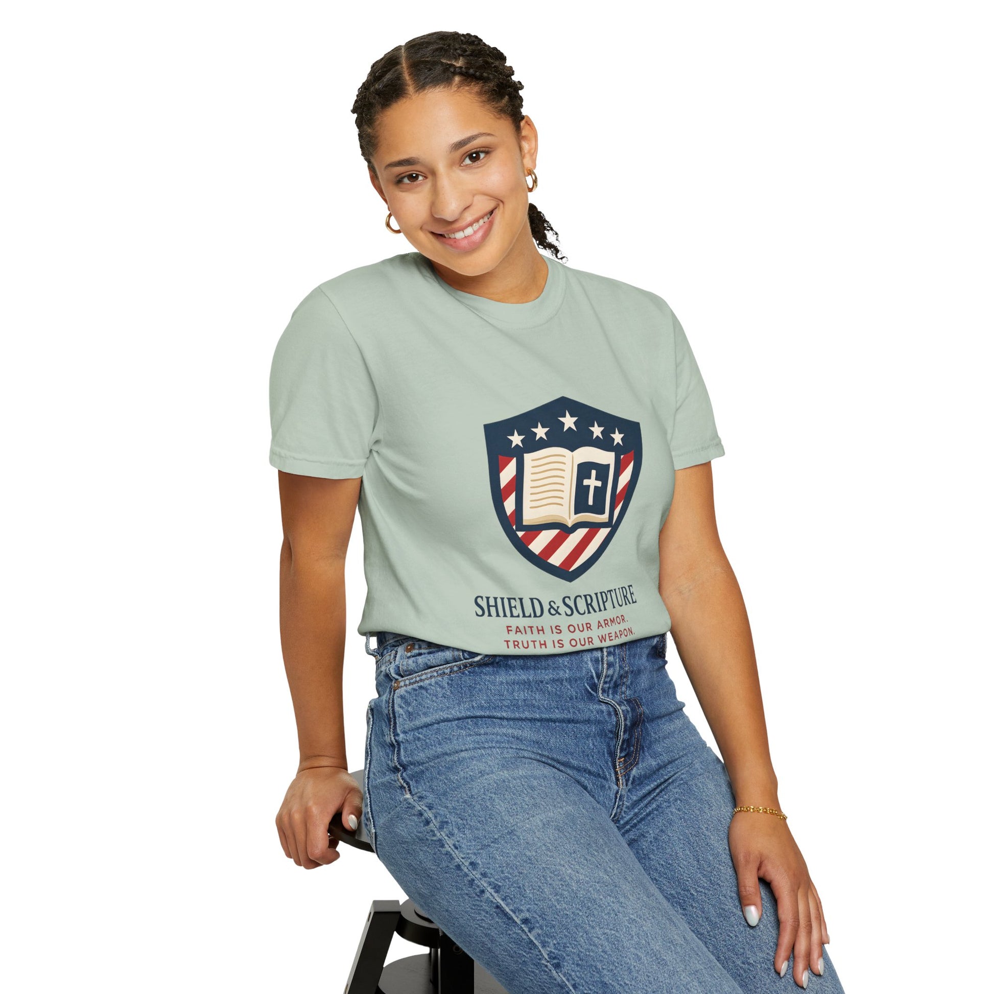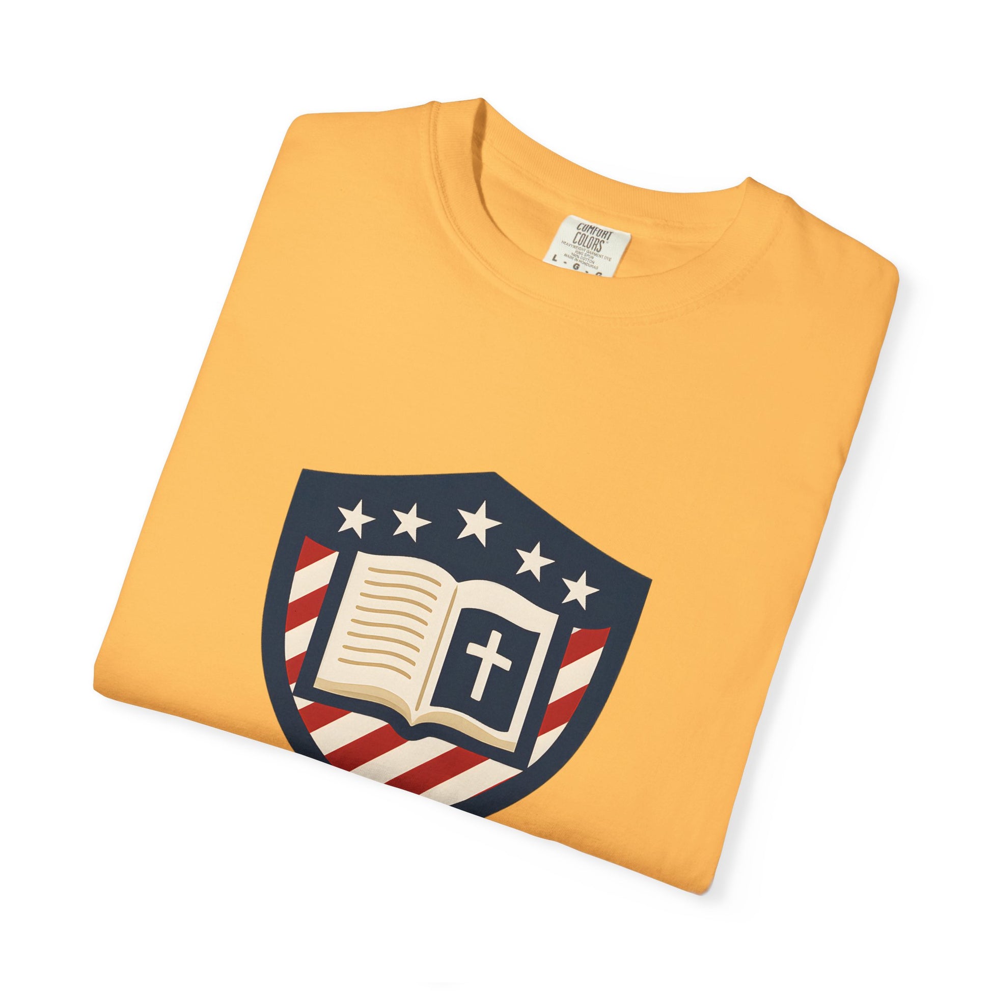 Wear your convictions loud and clear with the Shield & Scripture T-Shirt | Jesus Shield Design featuring the powerful Jesus Shield design. This patriotic tee blends bold American pride with unwavering Christian values, making it the perfect choice for men who live by faith and stand for truth.