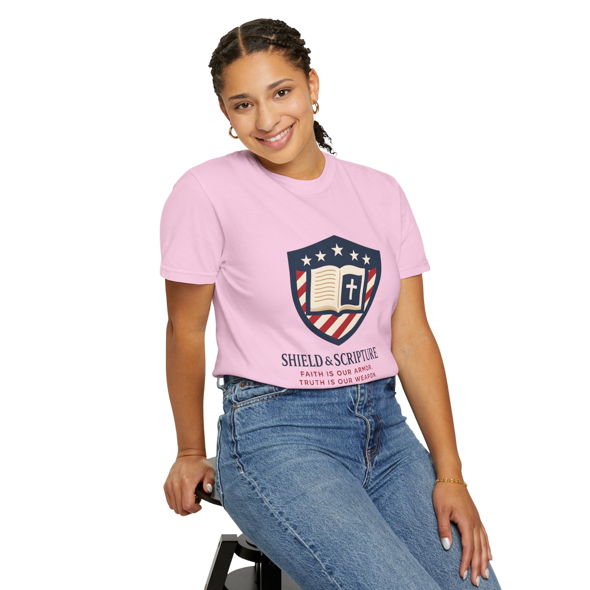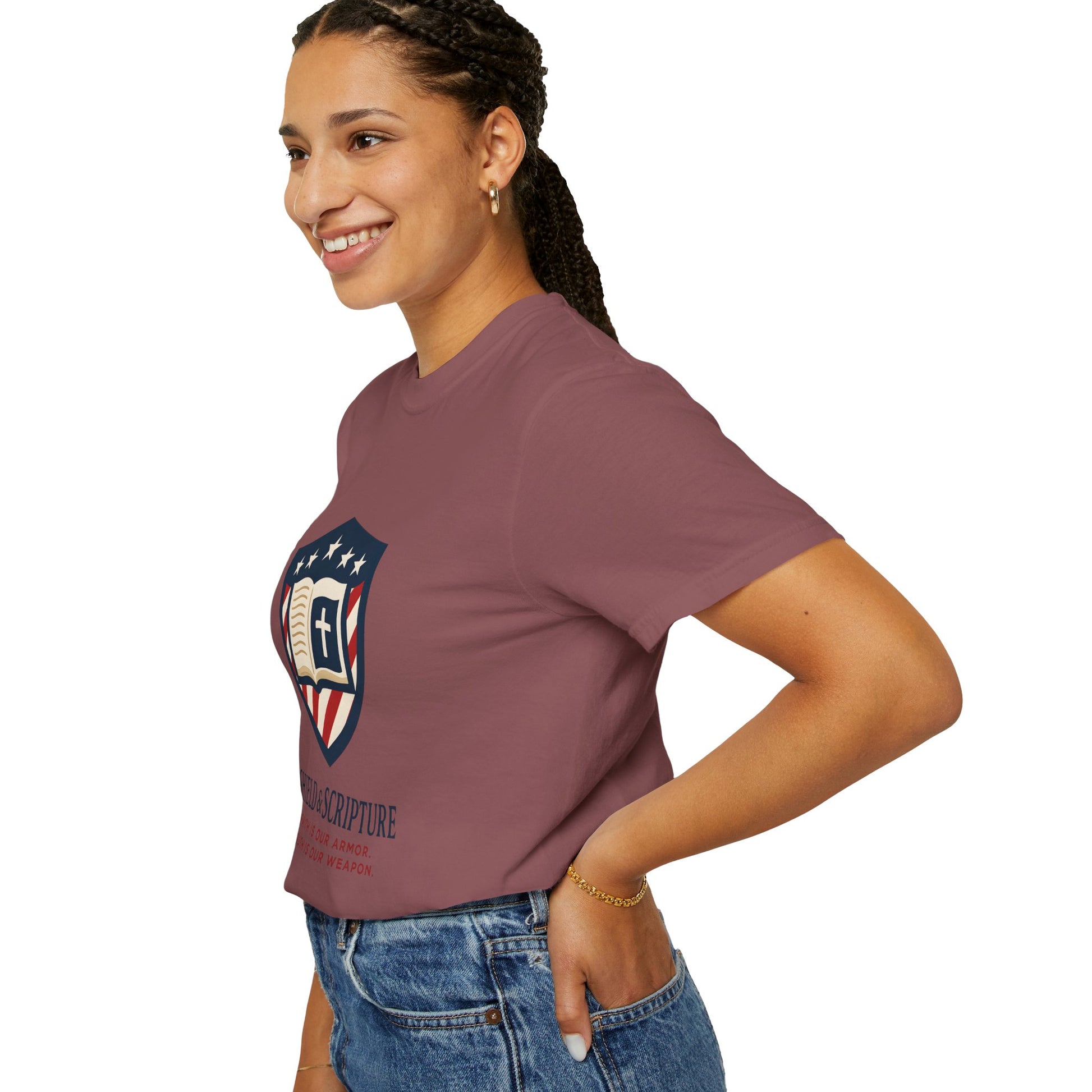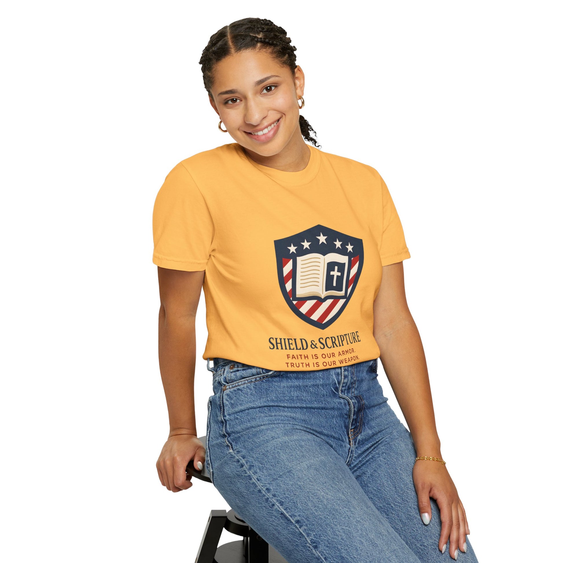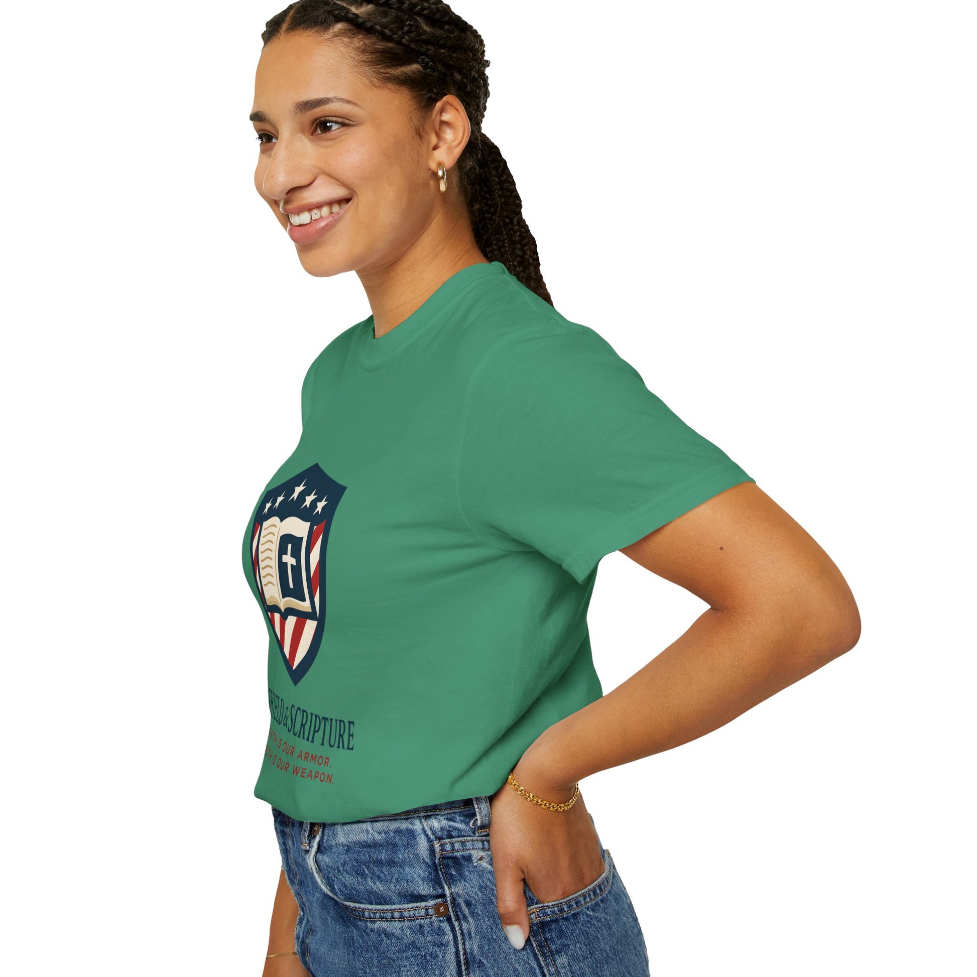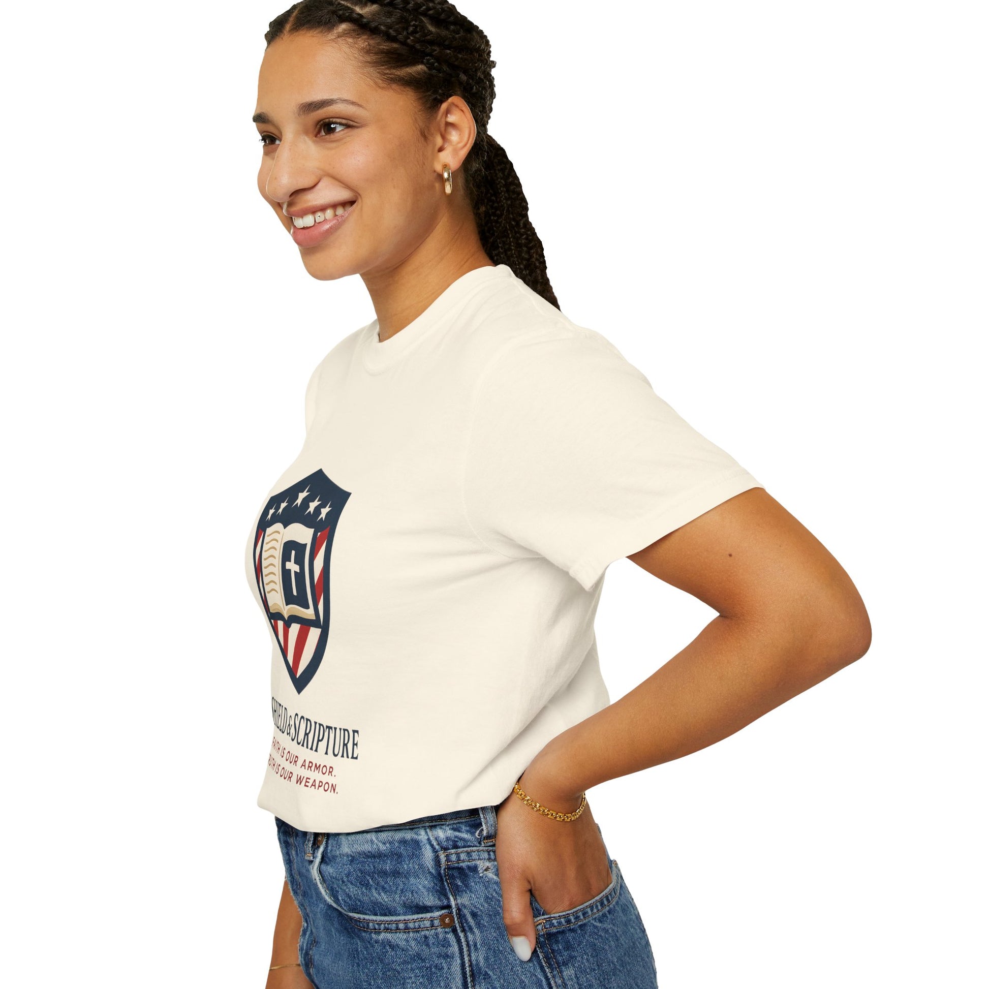 Wear your convictions loud and clear with the Shield & Scripture T-Shirt | Jesus Shield Design featuring the powerful Jesus Shield design. This patriotic tee blends bold American pride with unwavering Christian values, making it the perfect choice for men who live by faith and stand for truth.