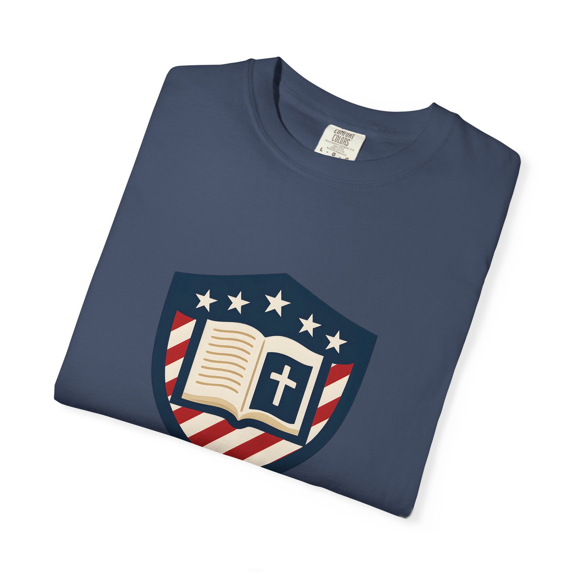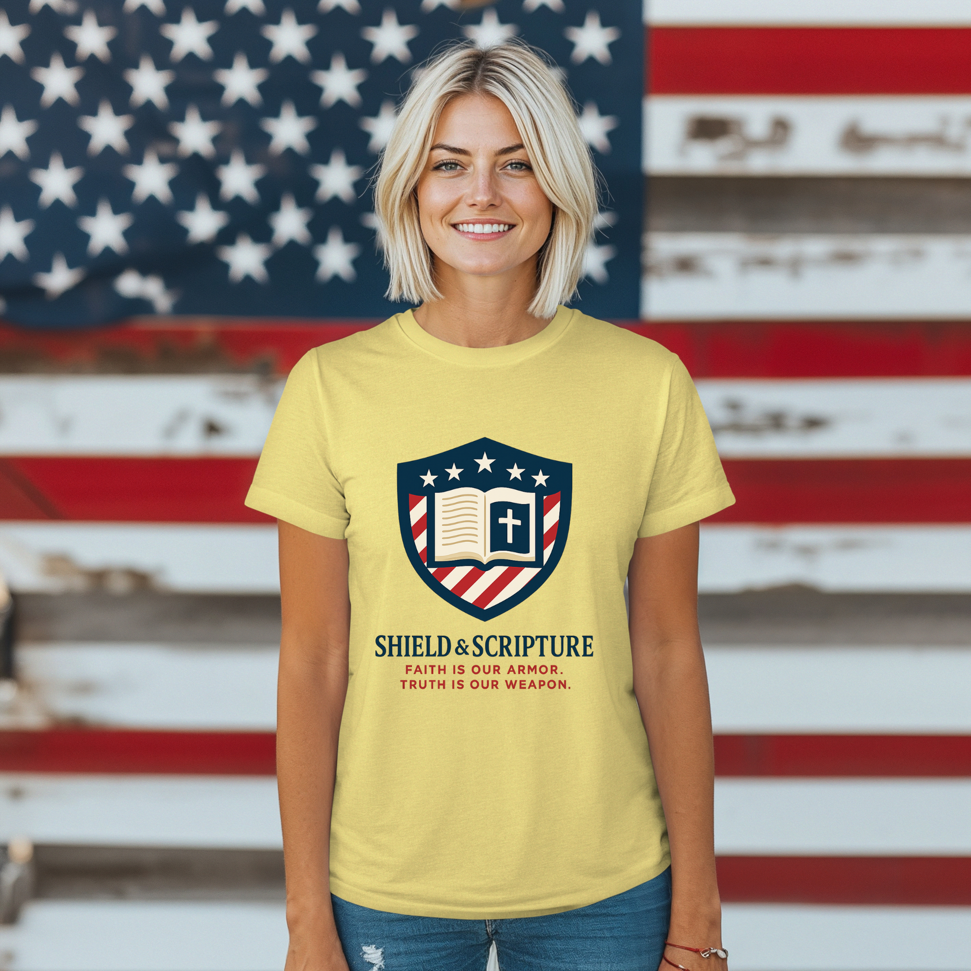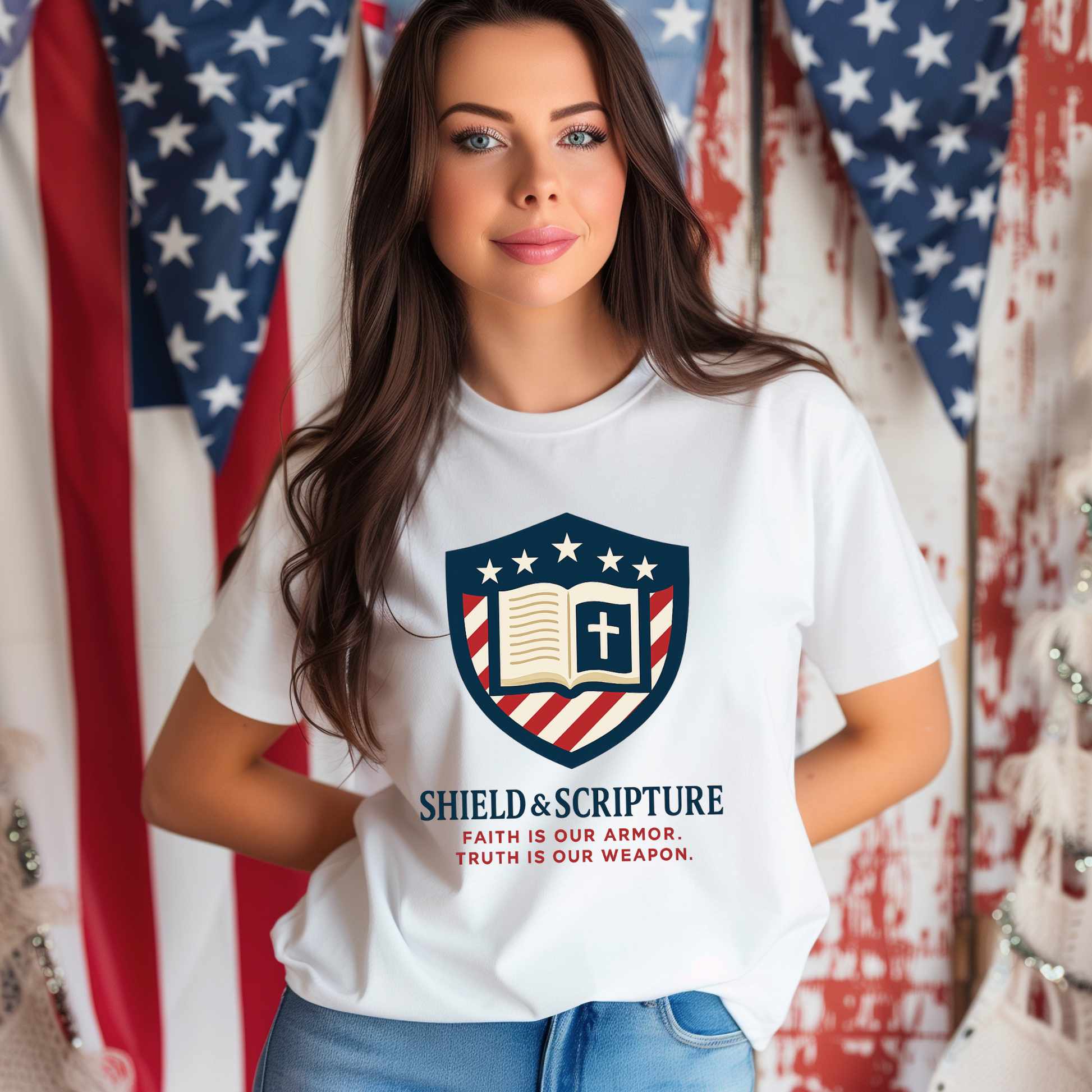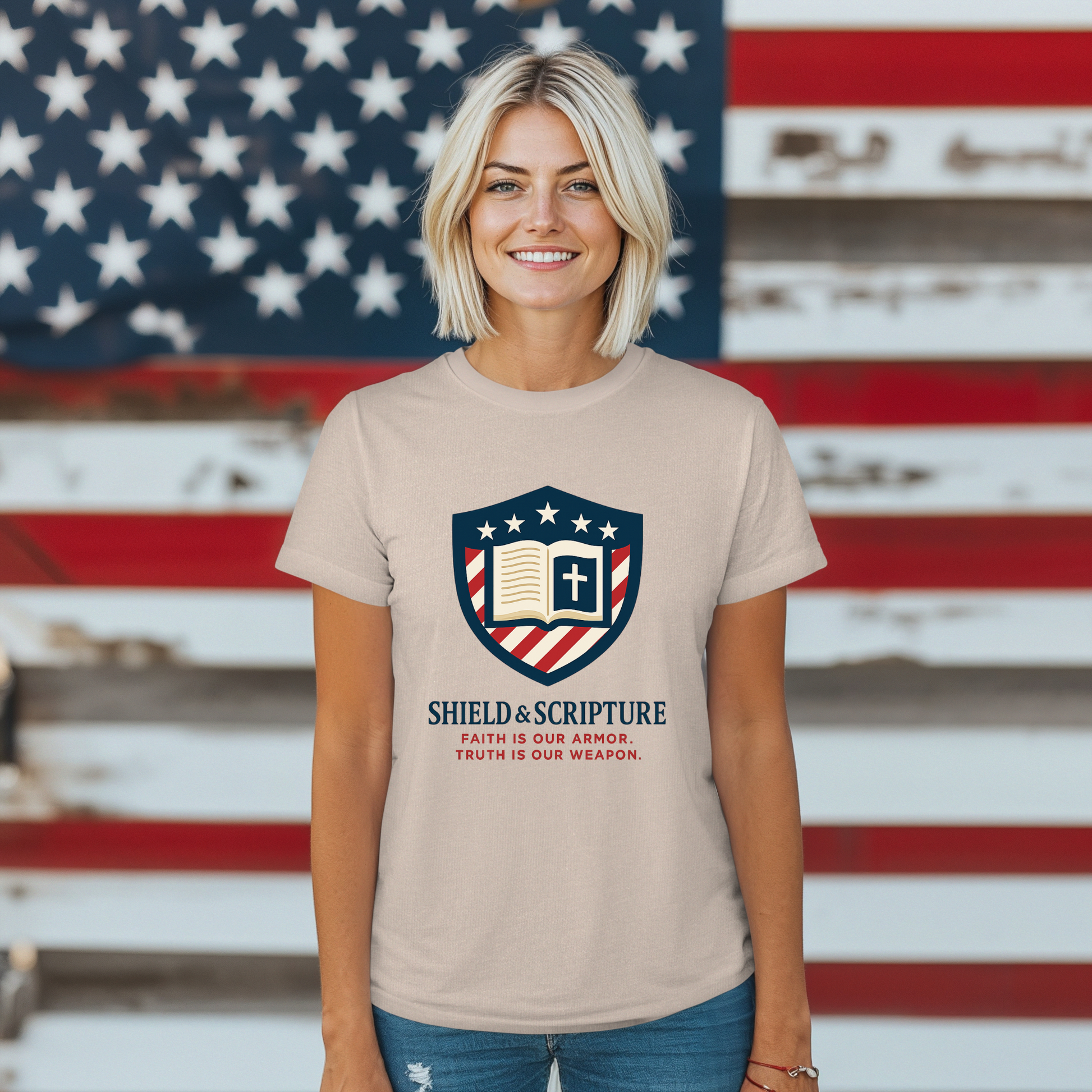 - Faith-driven design featuring the Jesus Shield emblem with patriotic themes