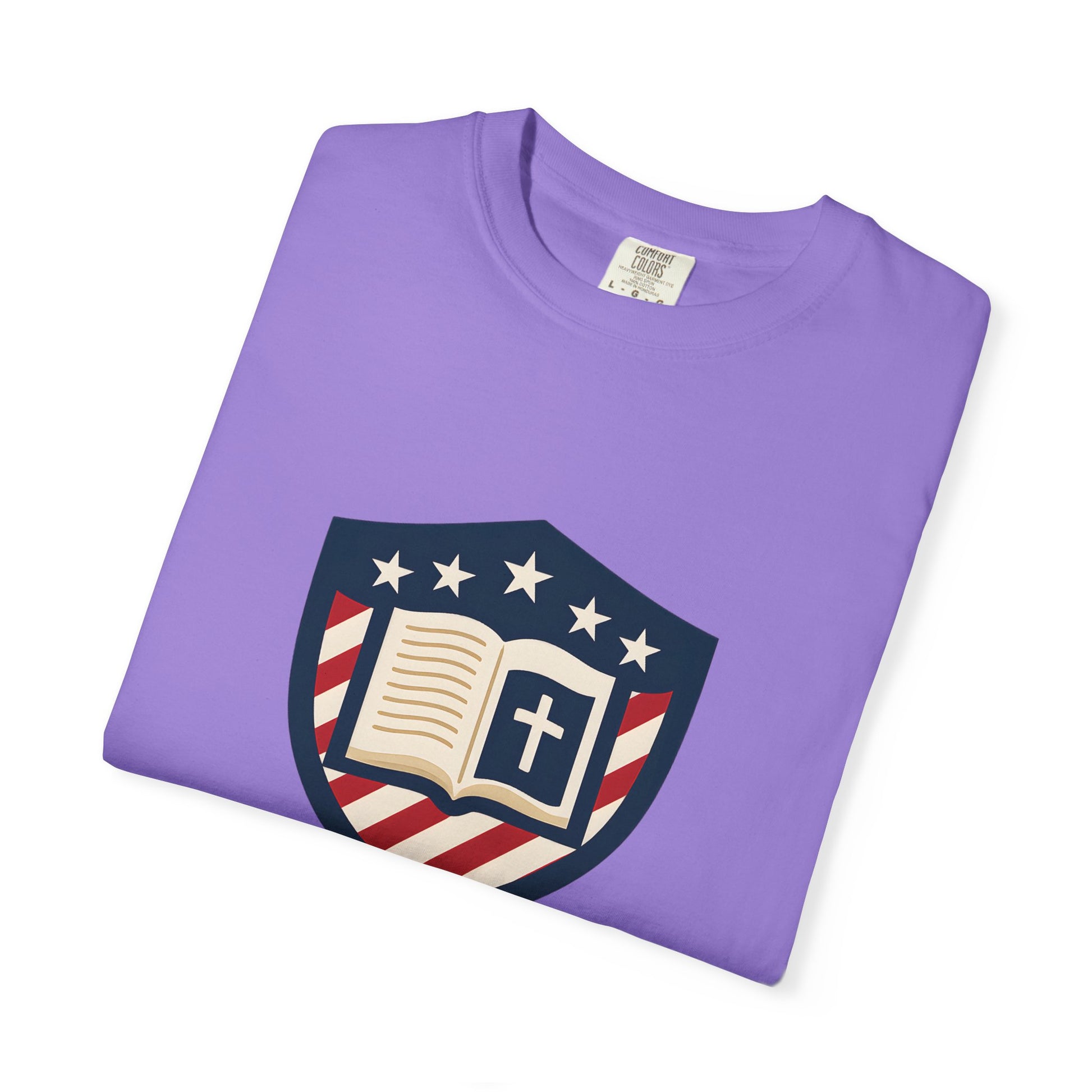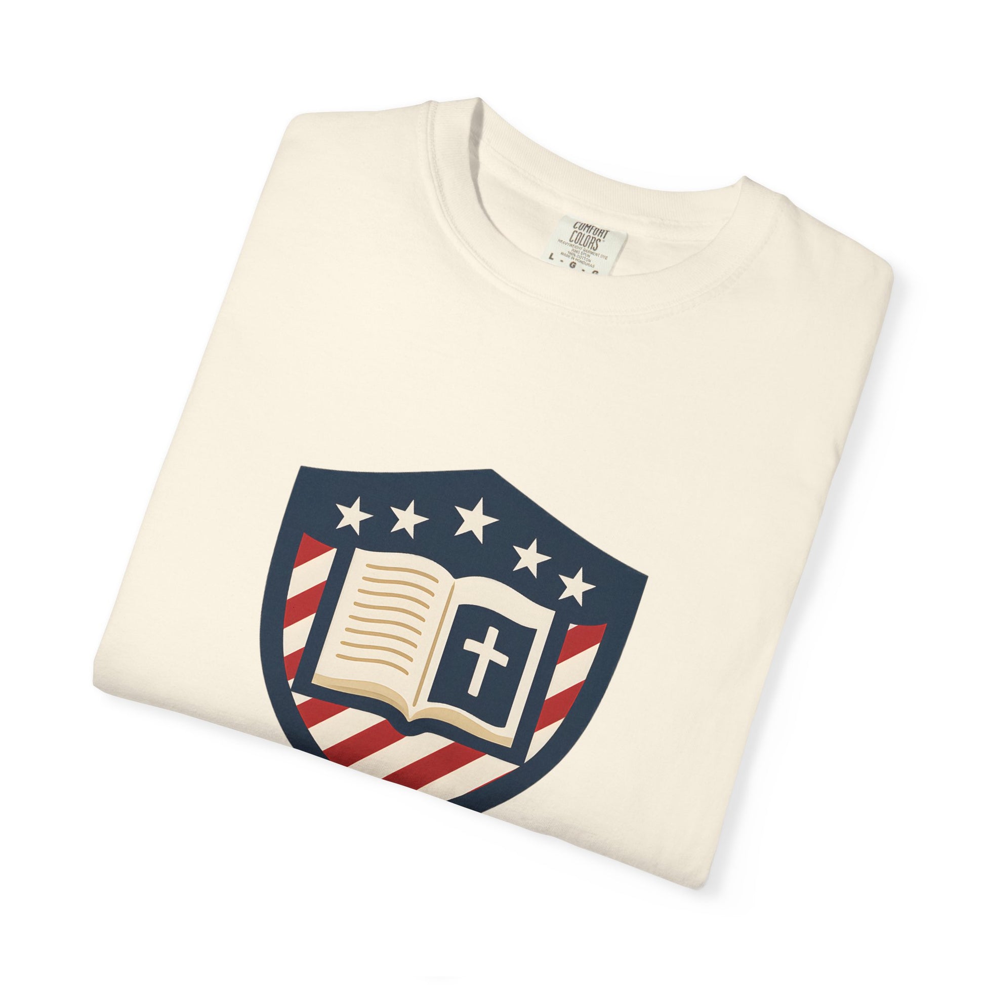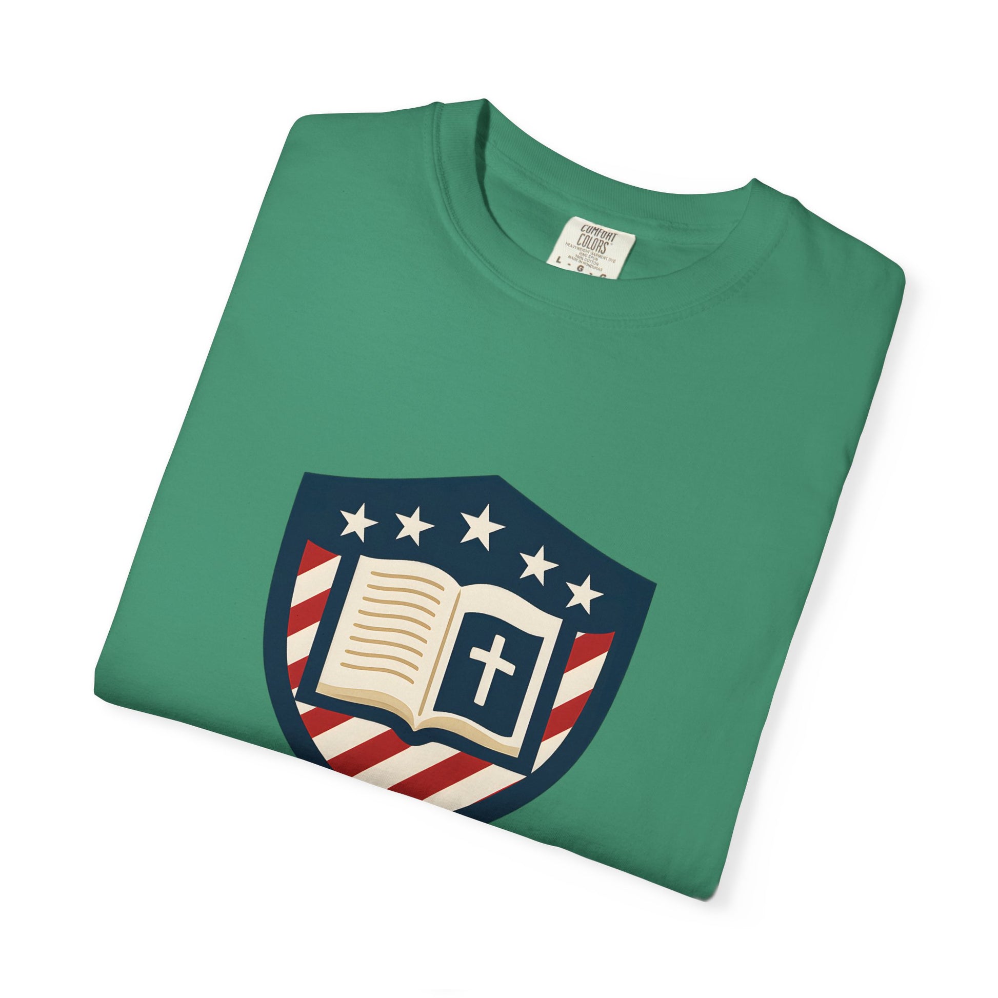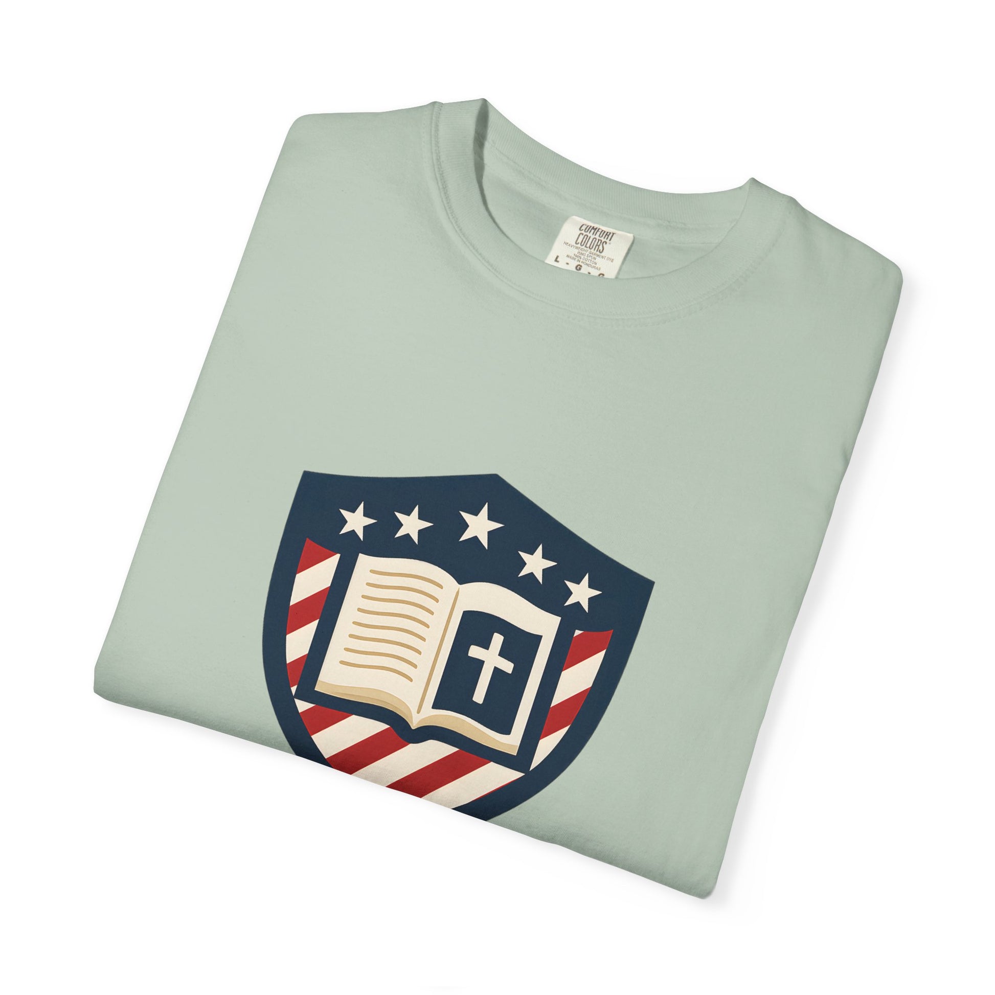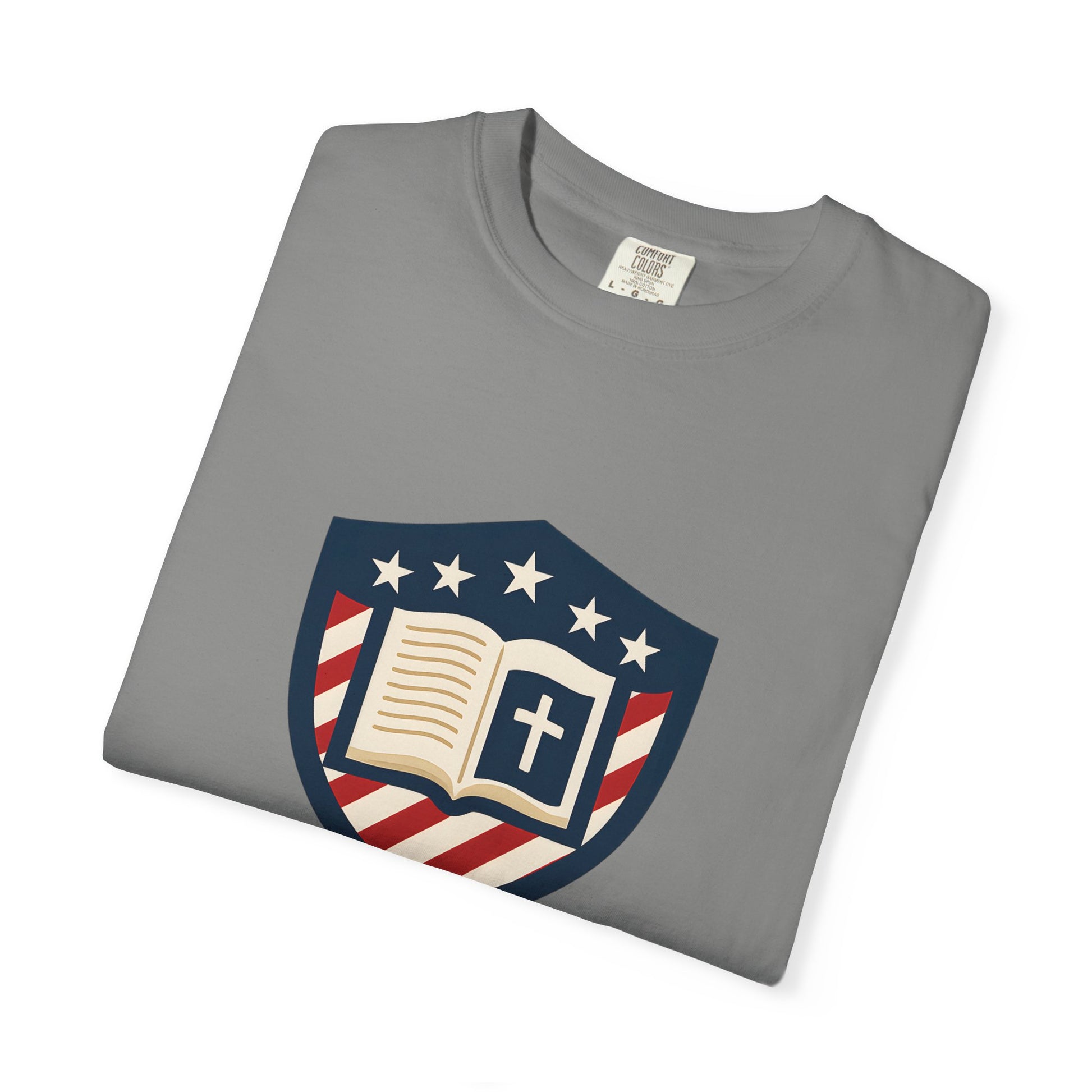 - Faith-driven design featuring the Jesus Shield emblem with patriotic themes