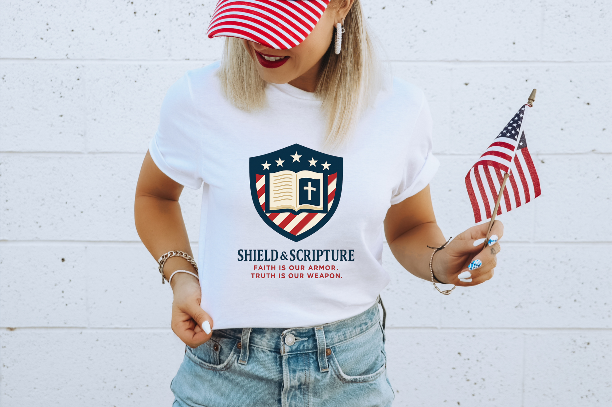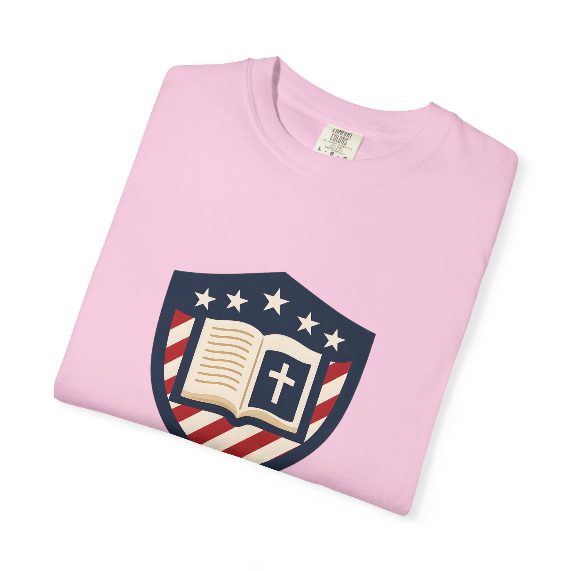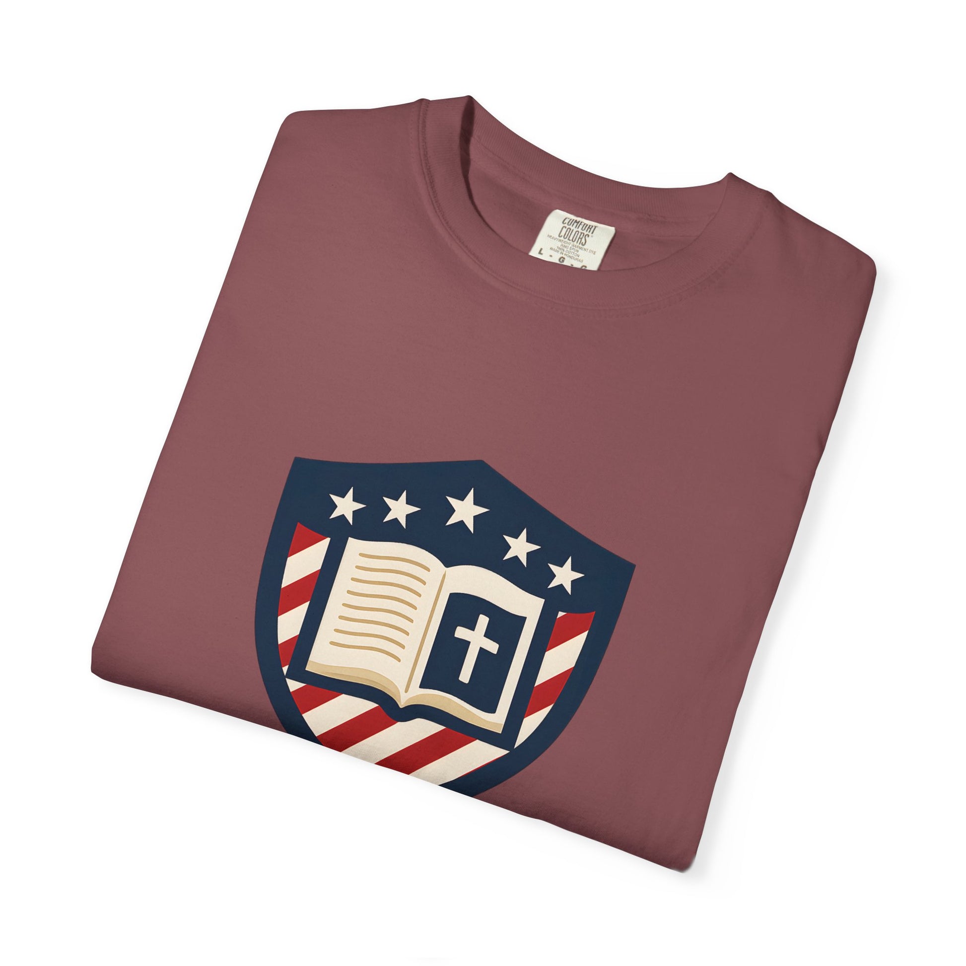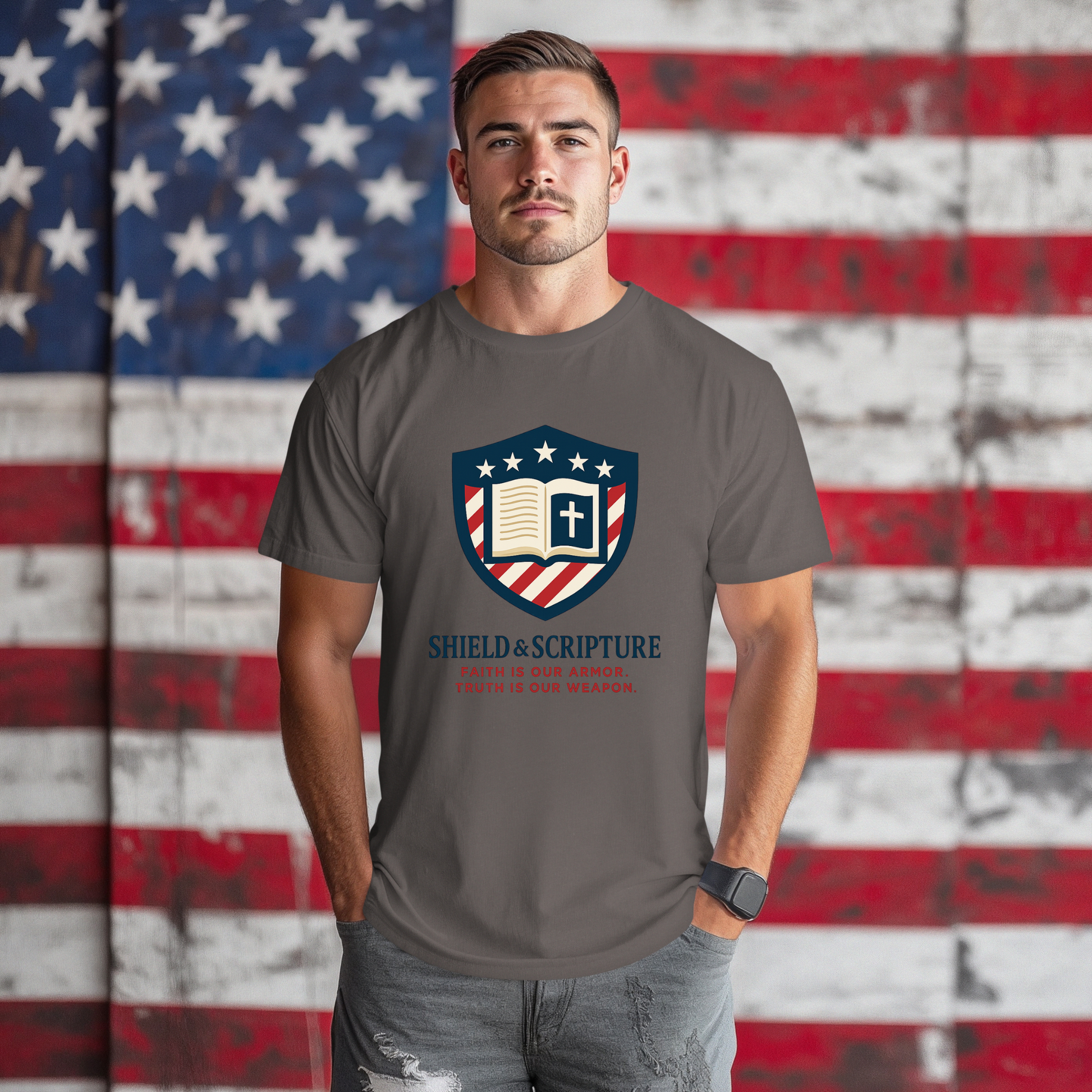 - Faith-driven design featuring the Jesus Shield emblem with patriotic themes