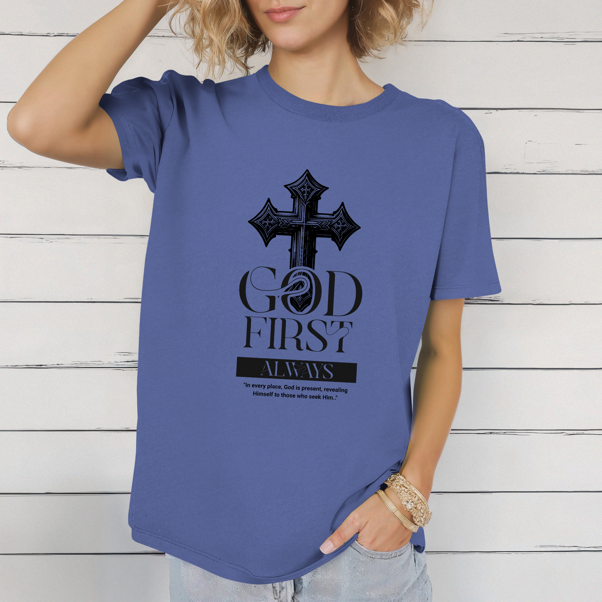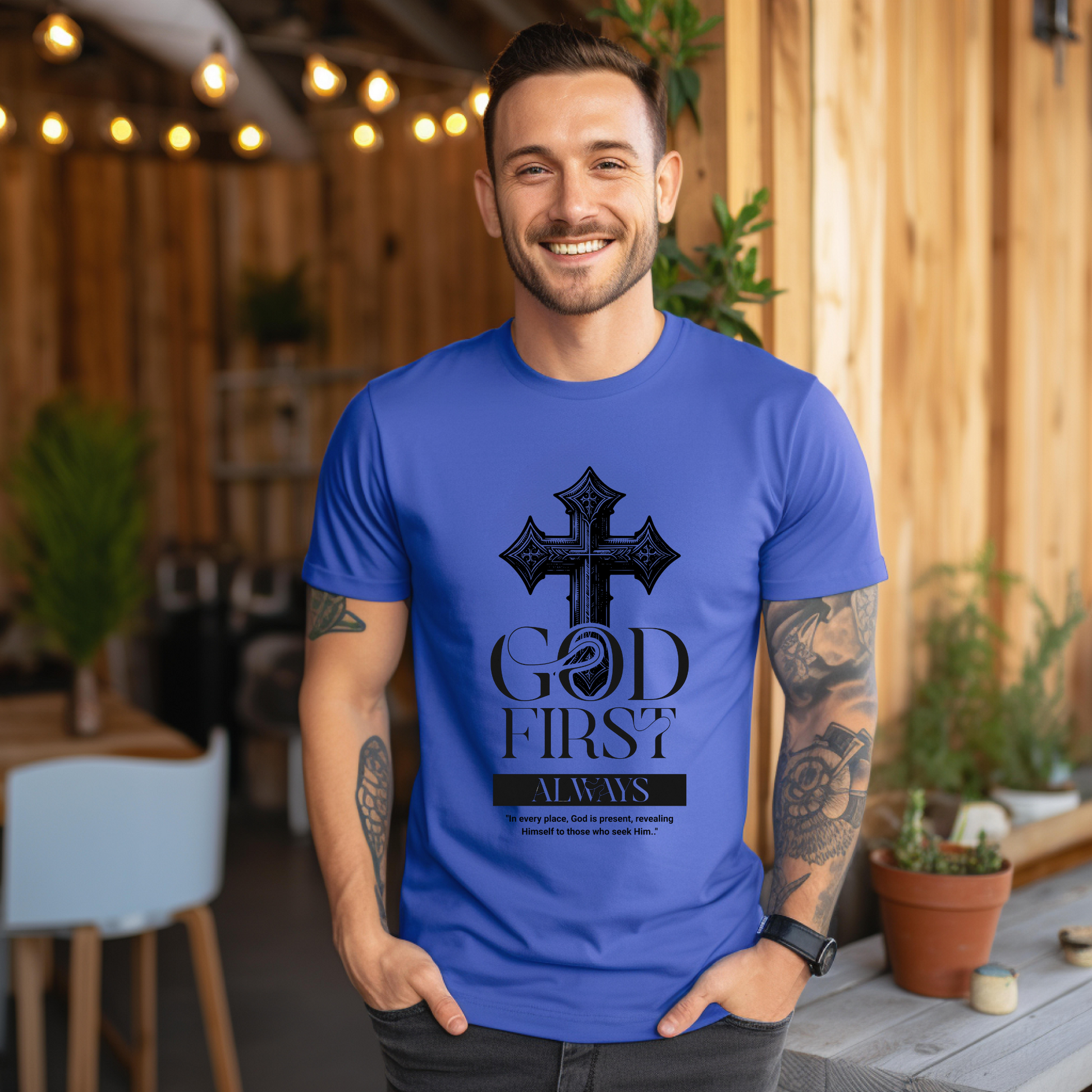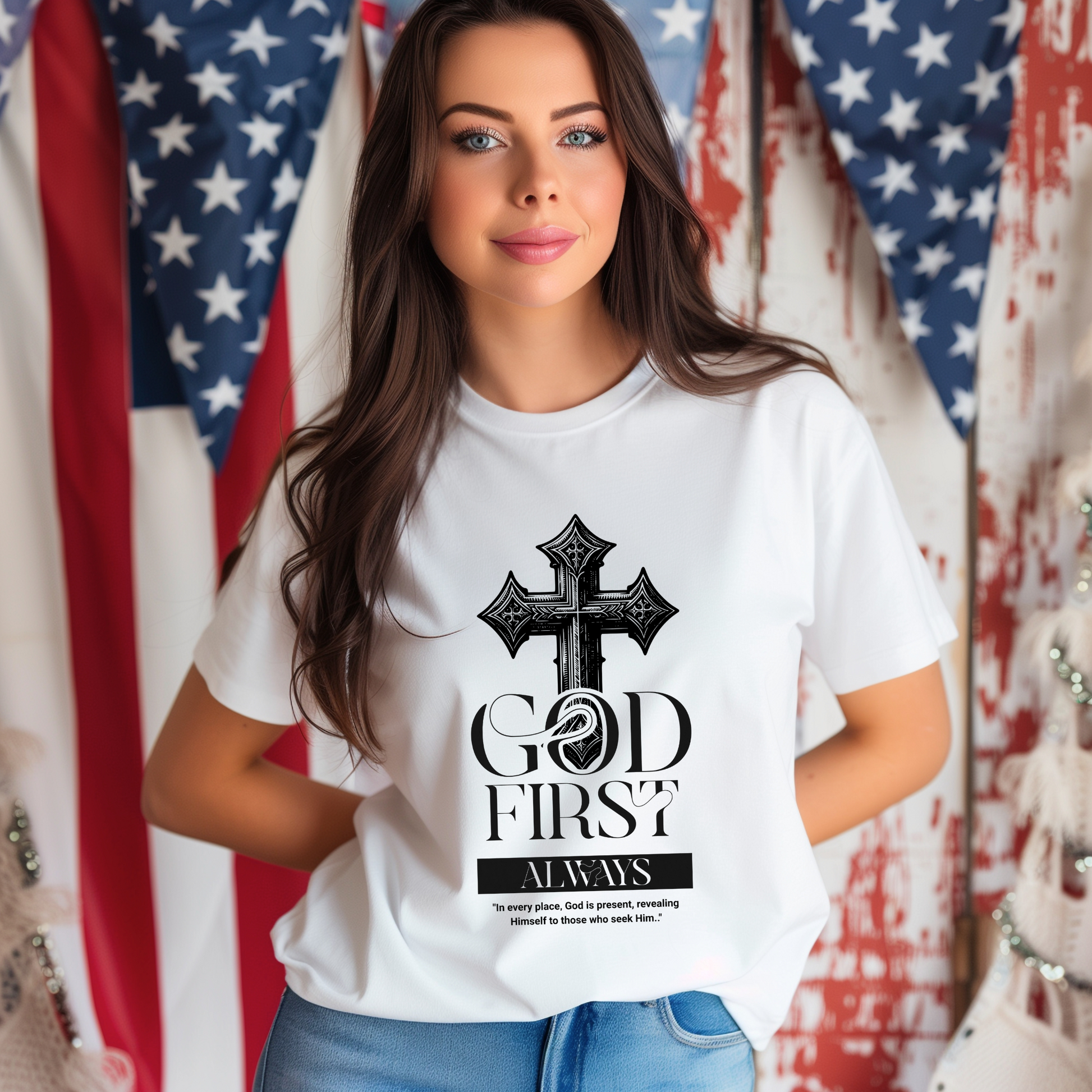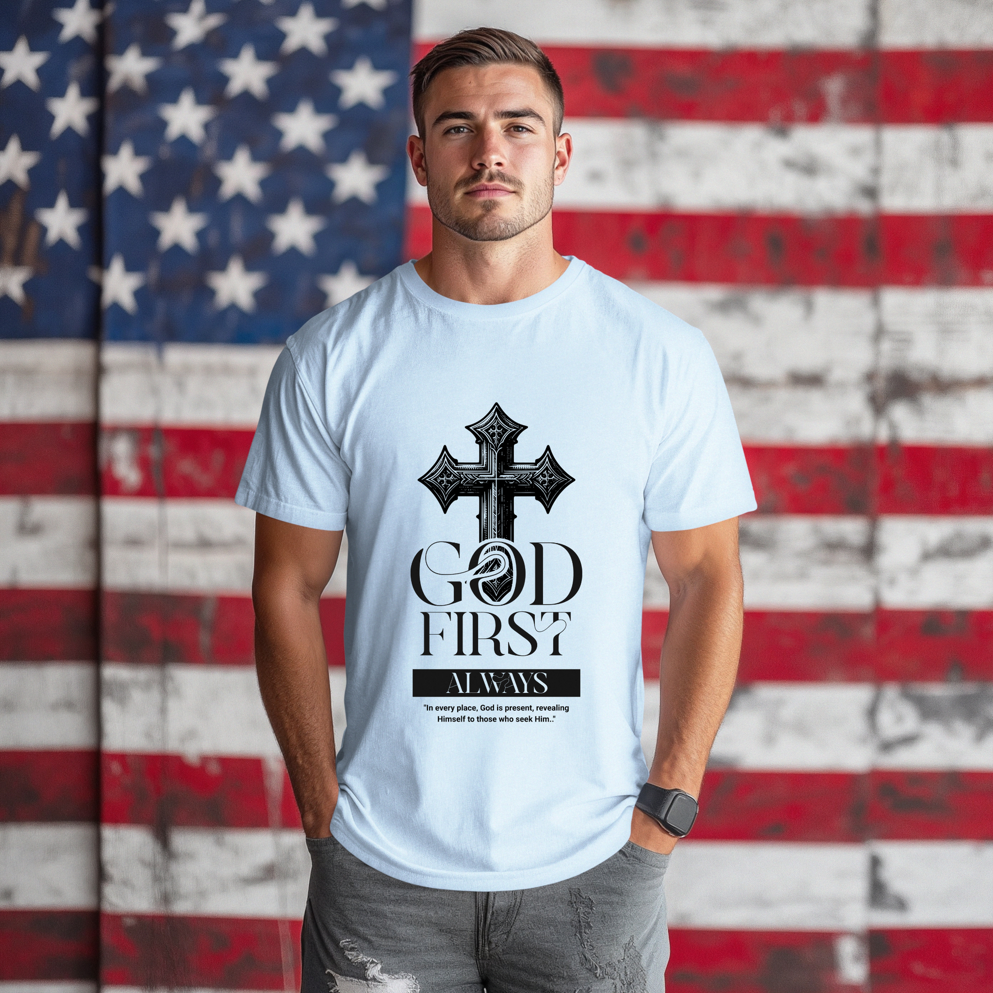The God First Always T-Shirt is a simple yet powerful way to share your faith , reminding us that when God is first, everything else falls into place.