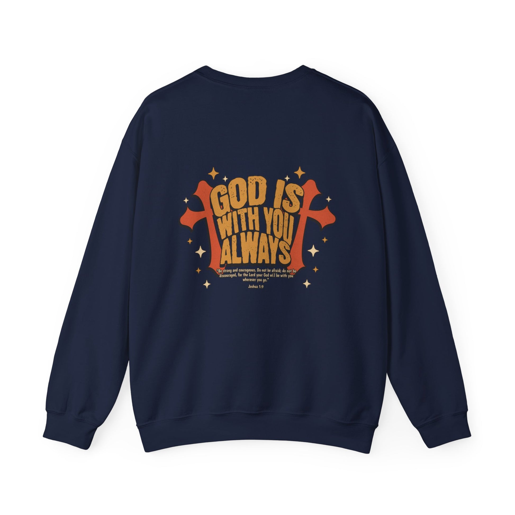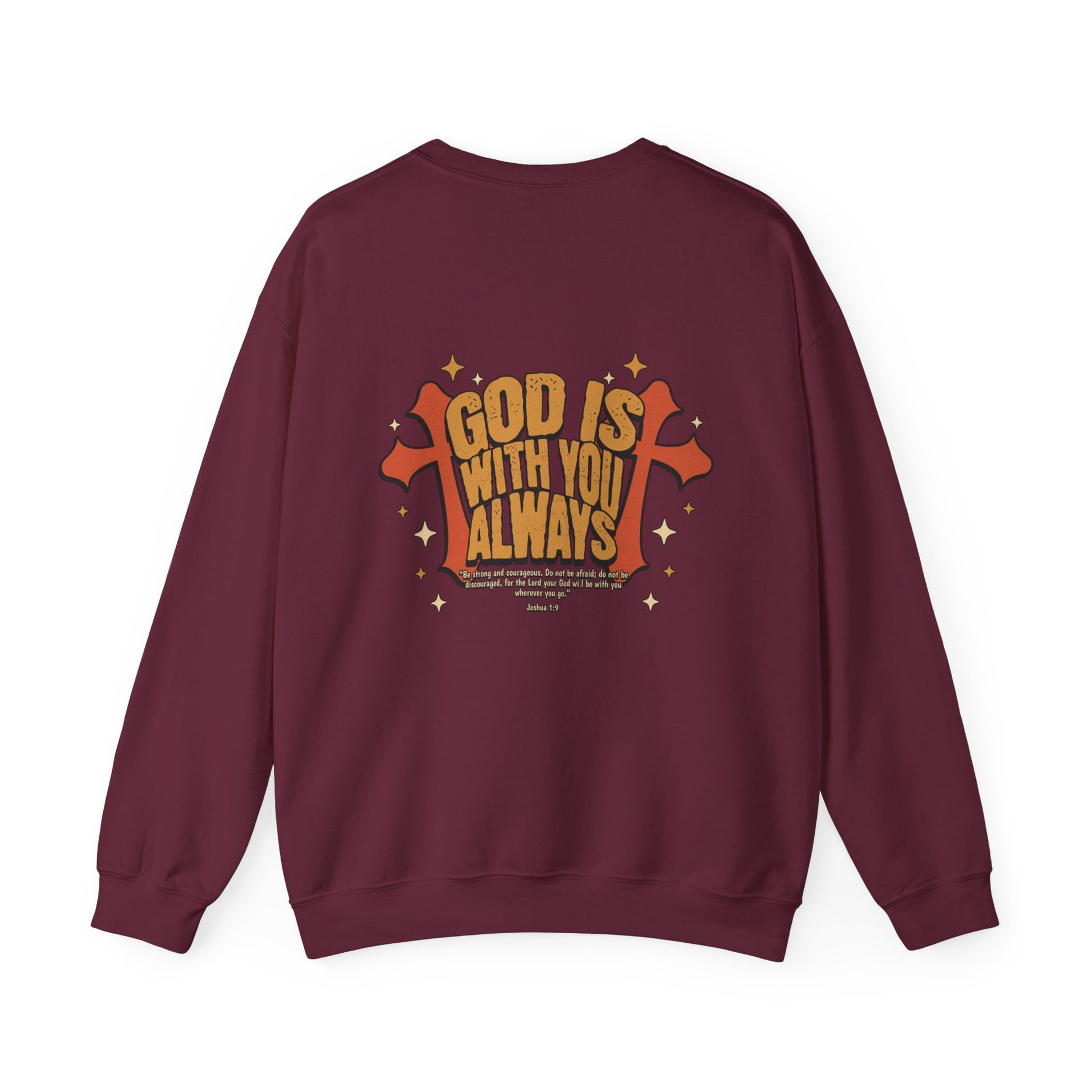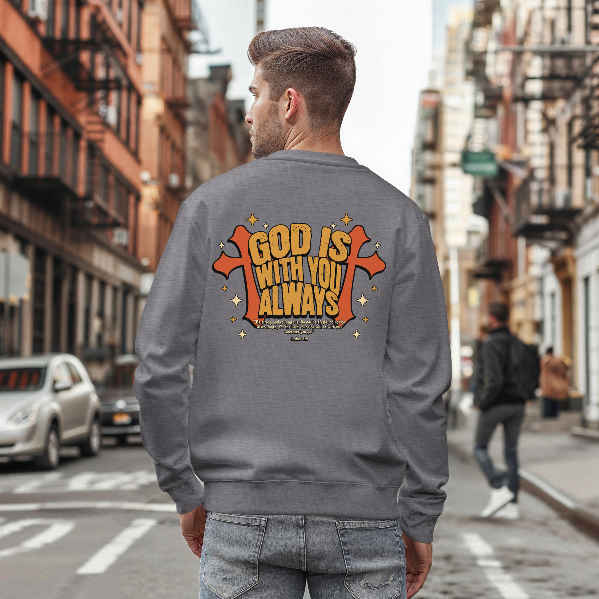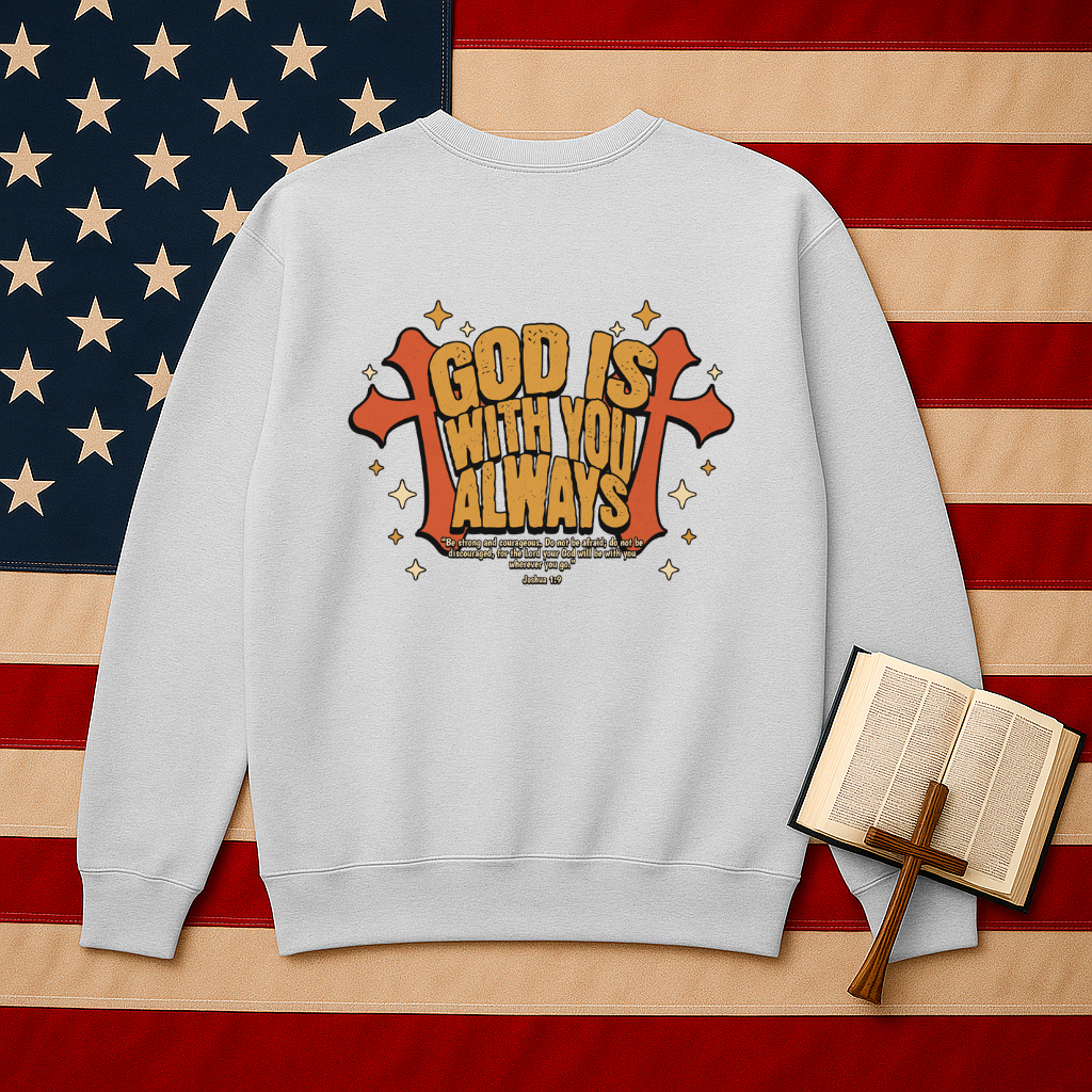 Stay cozy while sharing your faith with this “God Is With You Always” Christian sweatshirt. Featuring bold lettering, cross accents, and the uplifting scripture from Joshua 1:9, this sweatshirt is a daily reminder of strength, courage, and God’s constant presence.