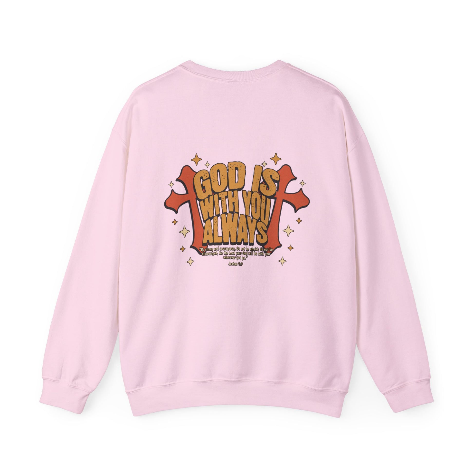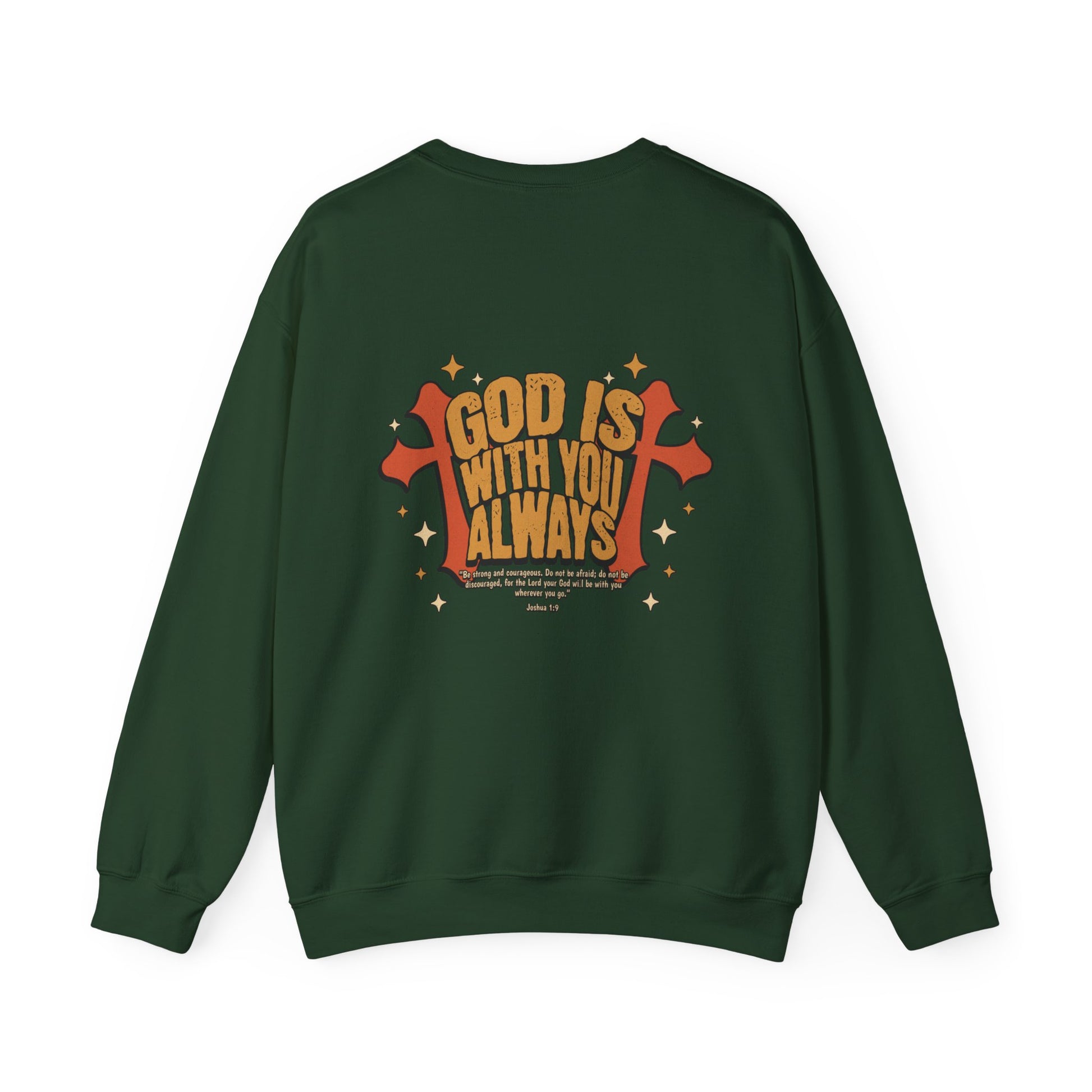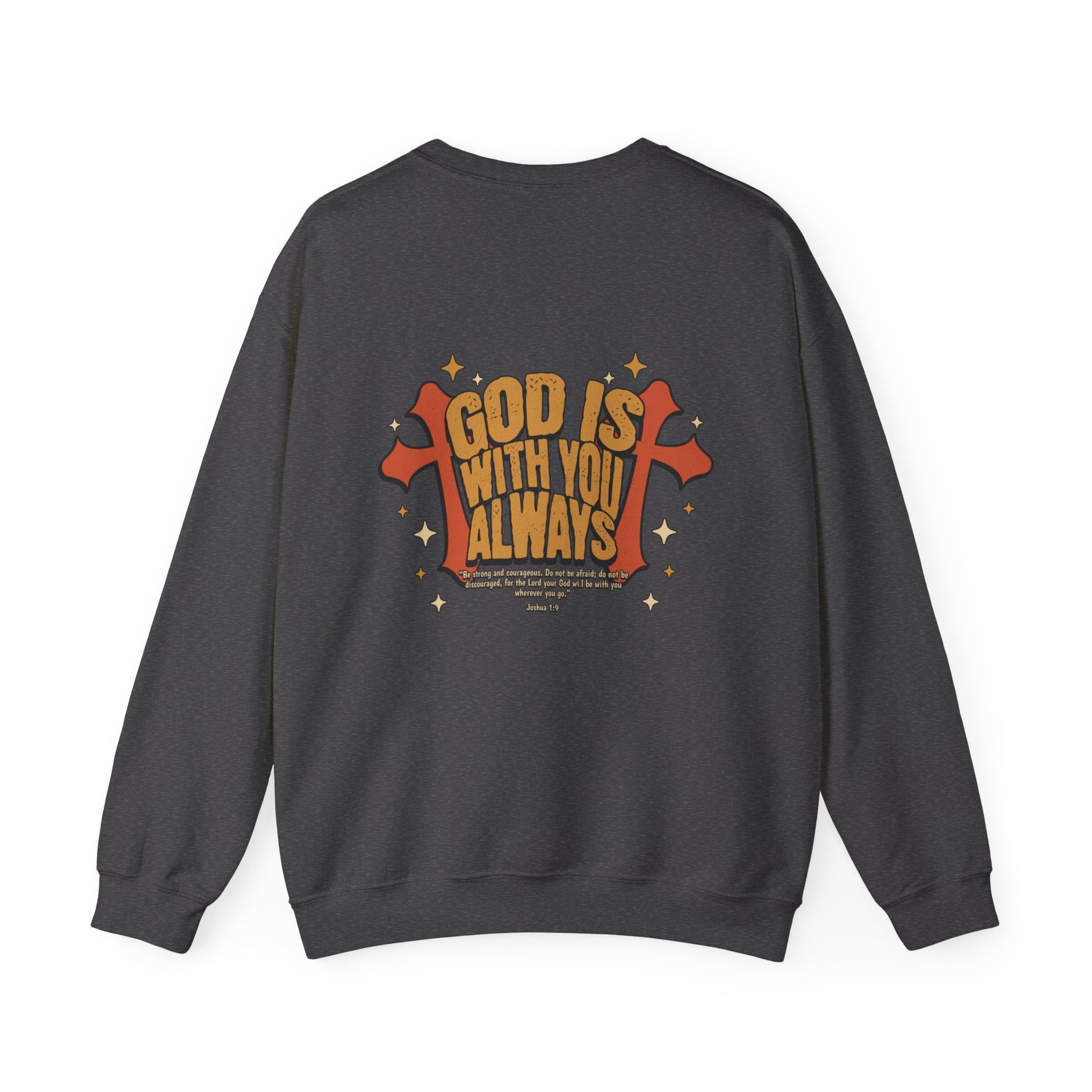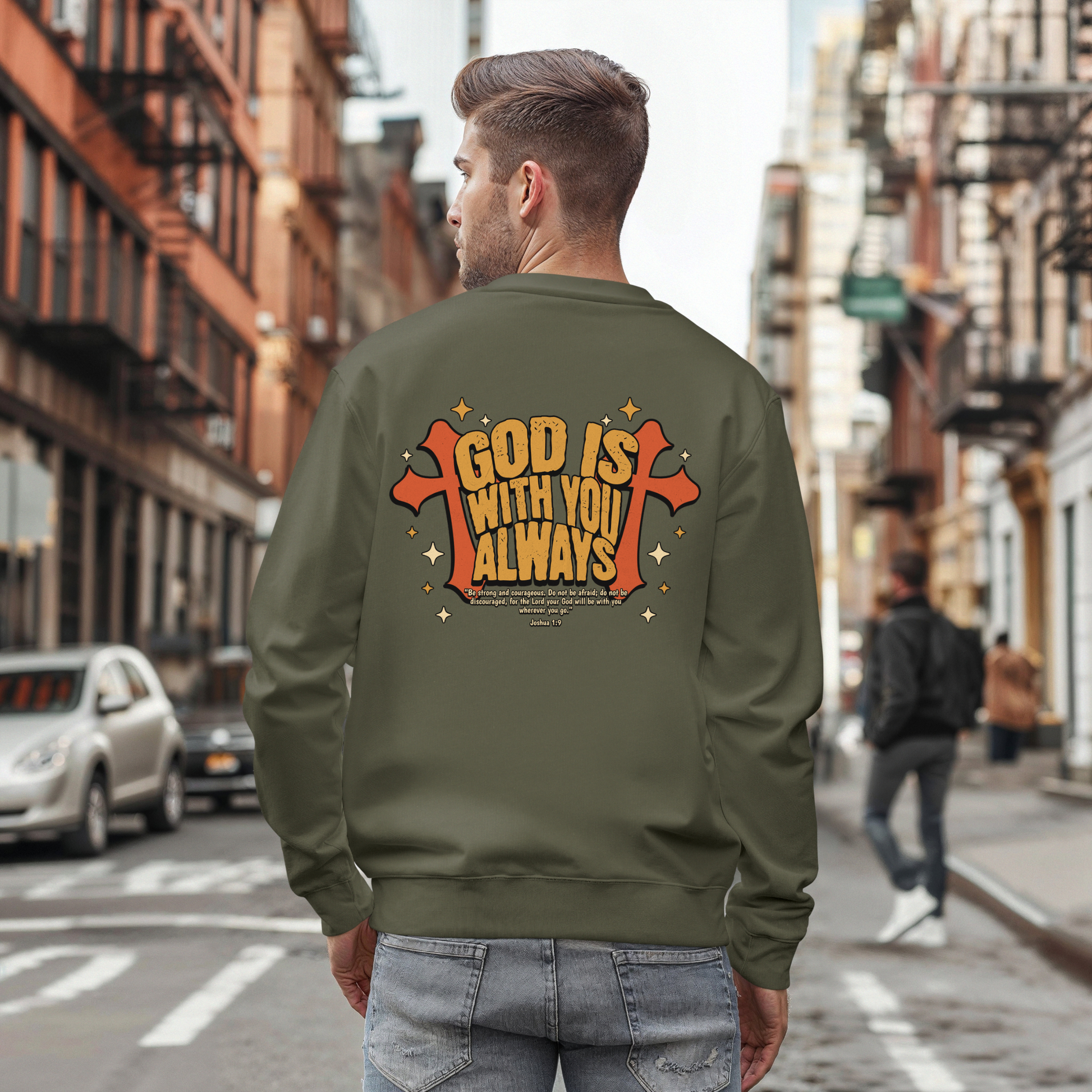 Stay cozy while sharing your faith with this “God Is With You Always” Christian sweatshirt. Featuring bold lettering, cross accents, and the uplifting scripture from Joshua 1:9, this sweatshirt is a daily reminder of strength, courage, and God’s constant presence.