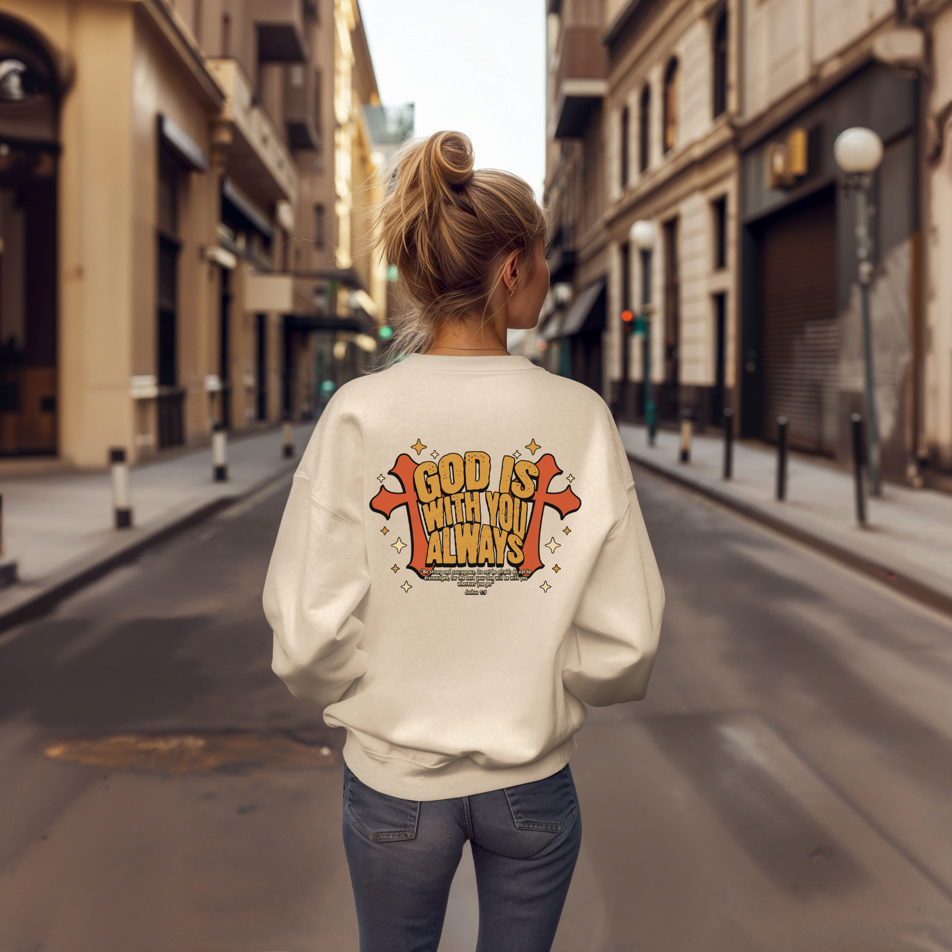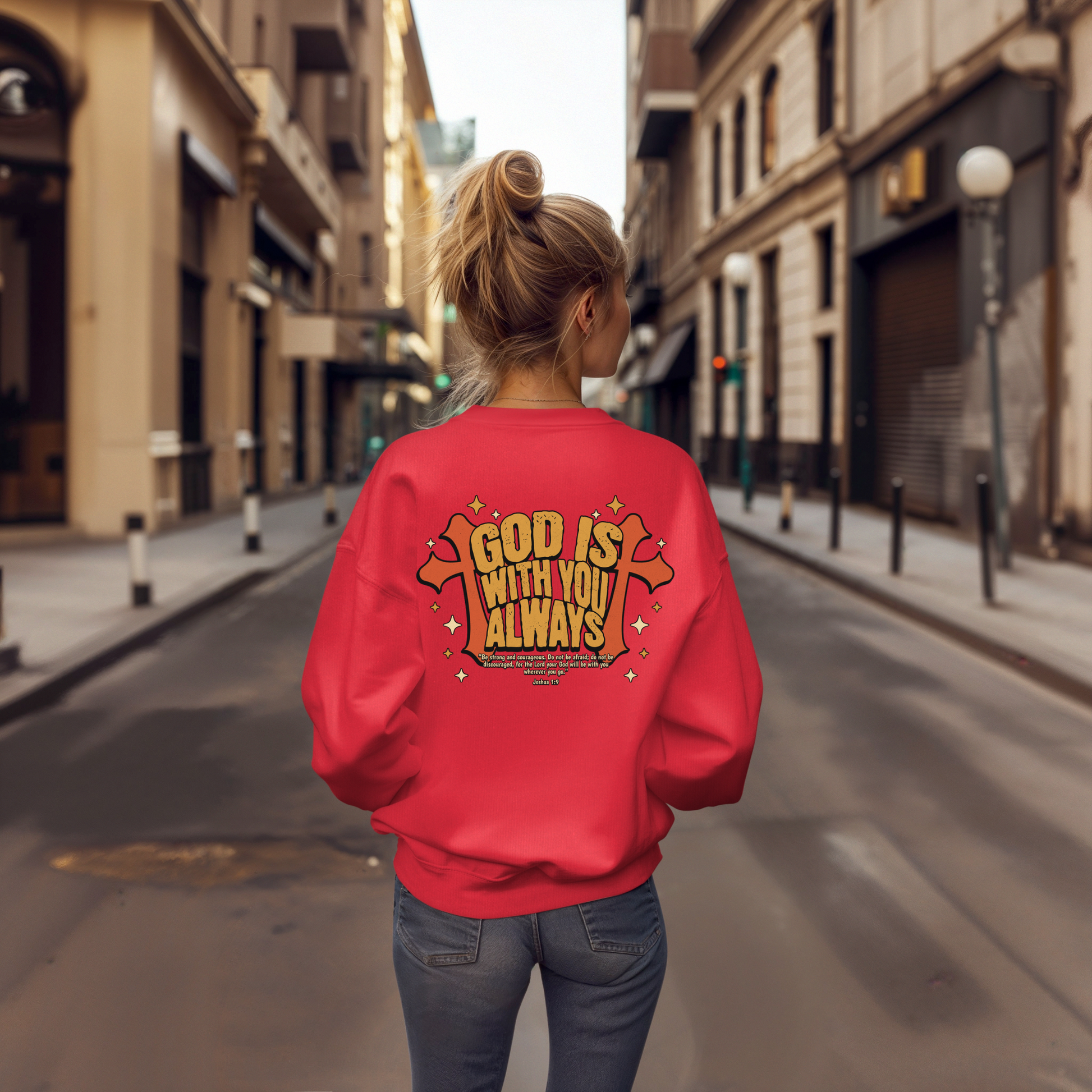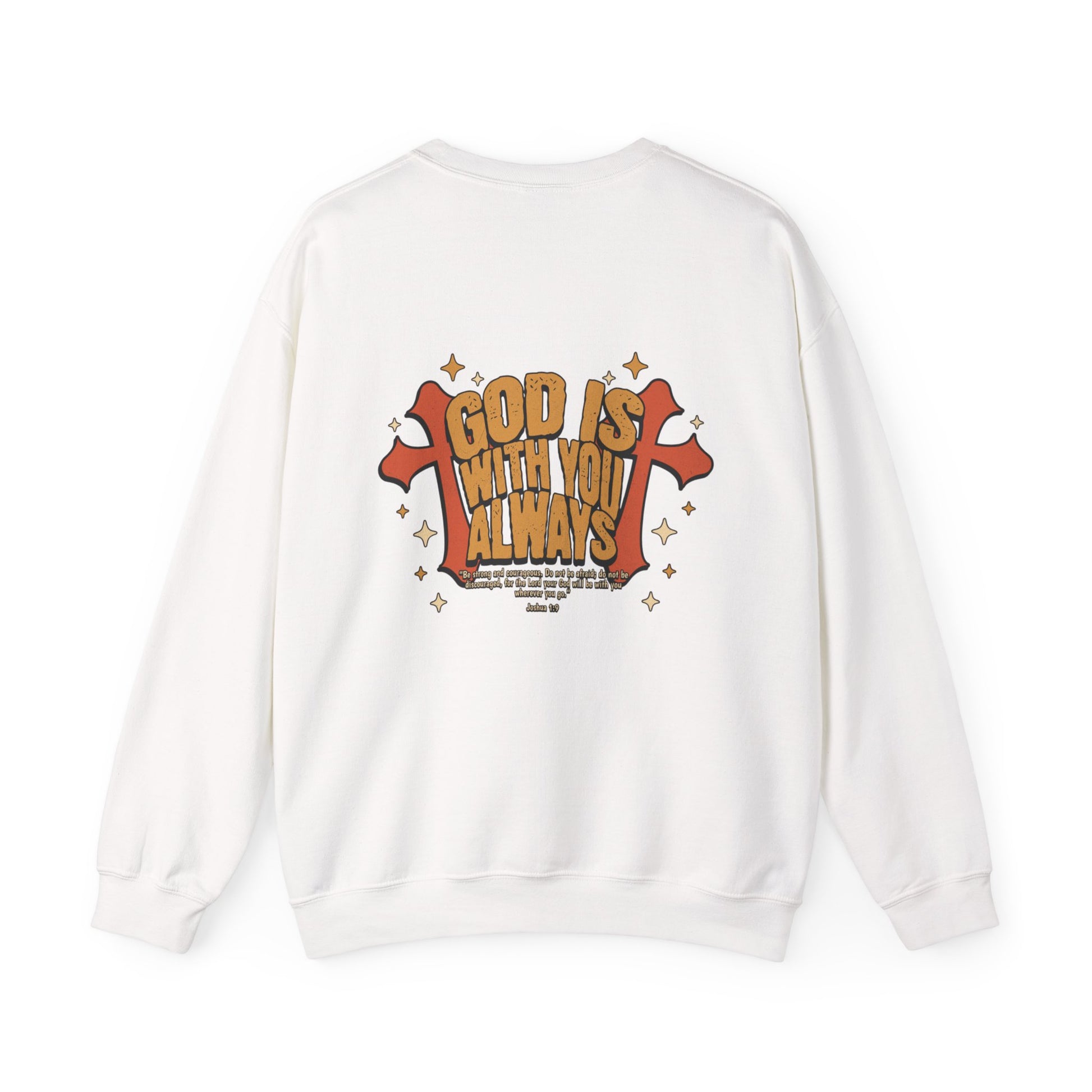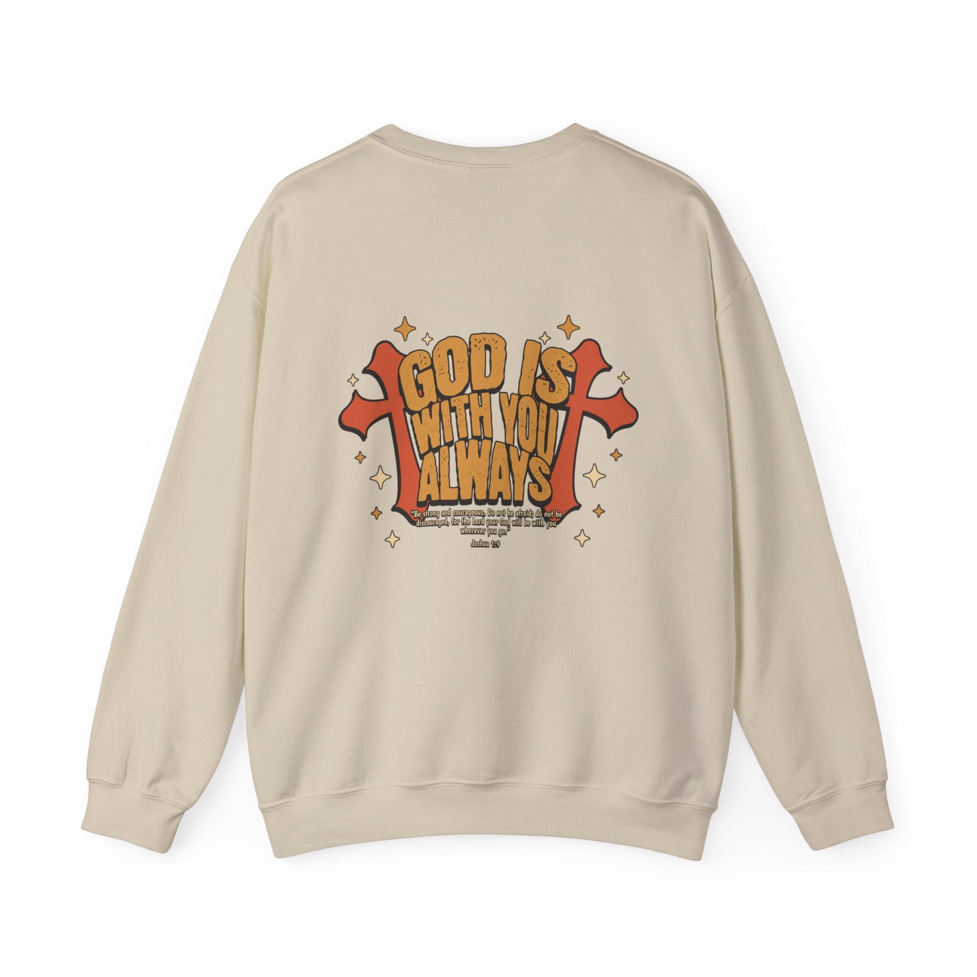 Stay cozy while sharing your faith with this “God Is With You Always” Christian sweatshirt. Featuring bold lettering, cross accents, and the uplifting scripture from Joshua 1:9, this sweatshirt is a daily reminder of strength, courage, and God’s constant presence.