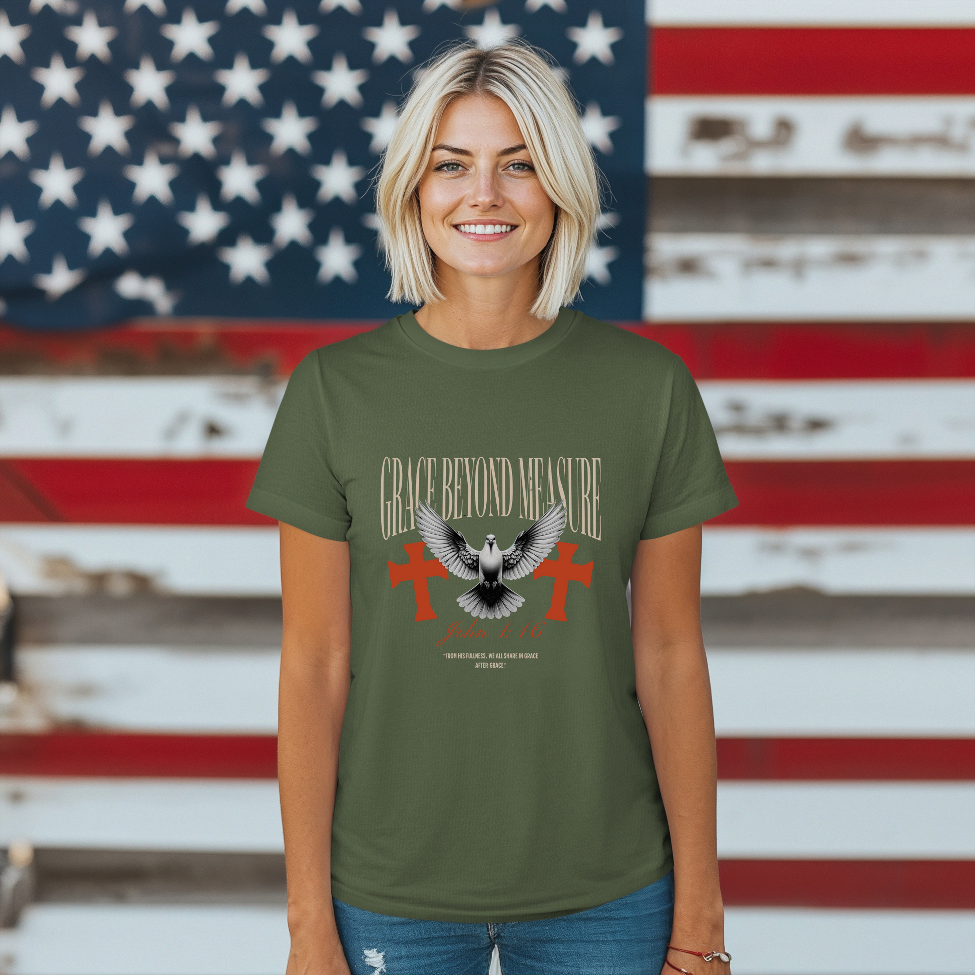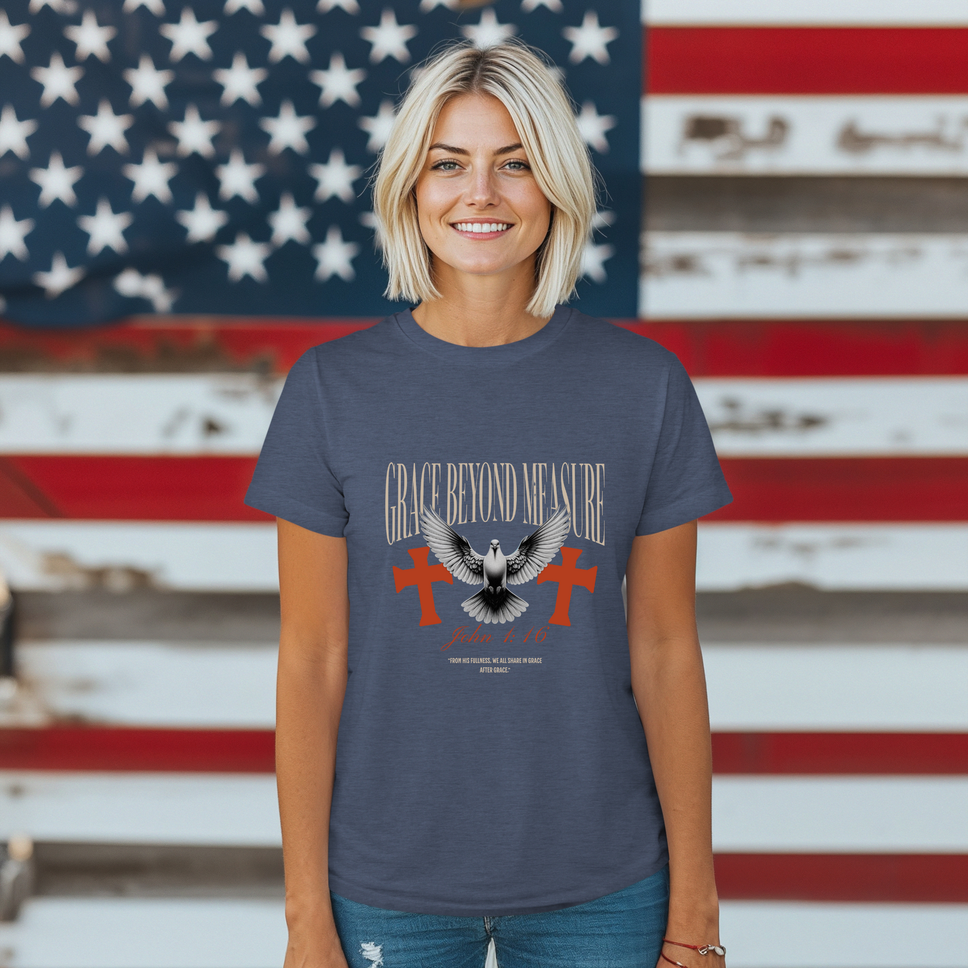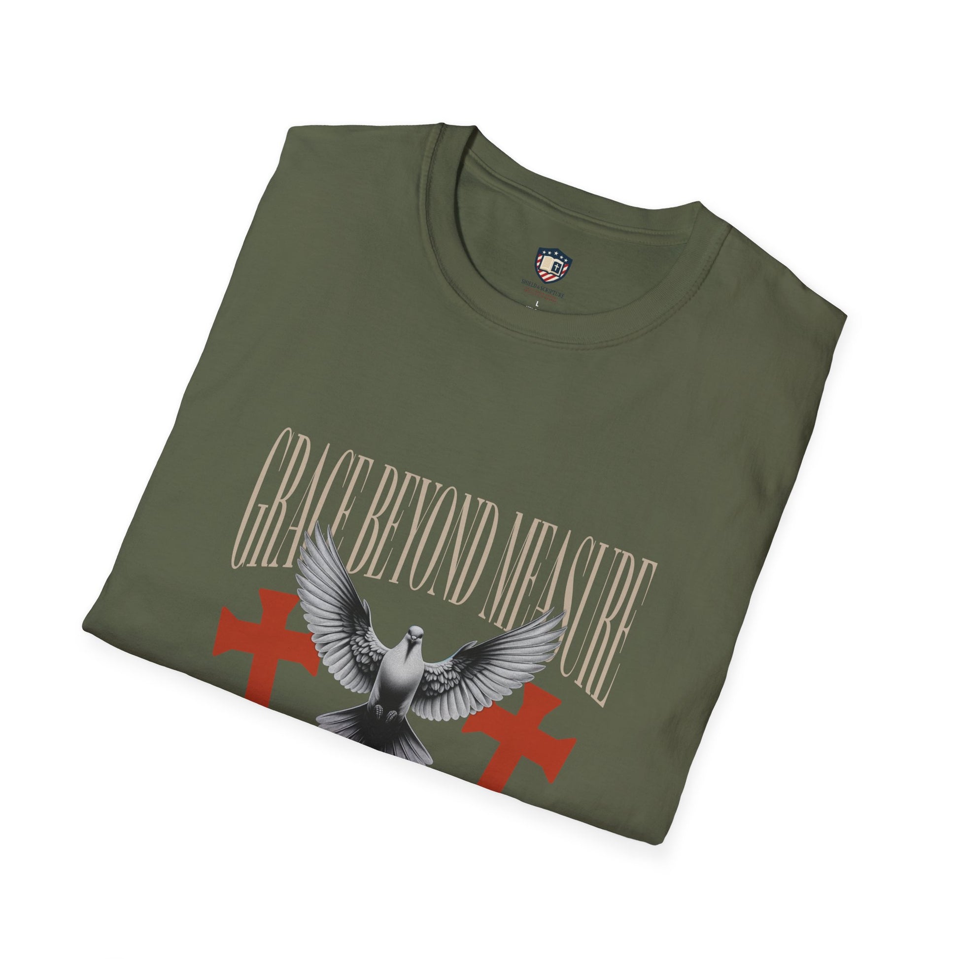 Celebrate your faith with the Grace Beyond Measure Unisex Softstyle T-Shirt , a bold expression of God’s endless love and blessings. Featuring a powerful dove and cross design alongside John 1:16, this Christian graphic tee reminds us: