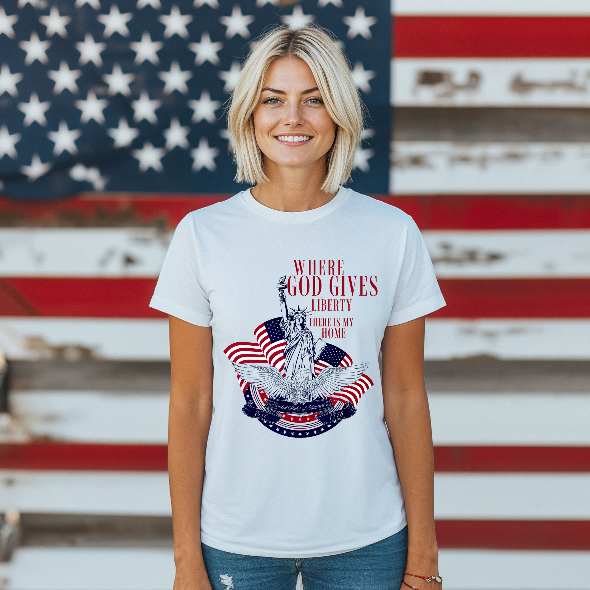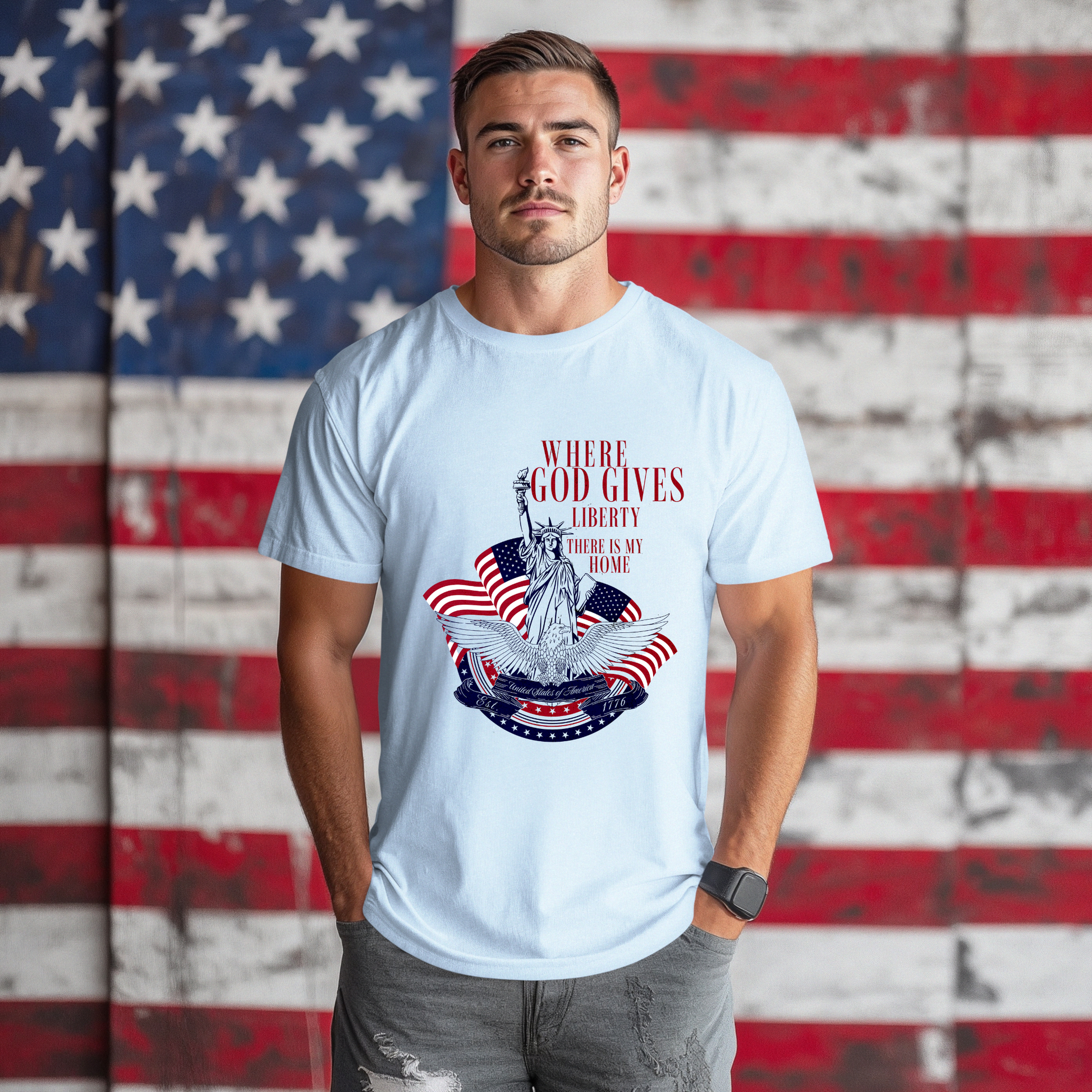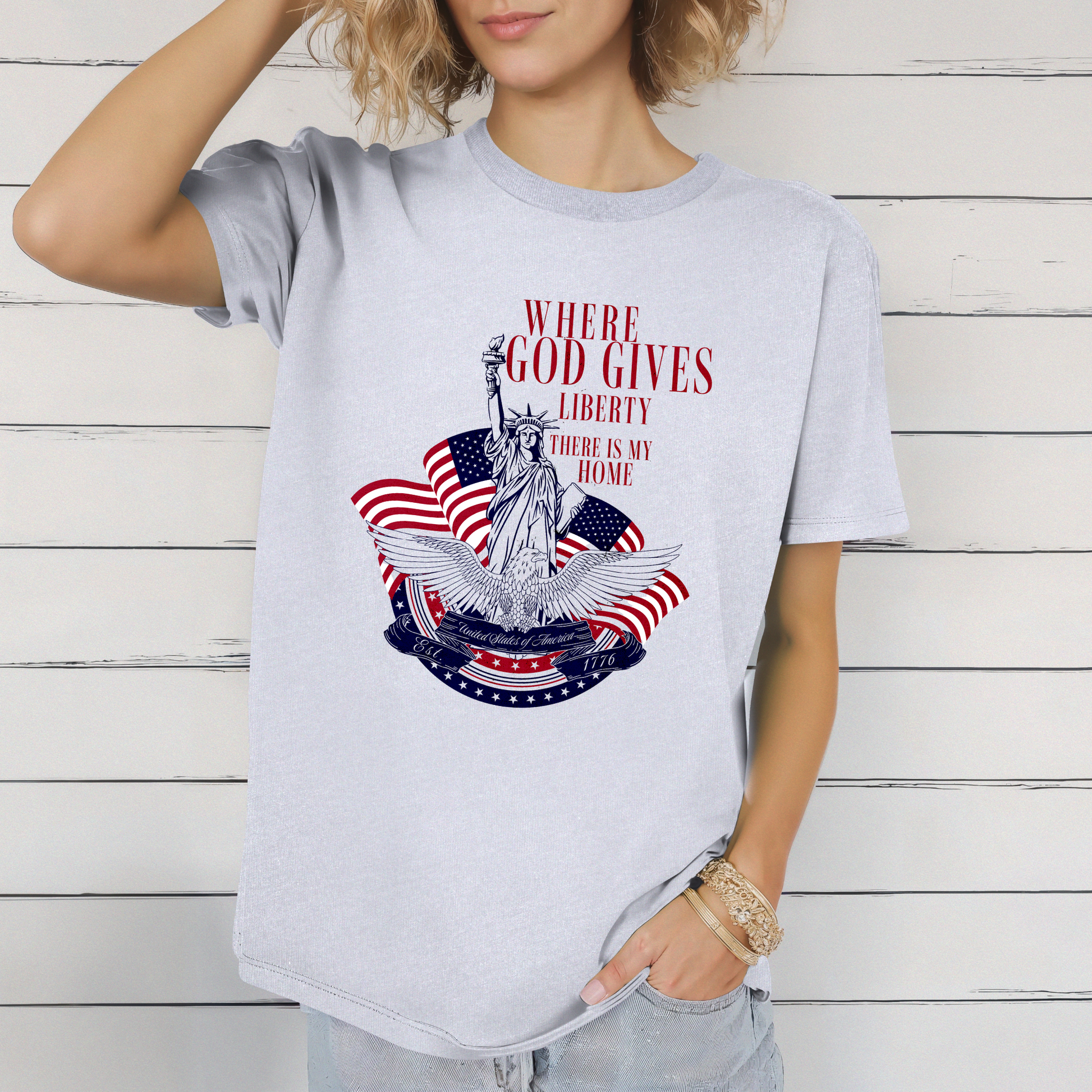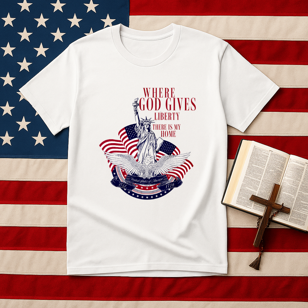 Showcase your love for both God and country with the Where God Gives Liberty, There is My Home T-Shirt. This beautifully designed shirt blends patriotic pride with Christian faith, featuring the Statue of Liberty, a soaring eagle, and the American flag as a bold backdrop.