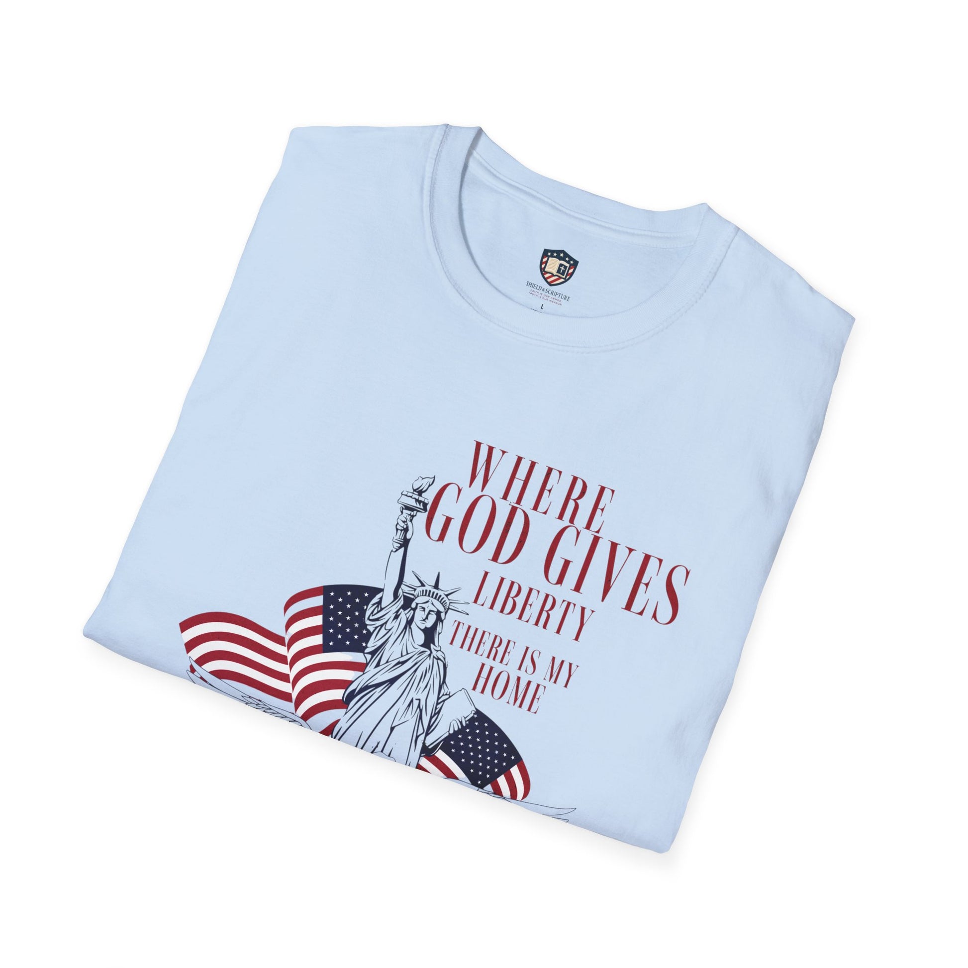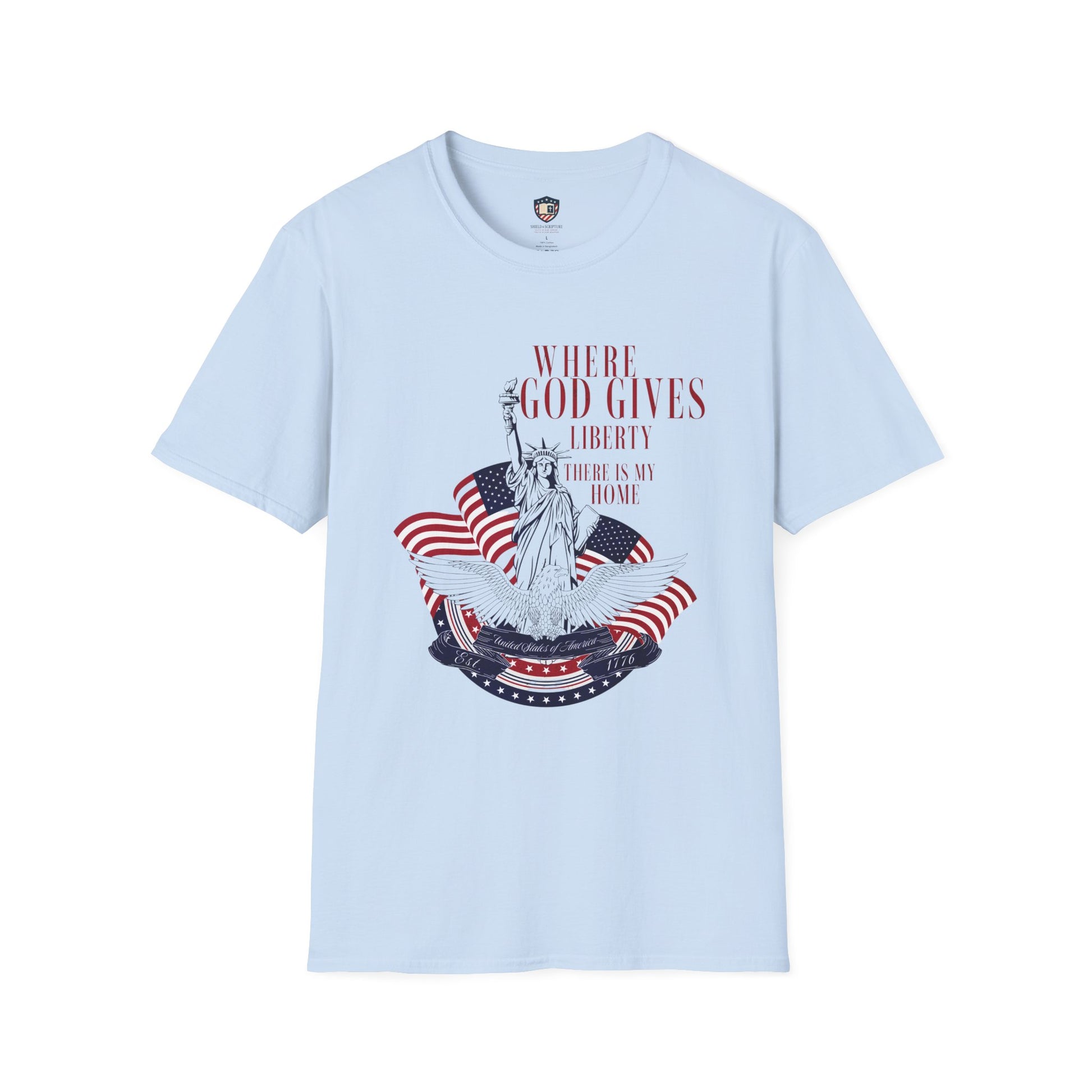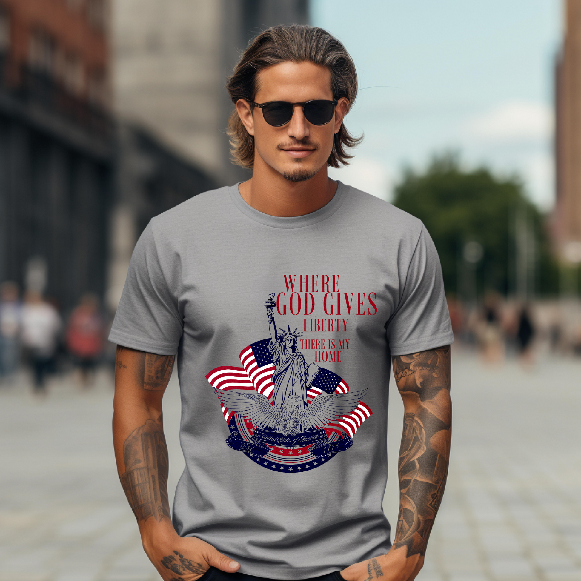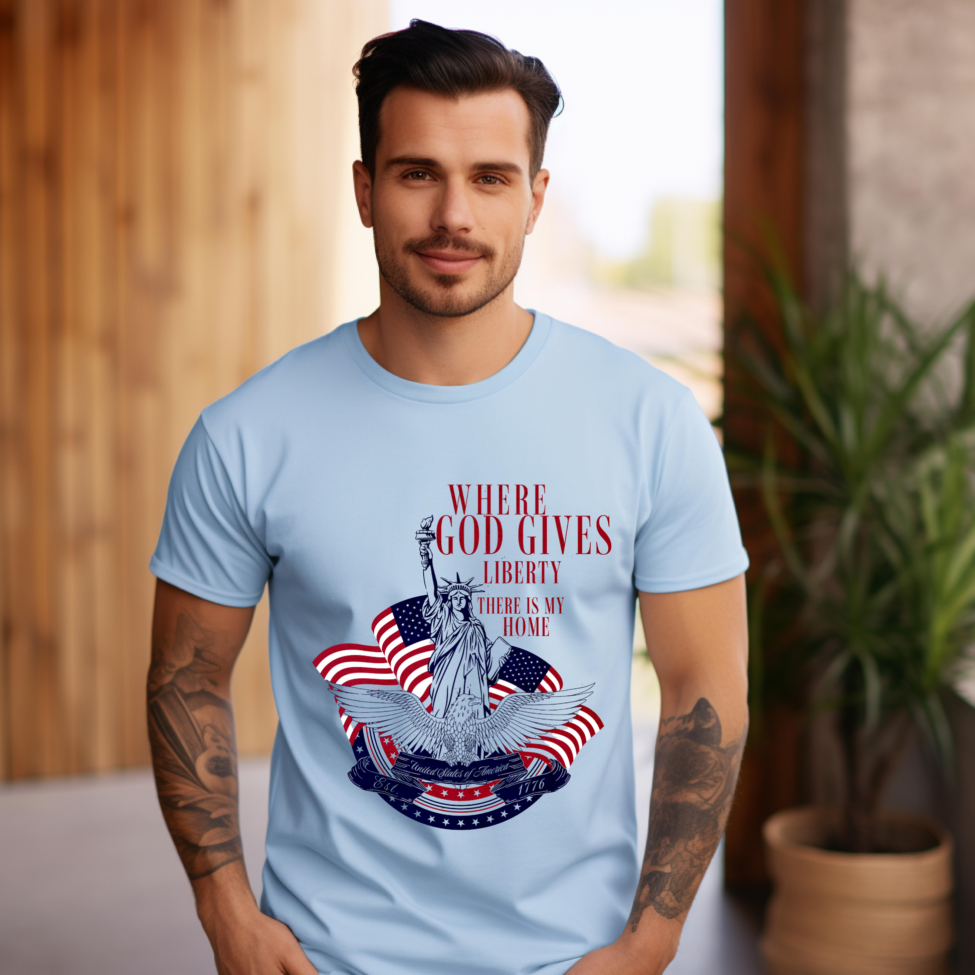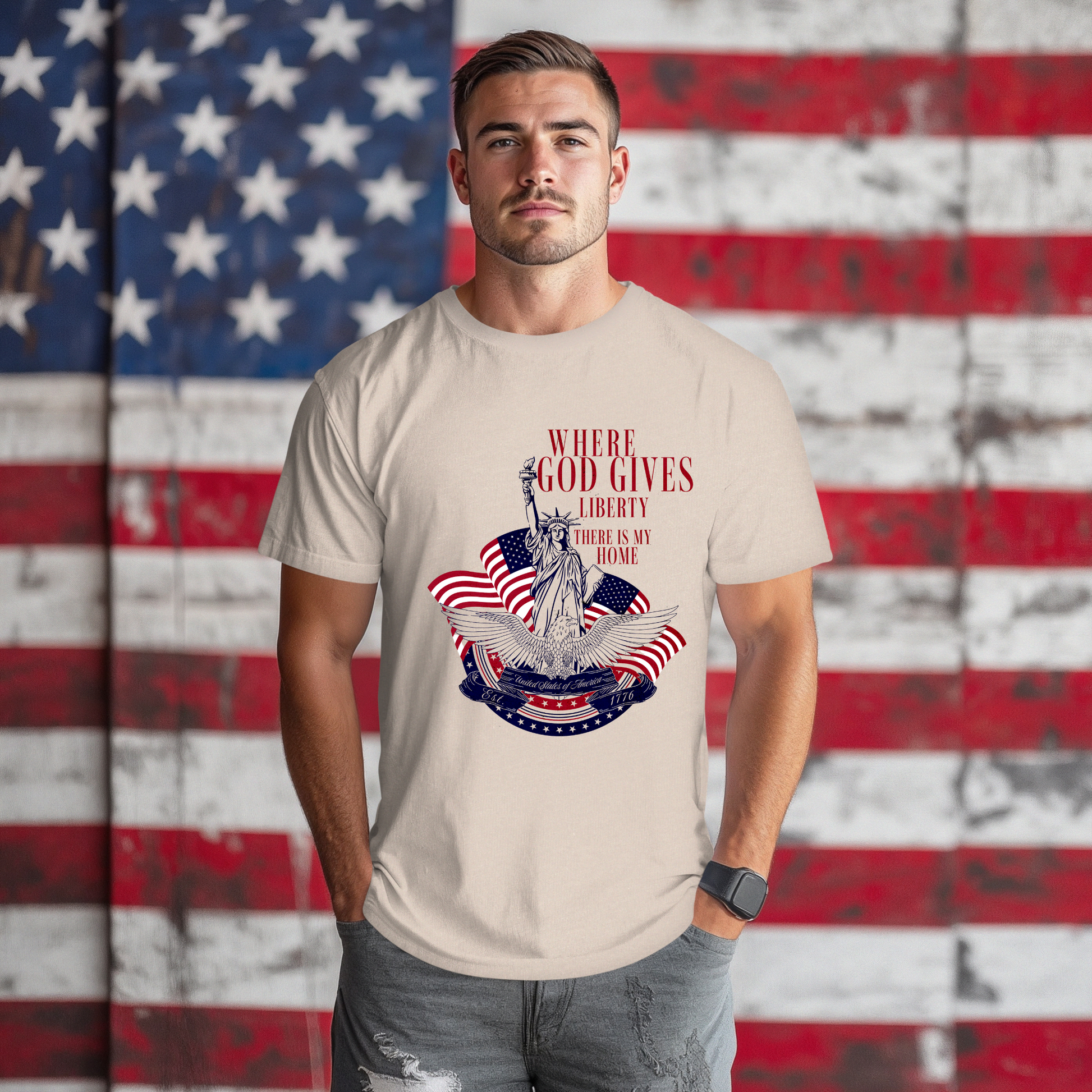 Showcase your love for both God and country with the Where God Gives Liberty, There is My Home T-Shirt. This beautifully designed shirt blends patriotic pride with Christian faith, featuring the Statue of Liberty, a soaring eagle, and the American flag as a bold backdrop.