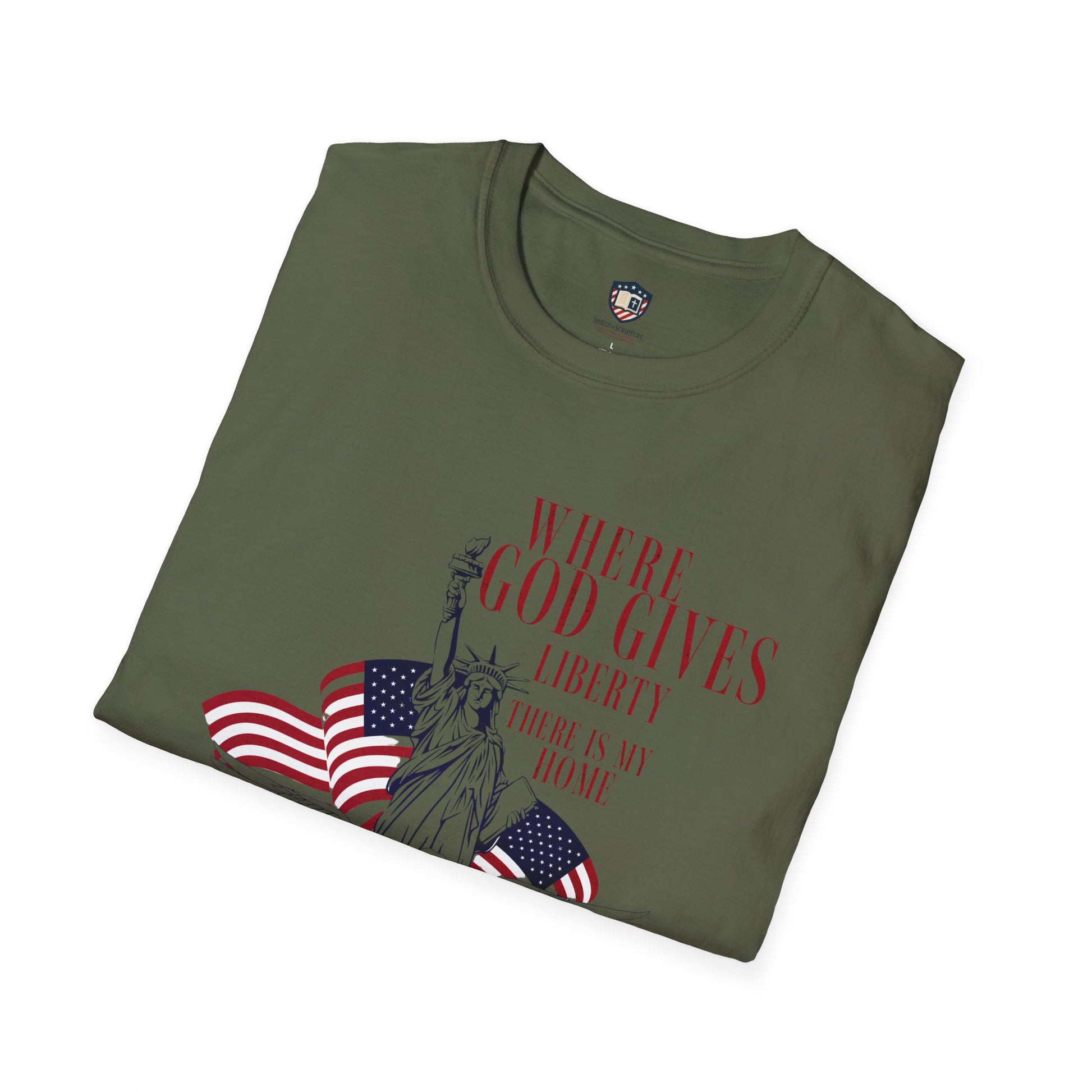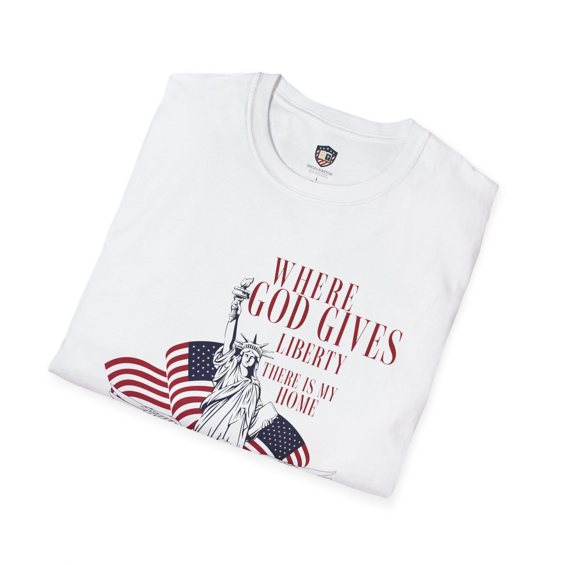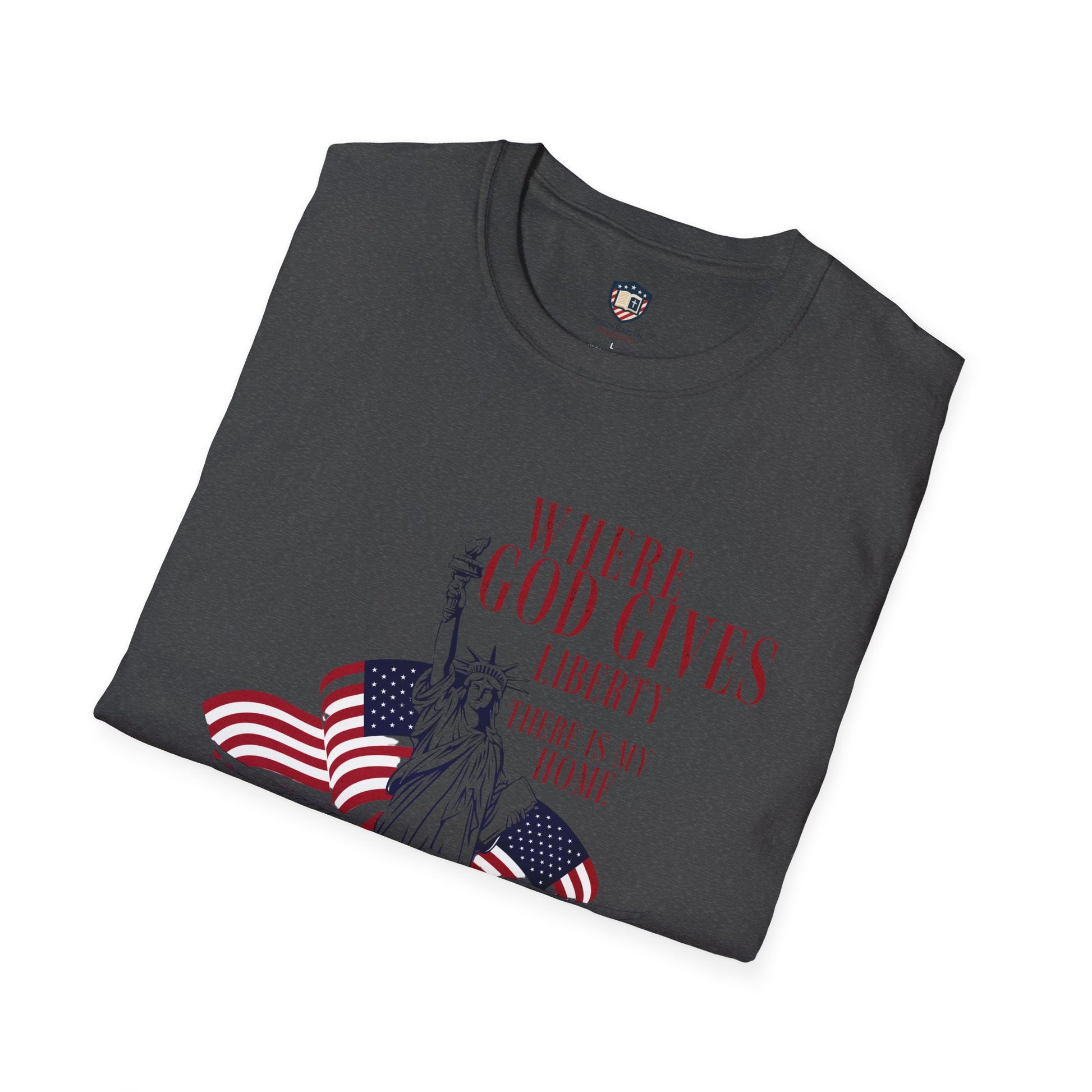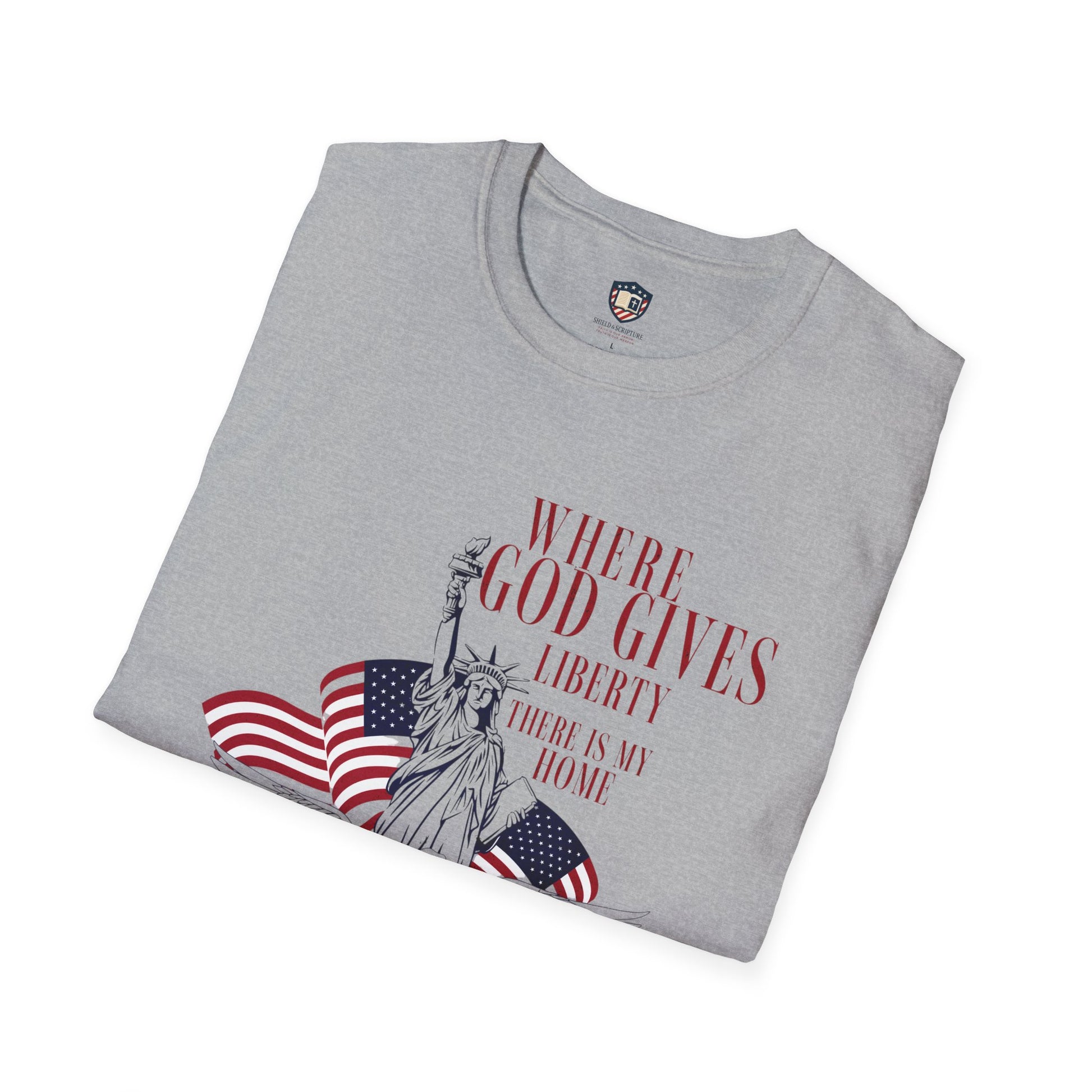 Showcase your love for both God and country with the Where God Gives Liberty, There is My Home T-Shirt. This beautifully designed shirt blends patriotic pride with Christian faith, featuring the Statue of Liberty, a soaring eagle, and the American flag as a bold backdrop.