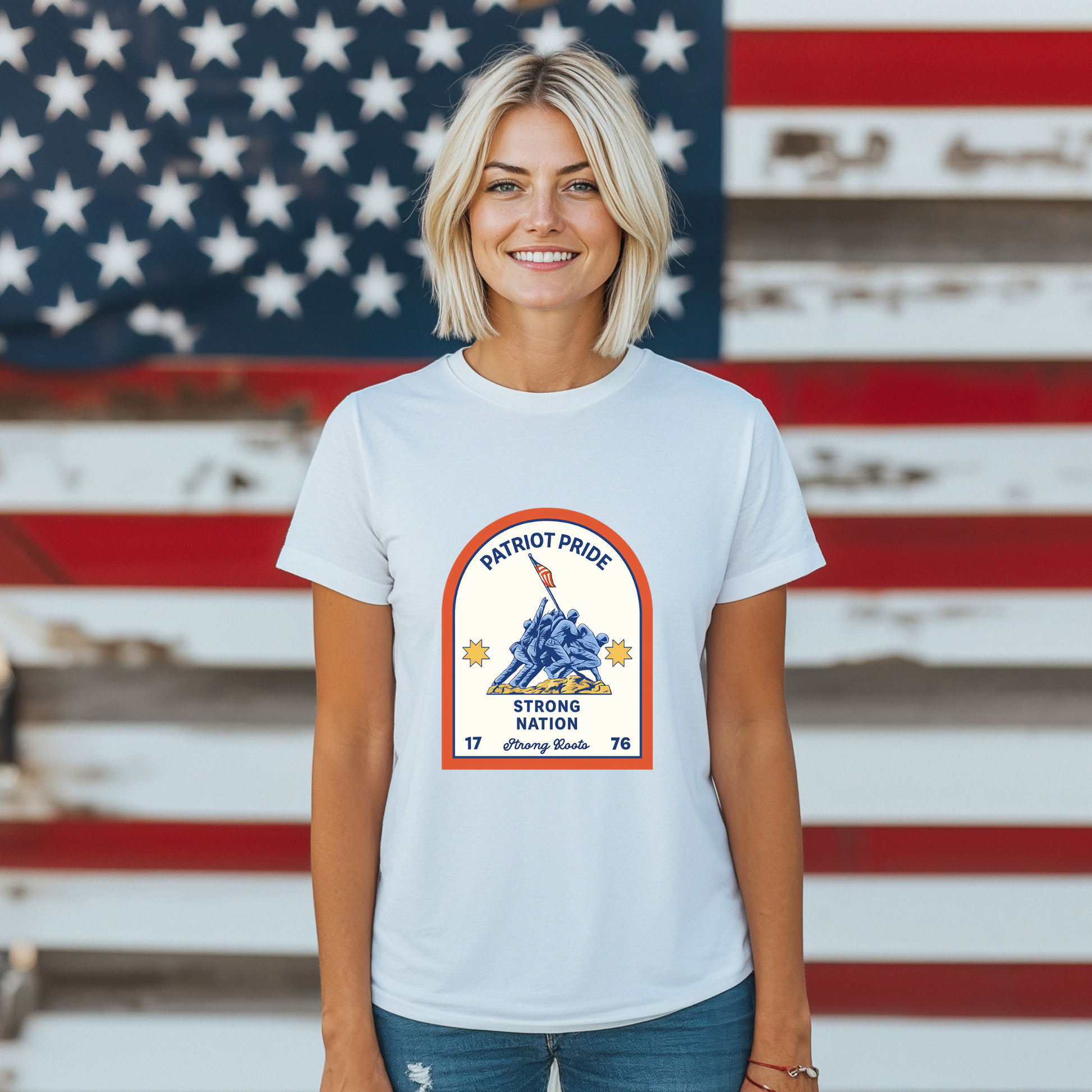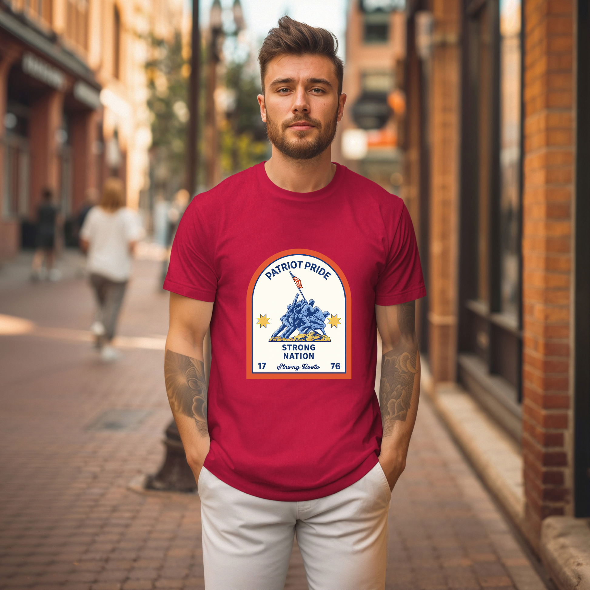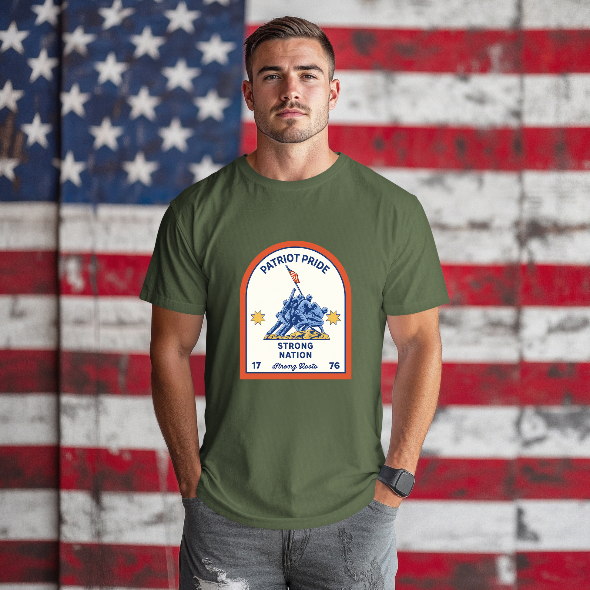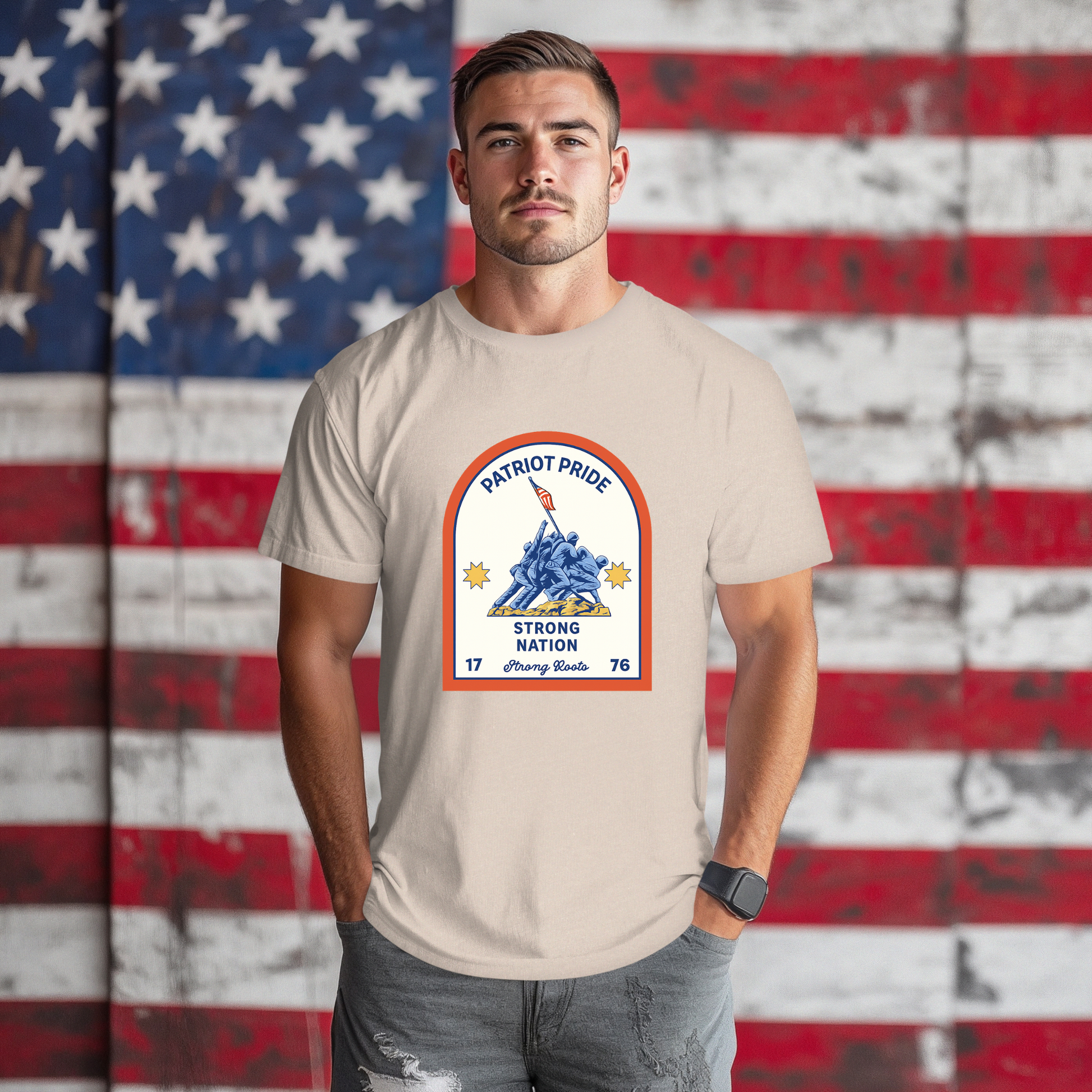 Show off your American spirit with the Patriot Pride Strong Nation T-Shirt. Featuring a bold graphic inspired by the iconic flag-raising image, this design proudly displays the words: