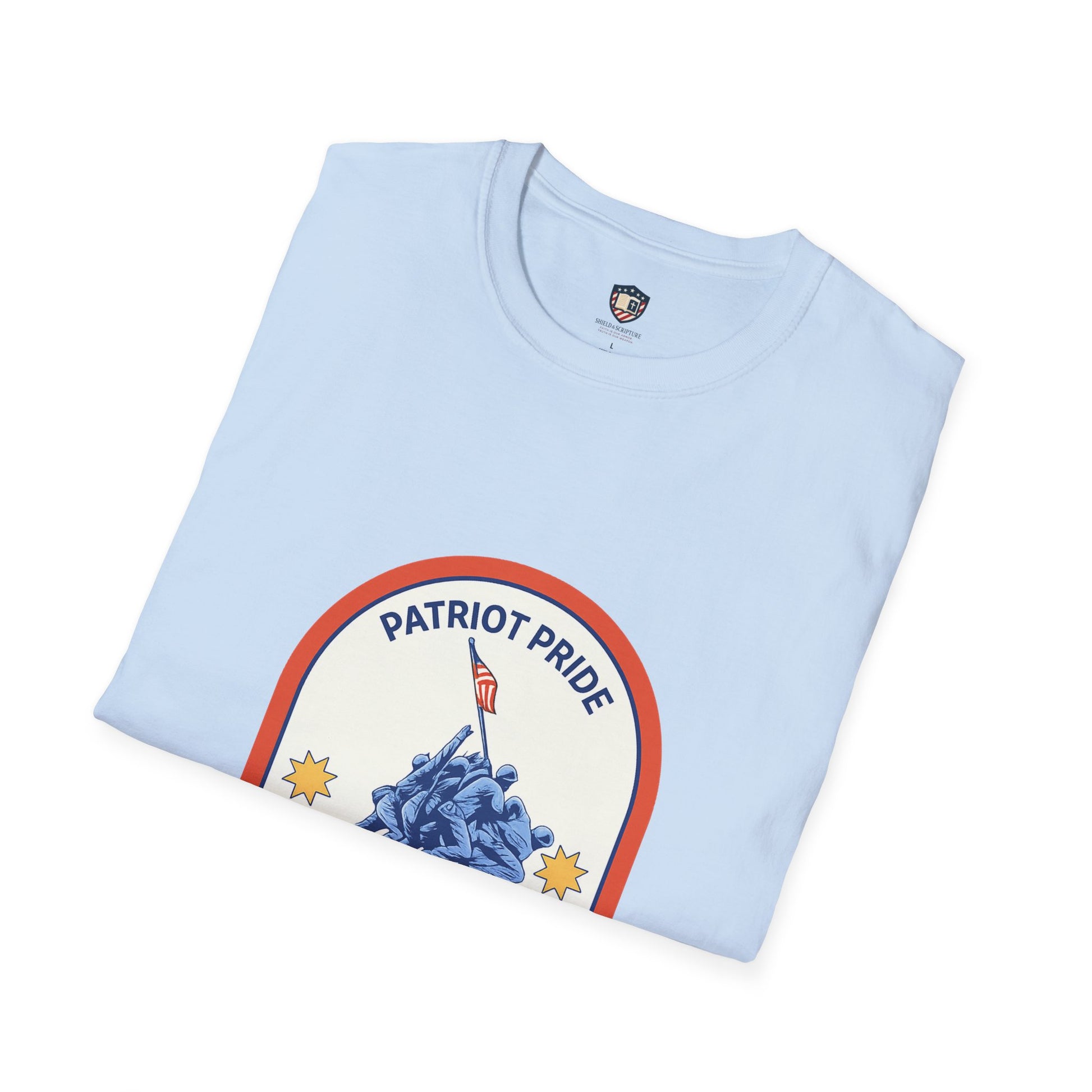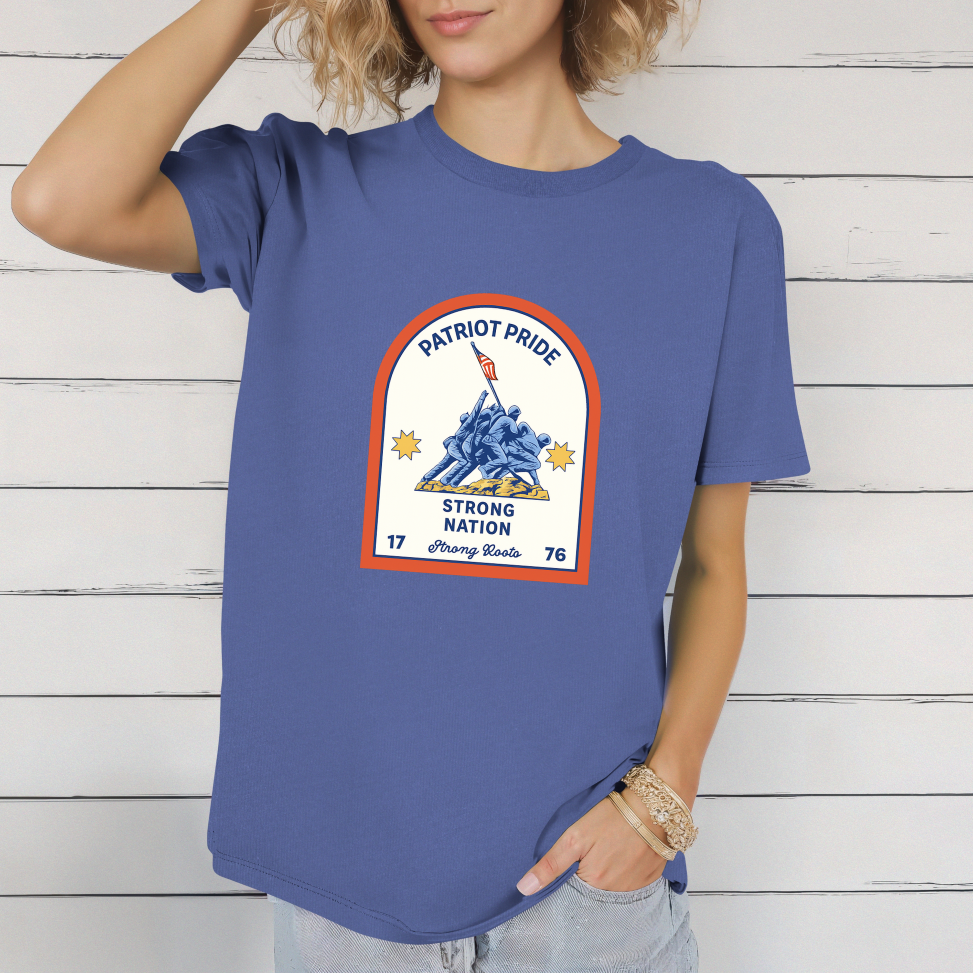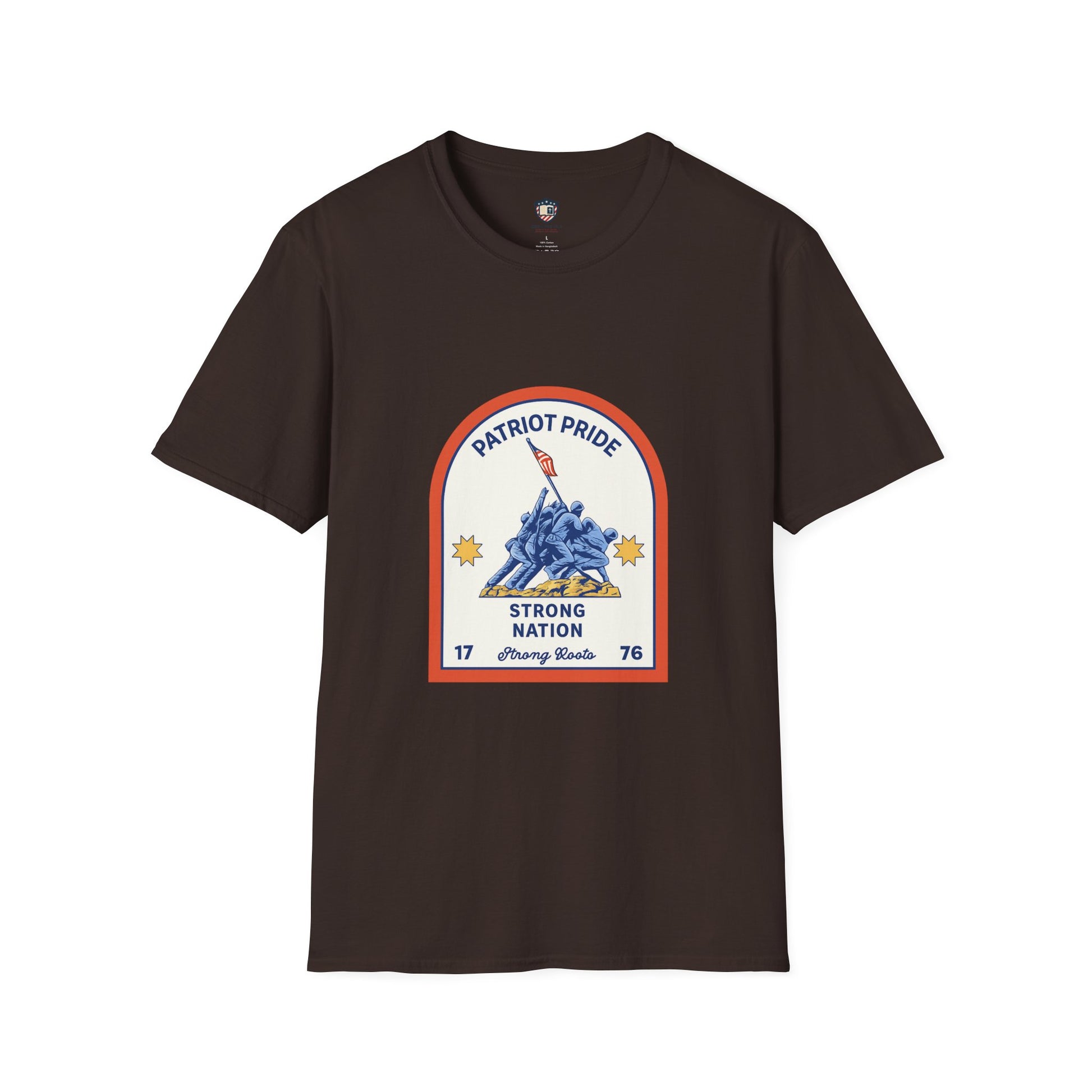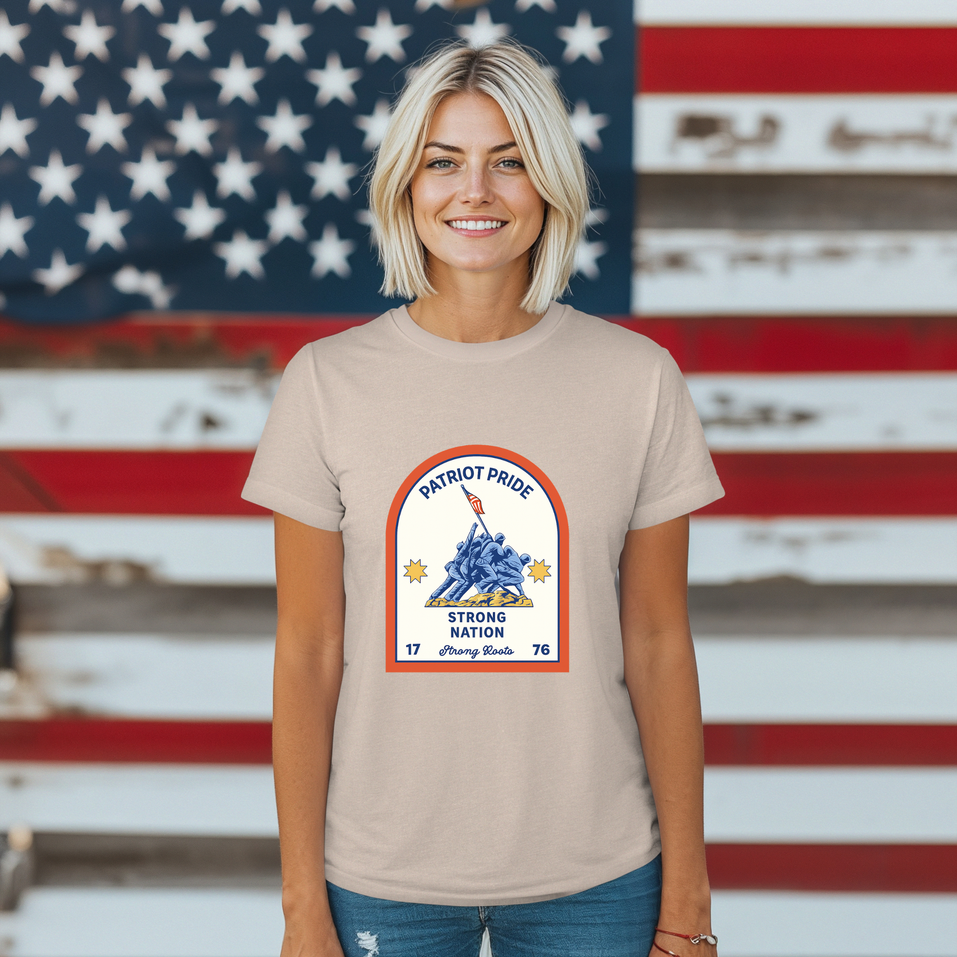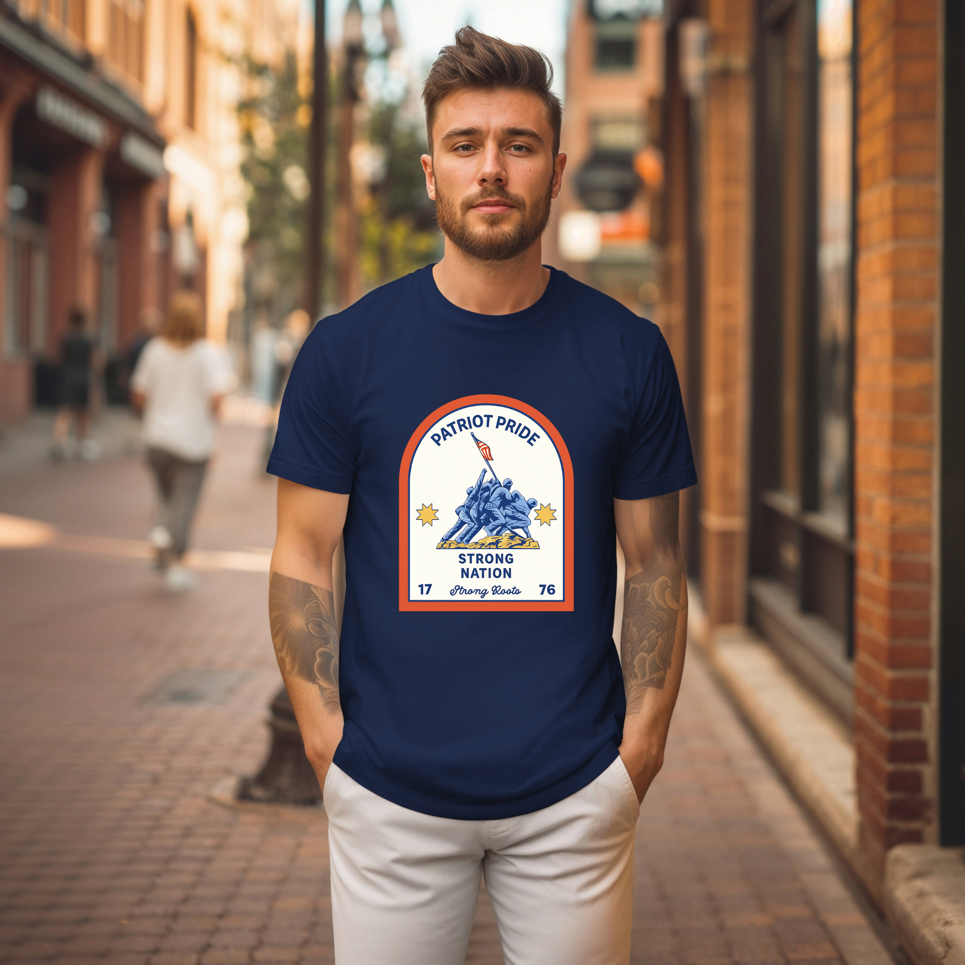 Show off your American spirit with the Patriot Pride Strong Nation T-Shirt. Featuring a bold graphic inspired by the iconic flag-raising image, this design proudly displays the words: