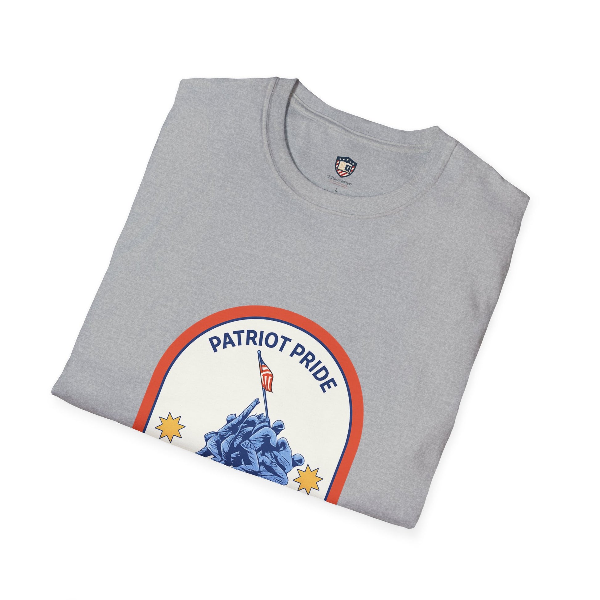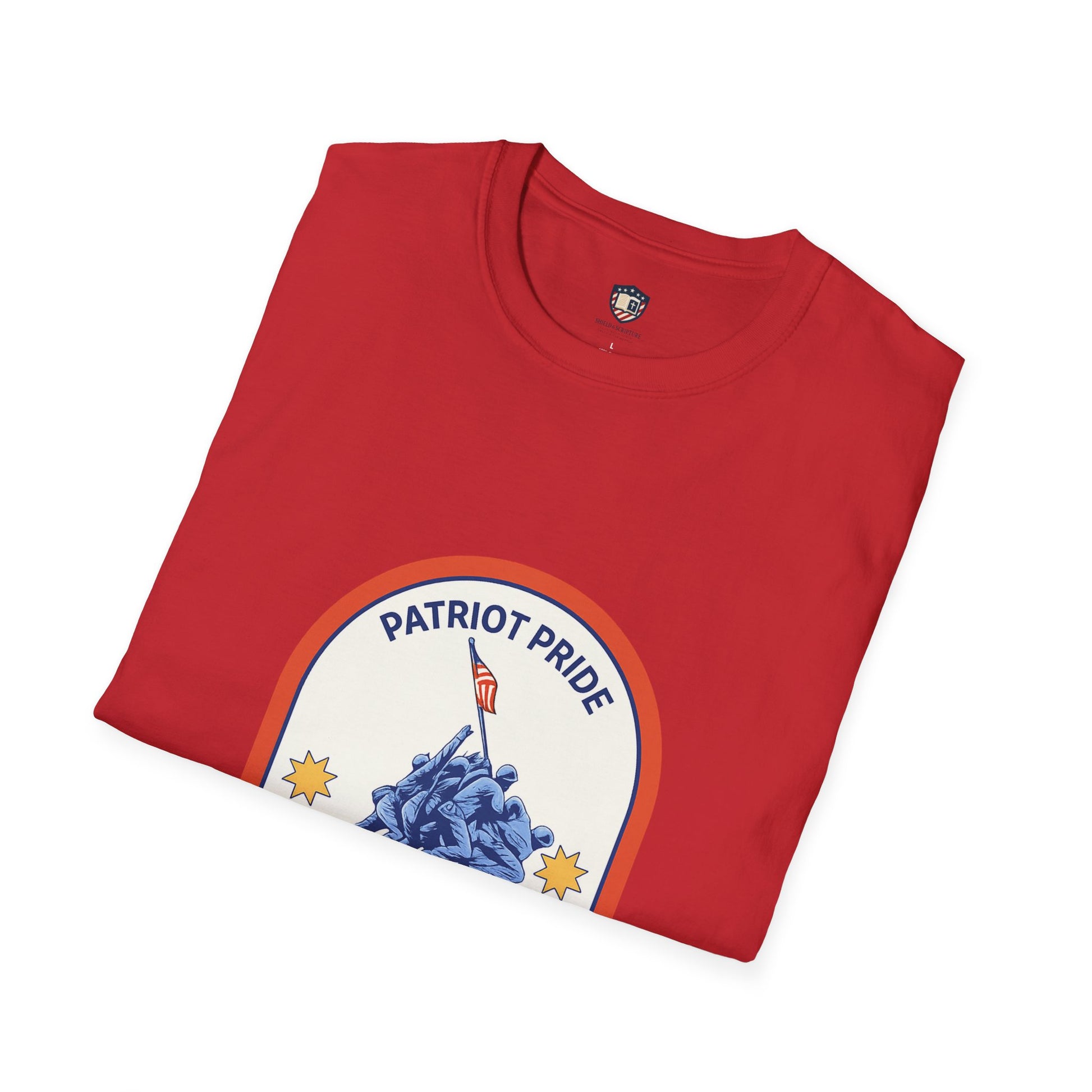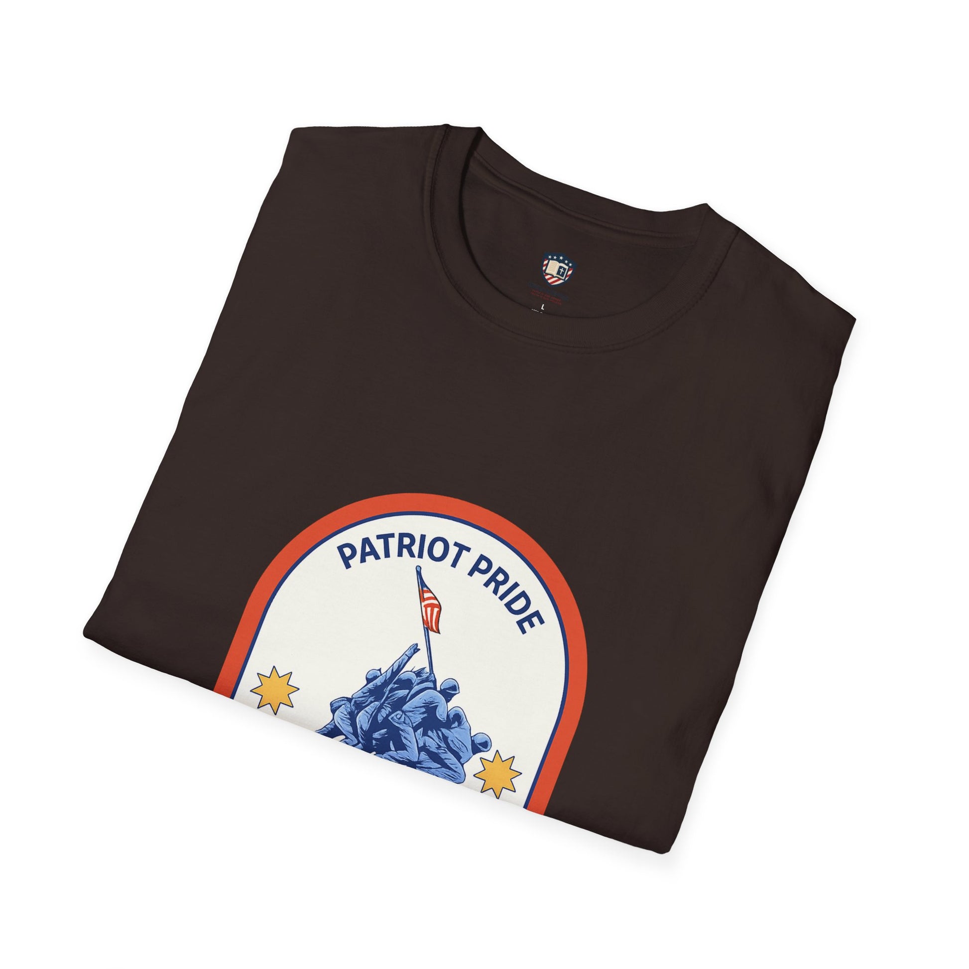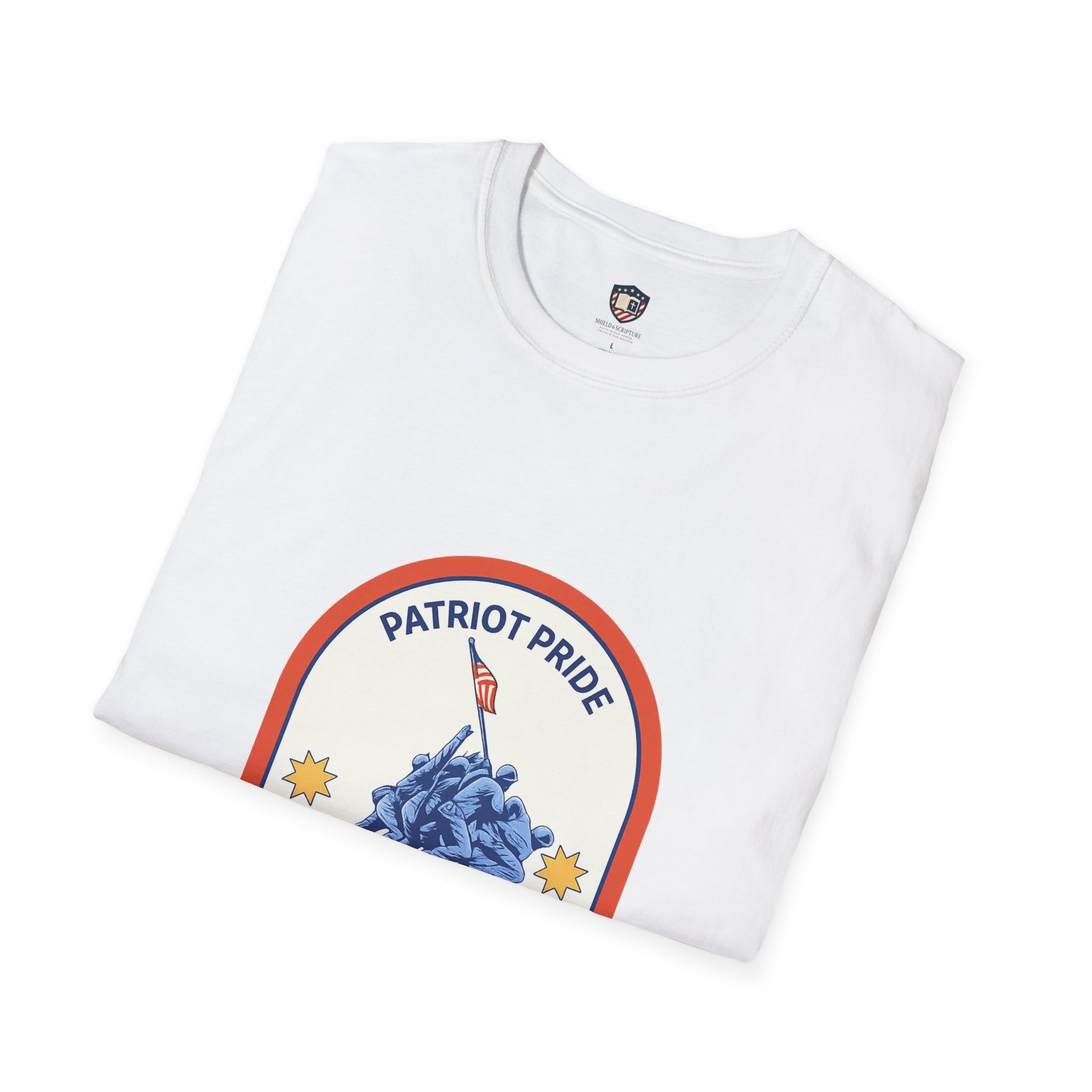 Show off your American spirit with the Patriot Pride Strong Nation T-Shirt. Featuring a bold graphic inspired by the iconic flag-raising image, this design proudly displays the words: